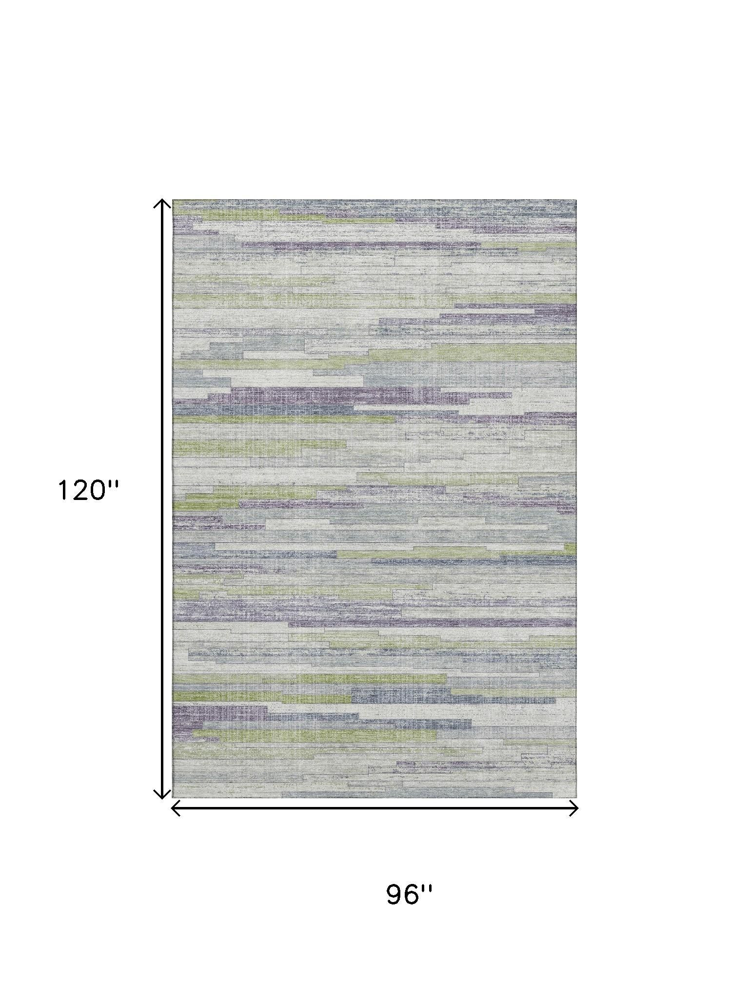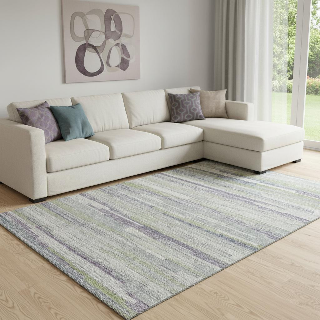 Set an inviting tone in your space with this 8-foot x 10-foot artichoke green ivory and plum striped washable area rug with uv protection. Ideal for spaces with kids and pets, this rug is stain resistant to help repel dirt and spilled liquids. Built to last, this rug crafted from polyester fibers is known for its durability and long lasting appeal. Rugs are a great way to showcase your style, hide imperfections, warm your home and reduce noise. This larger sized, transitional styled rug is ready to create a focal point or statement piece in your room. 96.00-inch h x 120.00-inch w x 0.39-inch d.