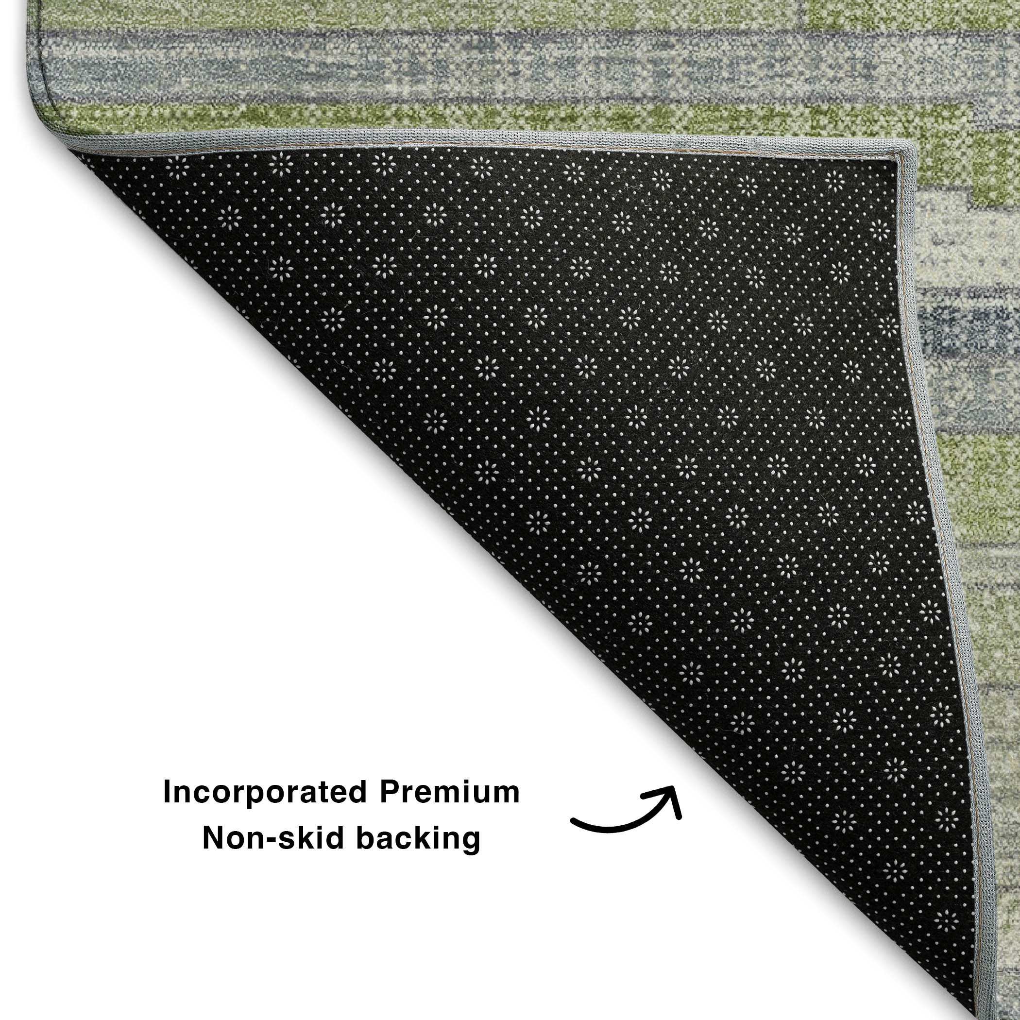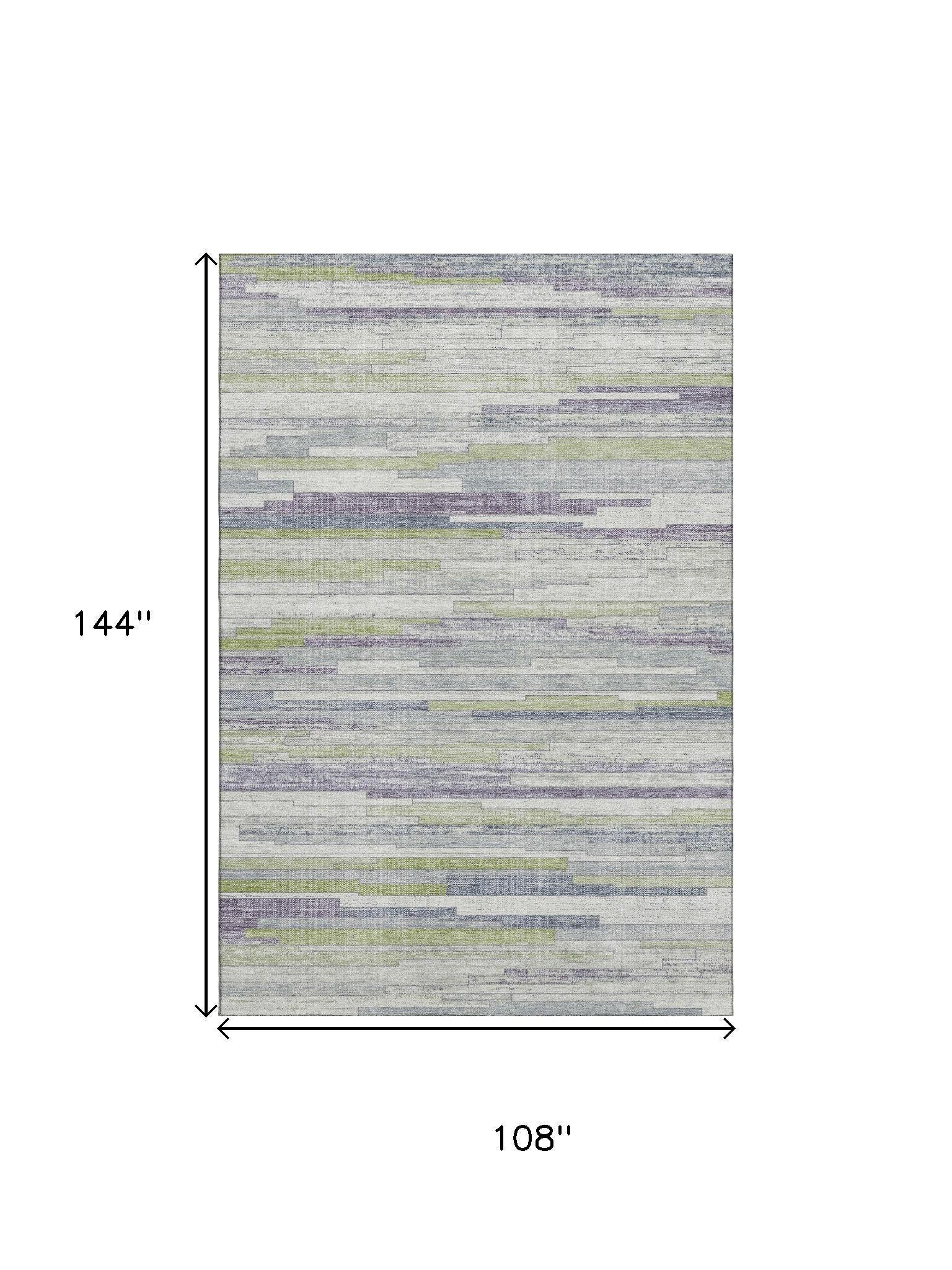 Add some artistry to your room with this 9-foot x 12-foot artichoke green ivory and plum striped washable area rug with uv protection. Ideal for spaces with kids and pets, this rug is stain resistant to help repel dirt and spilled liquids. Built to last, this rug crafted from polyester fibers is known for its durability and long lasting appeal. Rugs are a great way to showcase your style, hide imperfections, warm your home and reduce noise. This larger sized, transitional styled rug is ready to create a focal point or statement piece in your room. 108.00-inch h x 144.00-inch w x 0.39-inch d.
