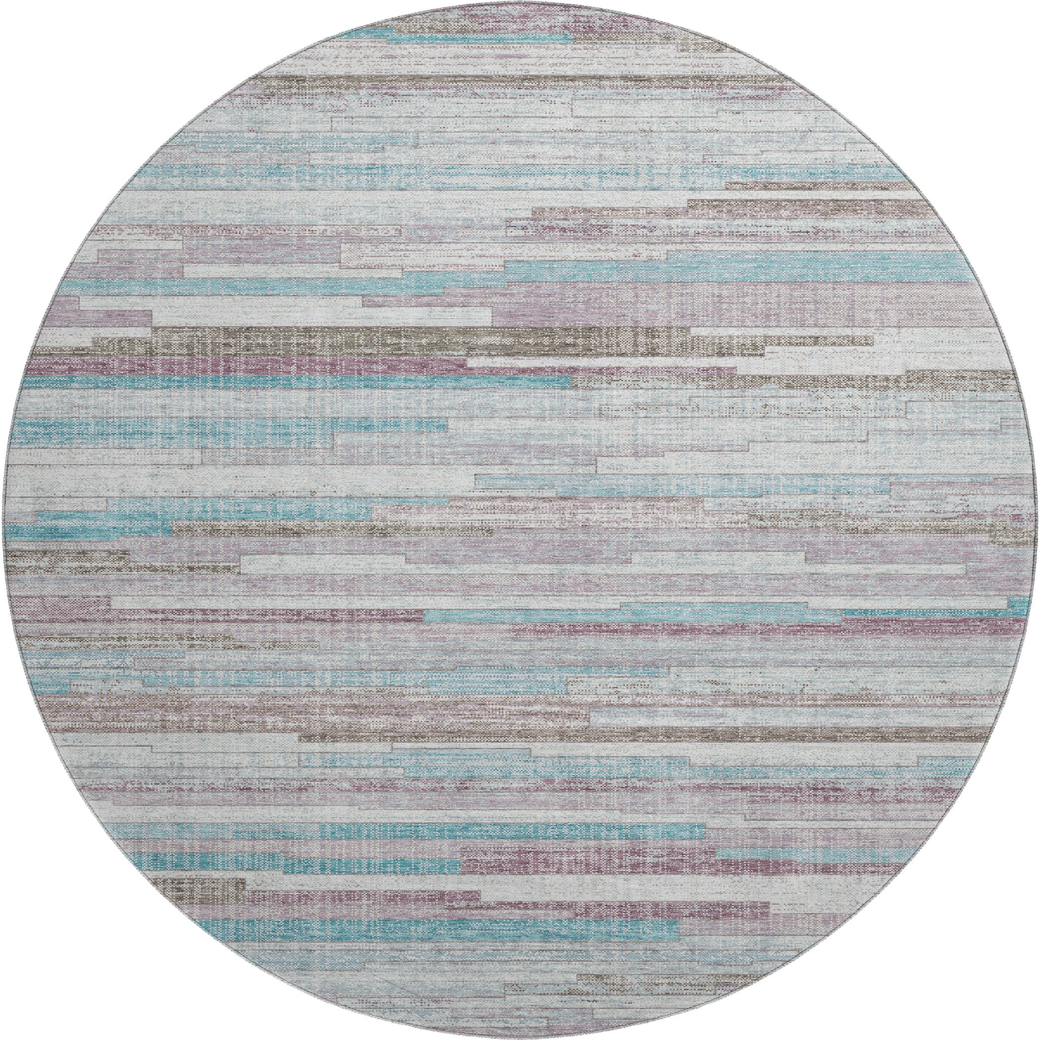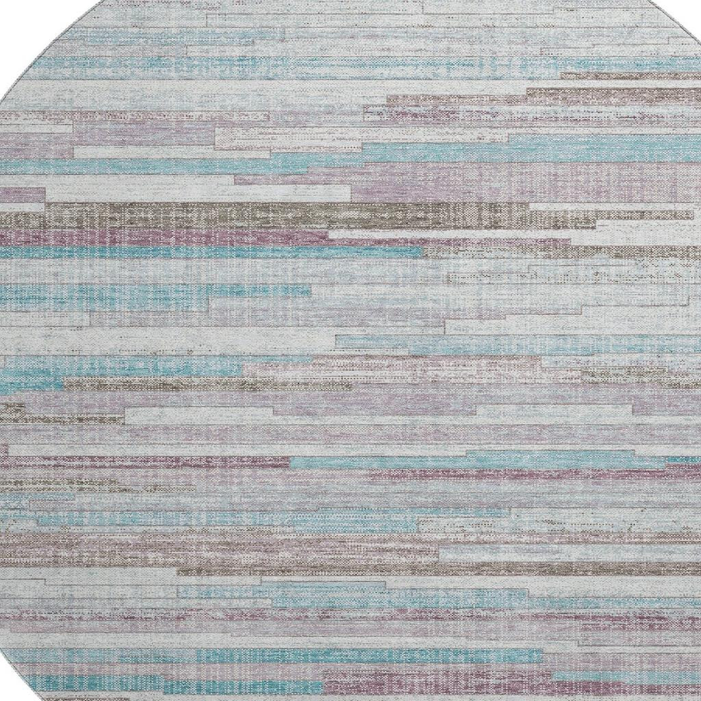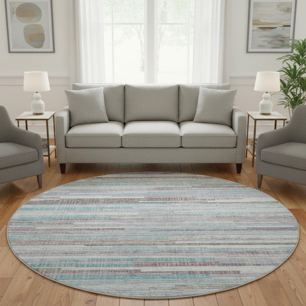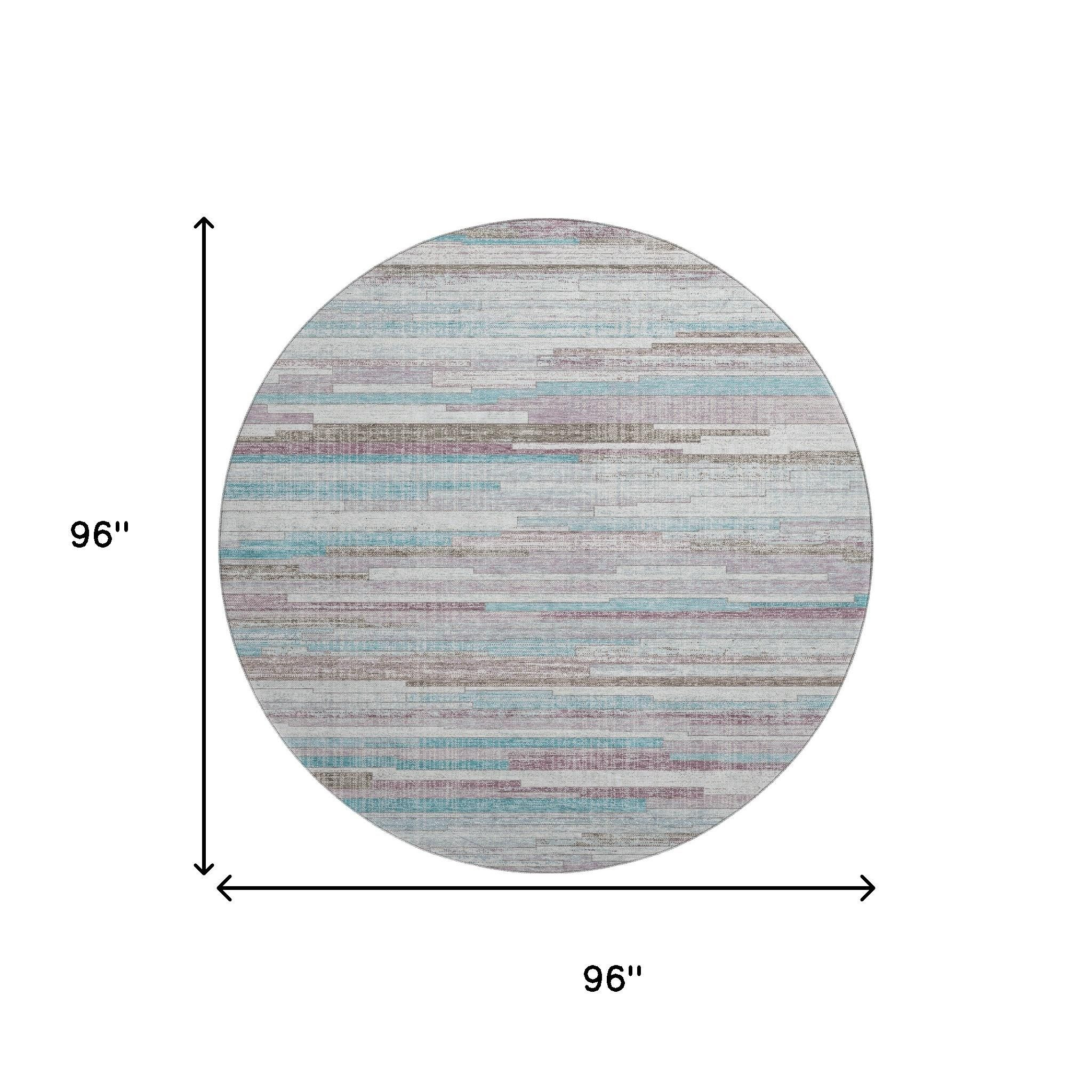 This 8-foot teal beige and ivory striped washable round rug with uv protection, is a great way to add warmth to a room. Ideal for spaces with kids and pets, this rug is stain resistant to help repel dirt and spilled liquids. Built to last, this rug crafted from polyester fibers is known for its durability and long lasting appeal. Rugs are a great way to showcase your style, hide imperfections, warm your home and reduce noise. This larger sized, transitional styled rug is ready to create a focal point or statement piece in your room. 96.00-inch h x 96.00-inch w x 0.39-inch d.