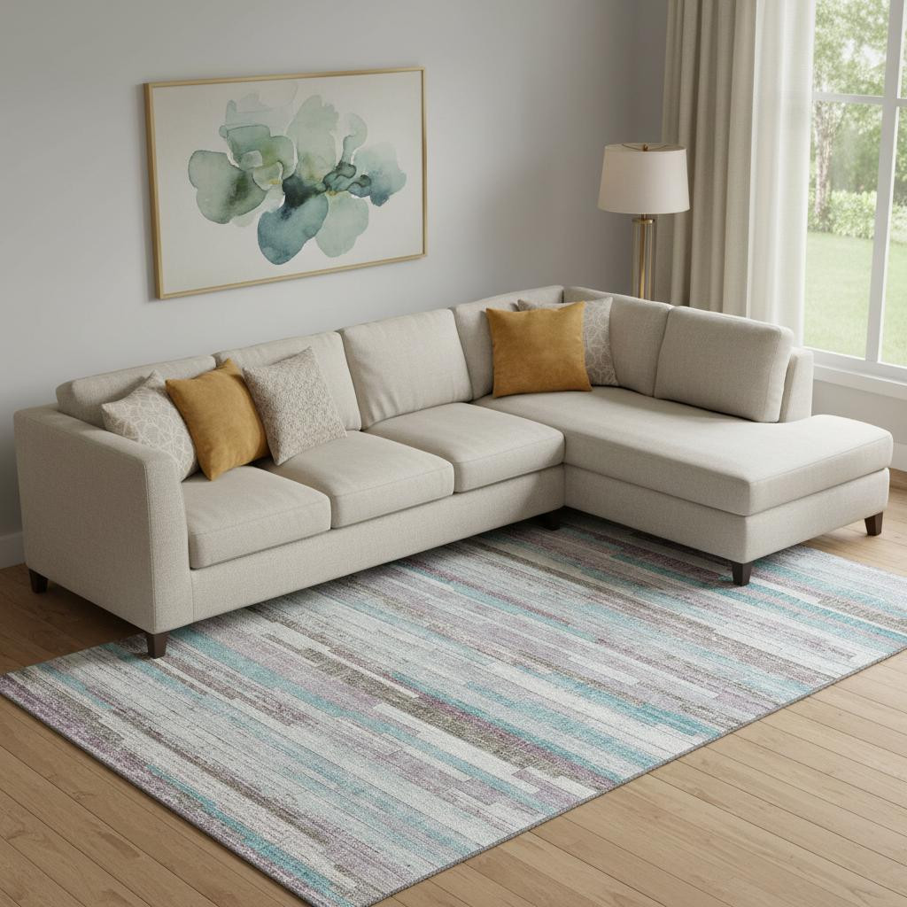 Add great coloration and comfortable texture to your space with this 9-foot x 12-foot teal beige and ivory striped washable area rug with uv protection. Ideal for spaces with kids and pets, this rug is stain resistant to help repel dirt and spilled liquids. Built to last, this rug crafted from polyester fibers is known for its durability and long lasting appeal. Rugs are a great way to showcase your style, hide imperfections, warm your home and reduce noise. This larger sized, transitional styled rug is ready to create a focal point or statement piece in your room. 108.00-inch h x 144.00-inch w x 0.39-inch d.