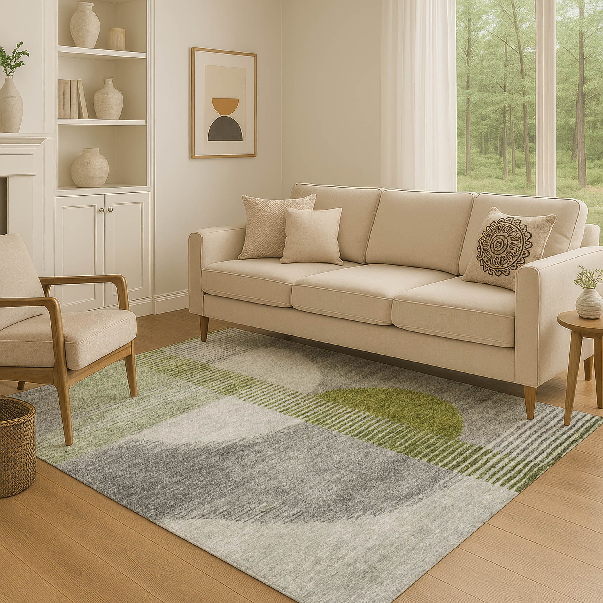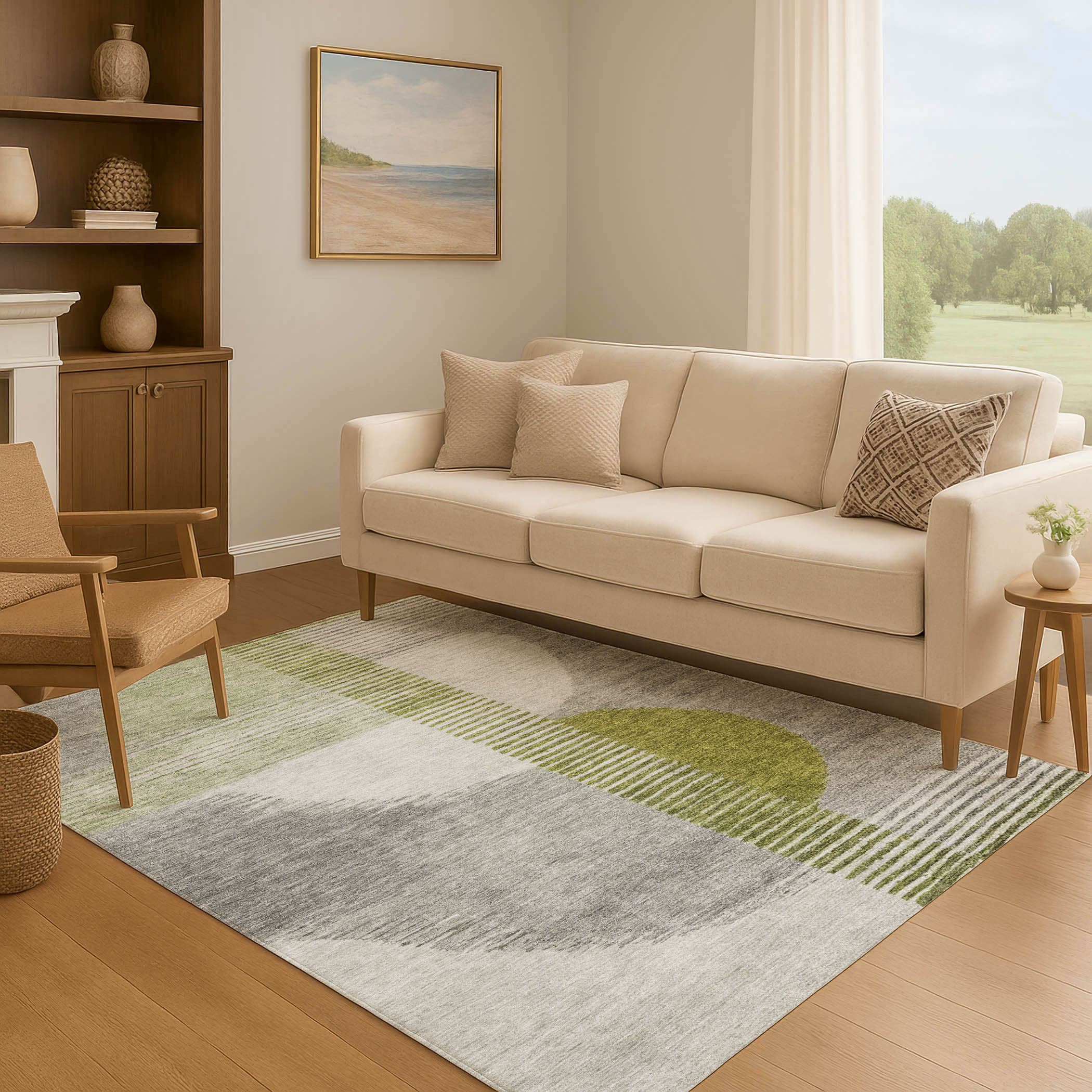 Set an inviting tone in your space with this 3-foot x 5-foot olive green gray and ivory geometric washable area rug with uv protection. Ideal for spaces with kids and pets, this rug is stain resistant to help repel dirt and spilled liquids. Built to last, this rug crafted from polyester fibers is known for its durability and long lasting appeal. Rugs are a great way to showcase your style, hide imperfections, warm your home and reduce noise. This smaller sized, transitional styled rug is just what you need for your walkway, bedside, in front of door, cabinet, refrigerator, or chair. 36.00-inch h x 60.00-inch w x 0.39-inch d.