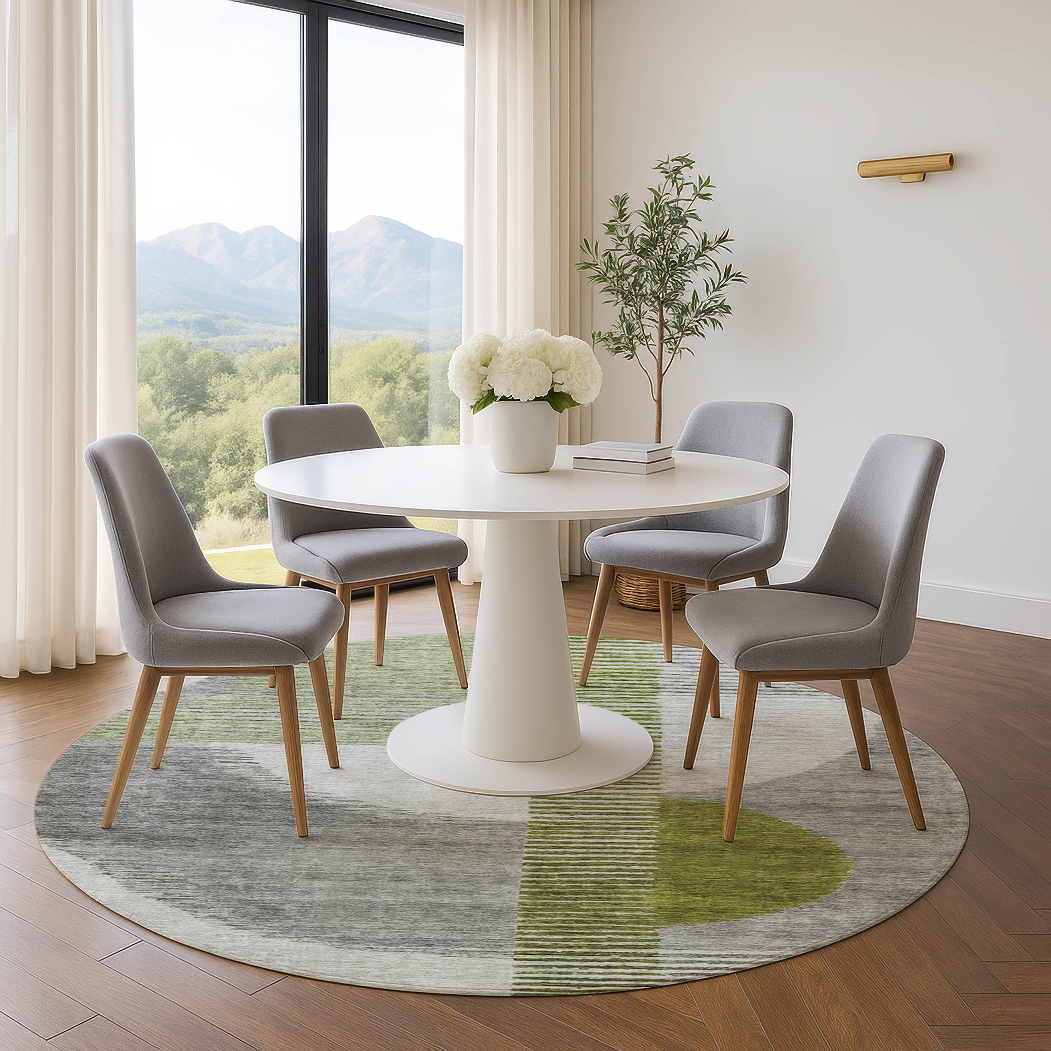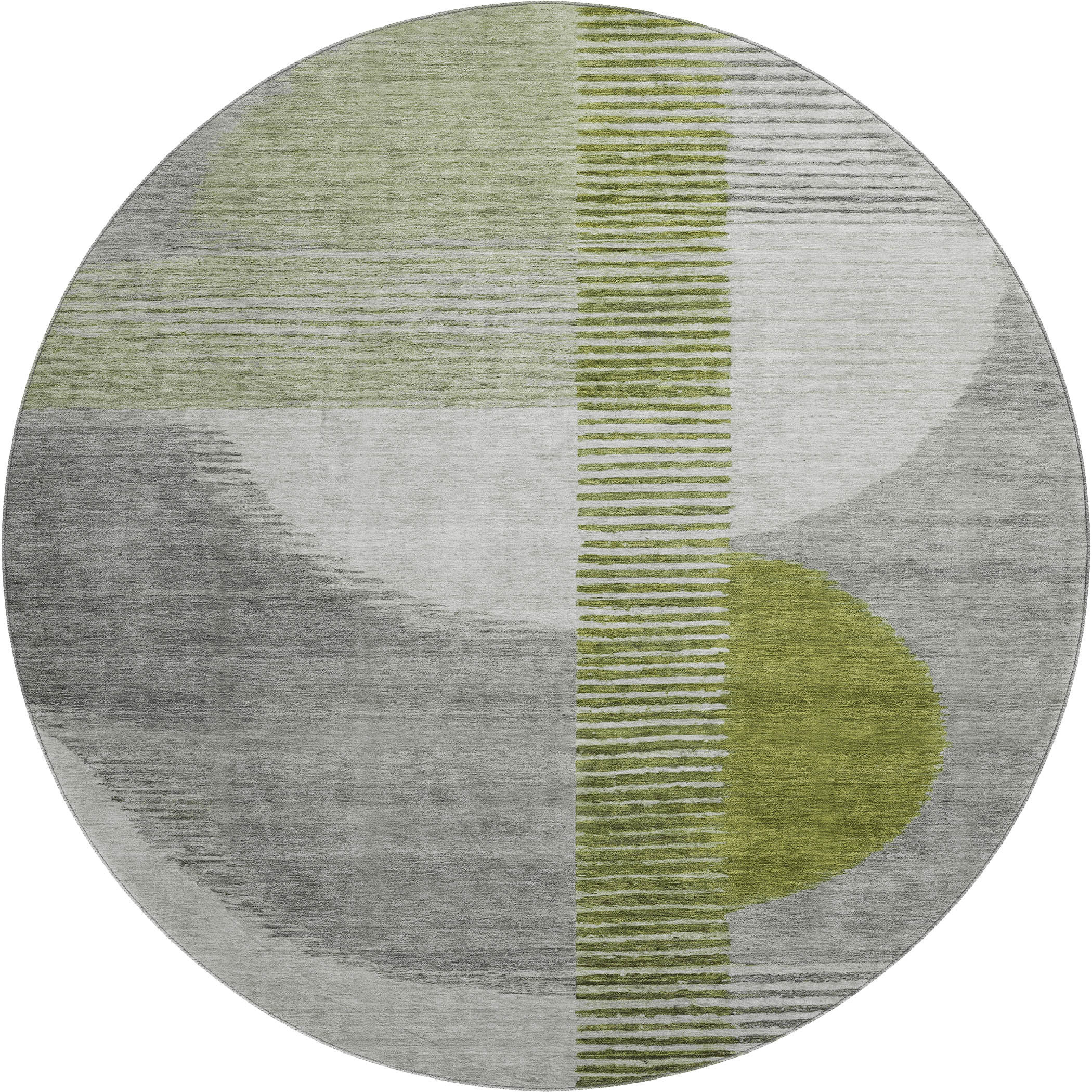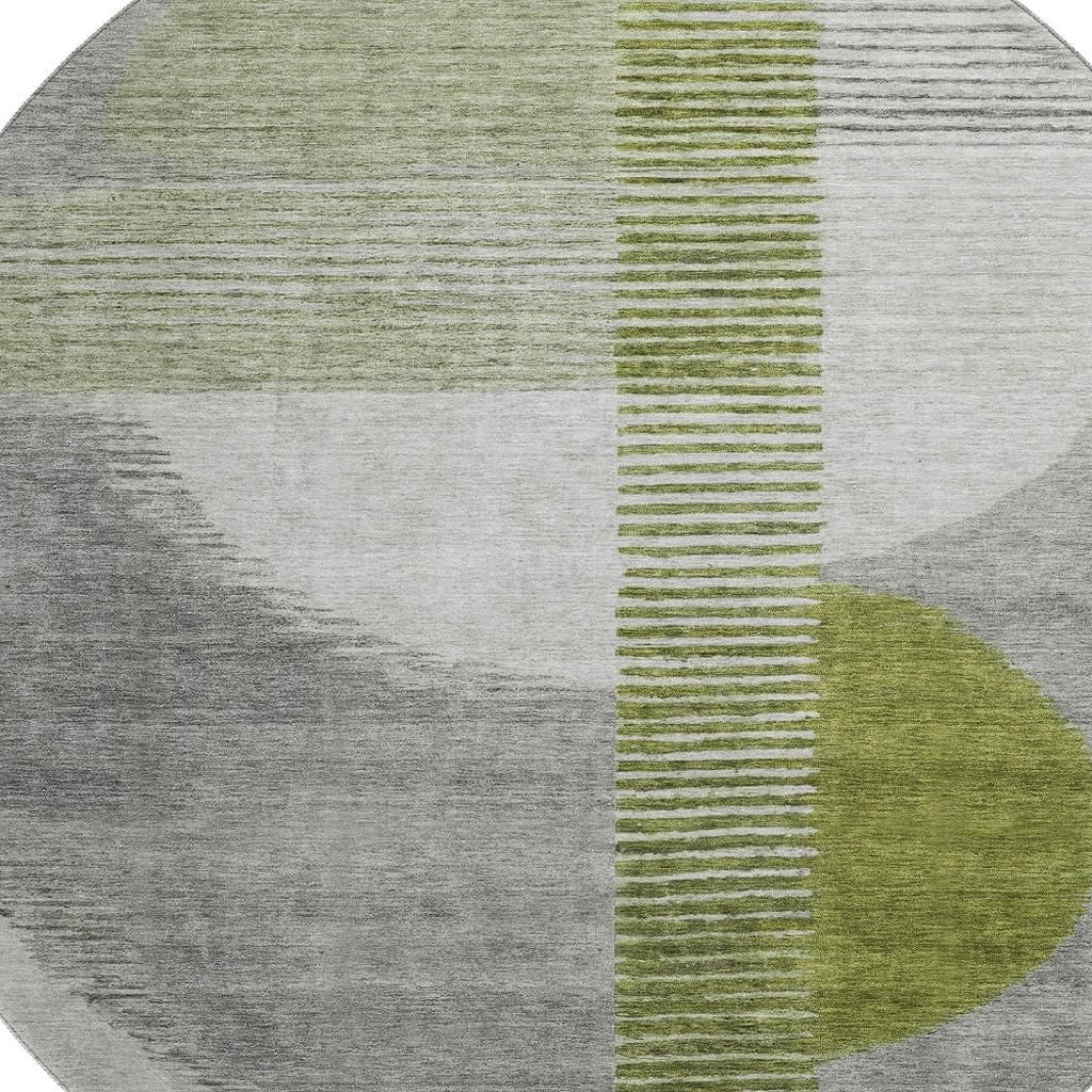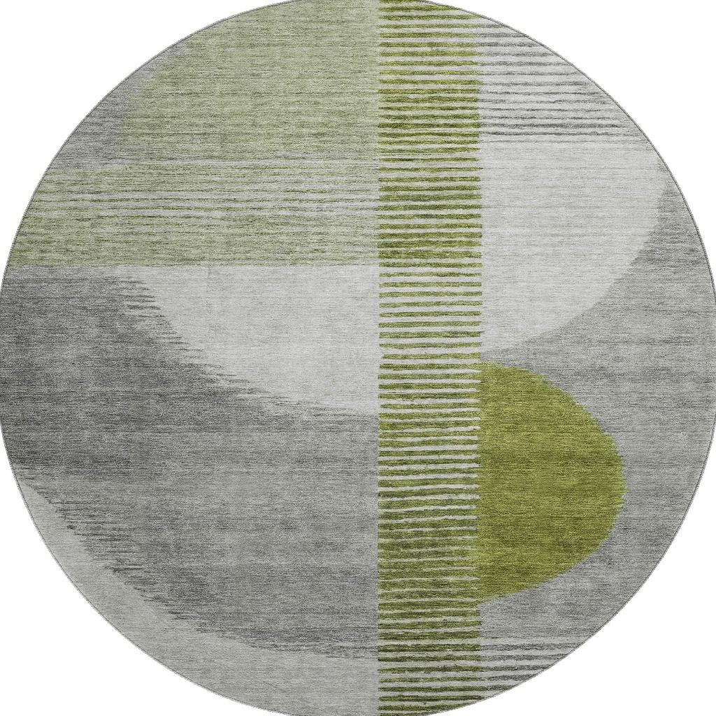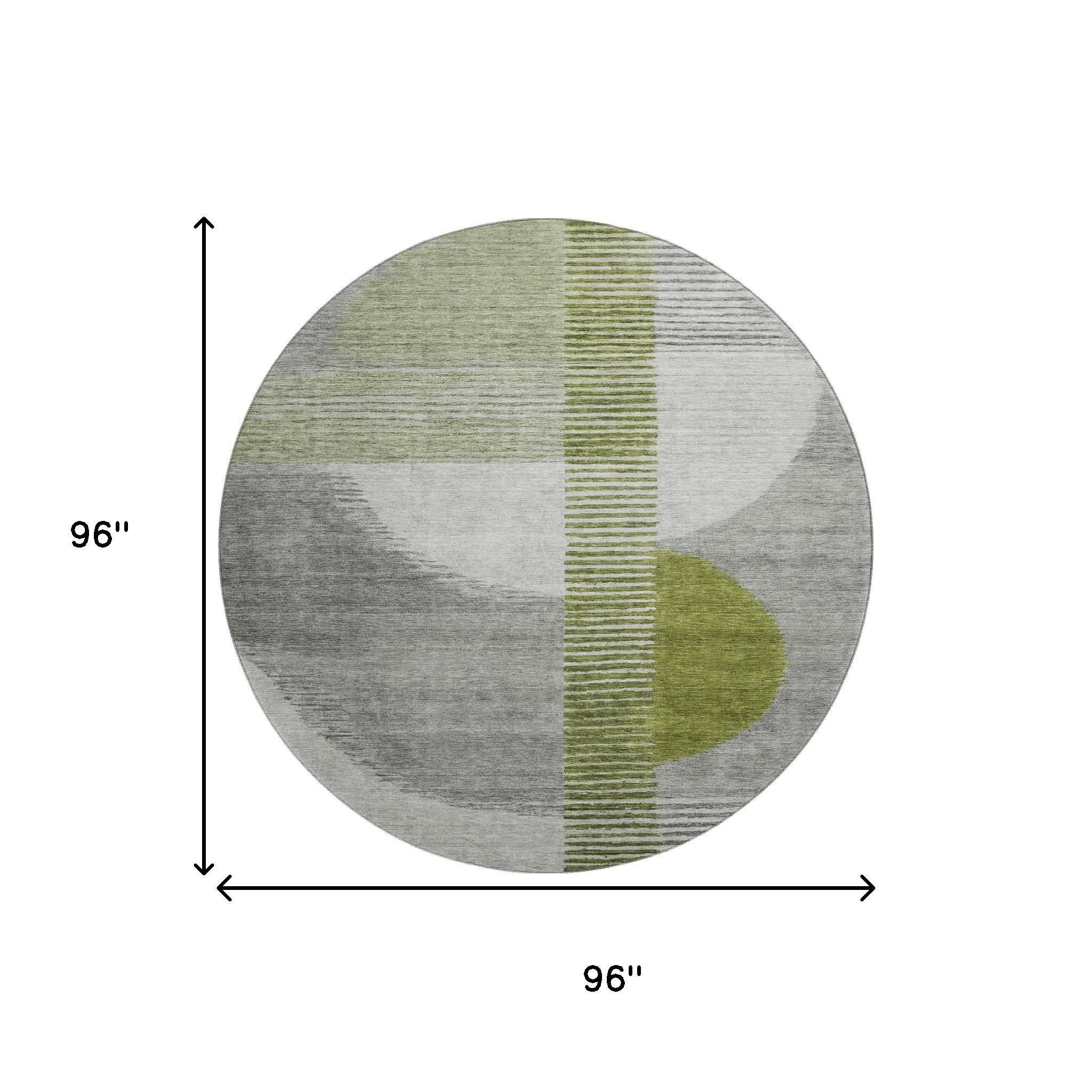 Add great coloration and comfortable texture to your space with this 8-foot olive green gray and ivory geometric washable round rug with uv protection. Ideal for spaces with kids and pets, this rug is stain resistant to help repel dirt and spilled liquids. Built to last, this rug crafted from polyester fibers is known for its durability and long lasting appeal. Rugs are a great way to showcase your style, hide imperfections, warm your home and reduce noise. This larger sized, transitional styled rug is ready to create a focal point or statement piece in your room. 96.00-inch h x 96.00-inch w x 0.39-inch d.