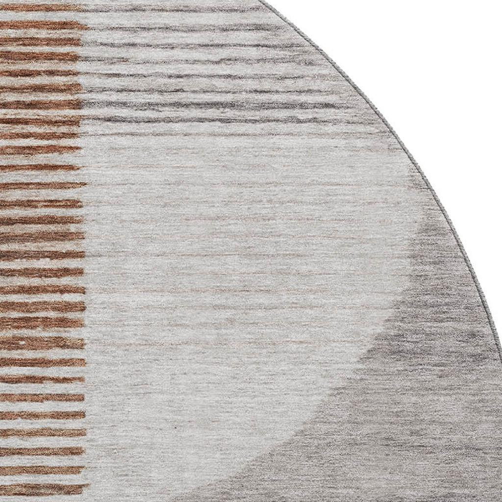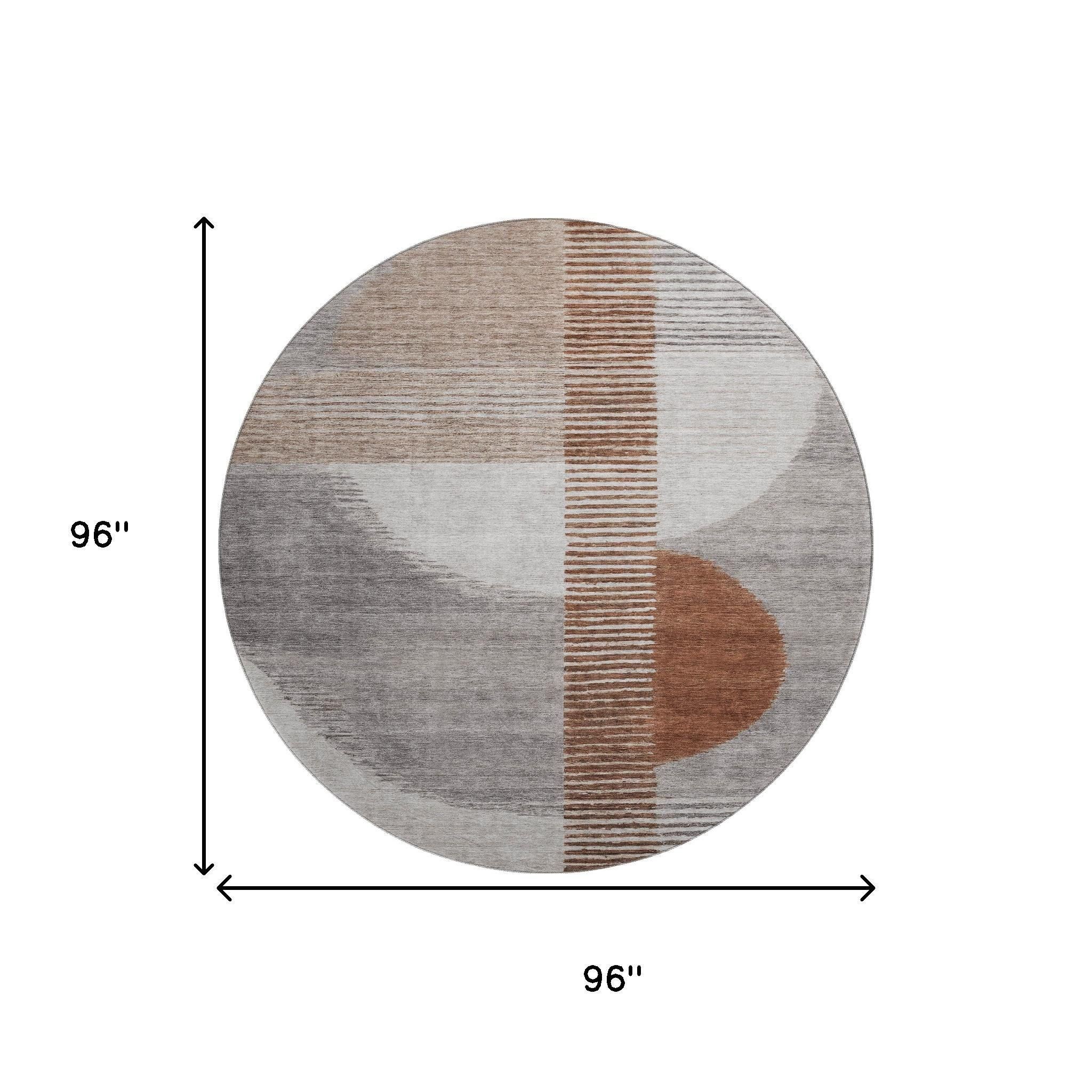 Add some artistry to your room with this 8-foot taupe ivory and rust geometric washable round rug with uv protection. Ideal for spaces with kids and pets, this rug is stain resistant to help repel dirt and spilled liquids. Built to last, this rug crafted from polyester fibers is known for its durability and long lasting appeal. Rugs are a great way to showcase your style, hide imperfections, warm your home and reduce noise. This larger sized, transitional styled rug is ready to create a focal point or statement piece in your room. 96.00-inch h x 96.00-inch w x 0.39-inch d.