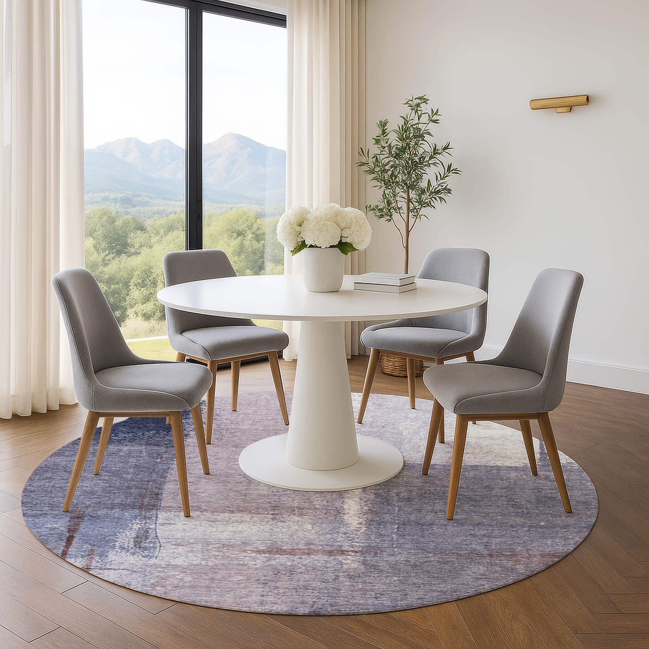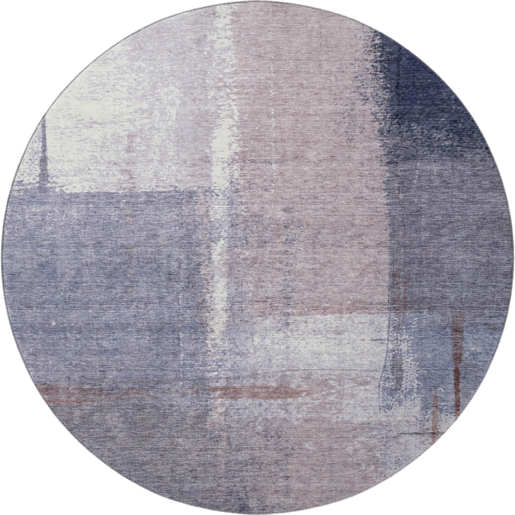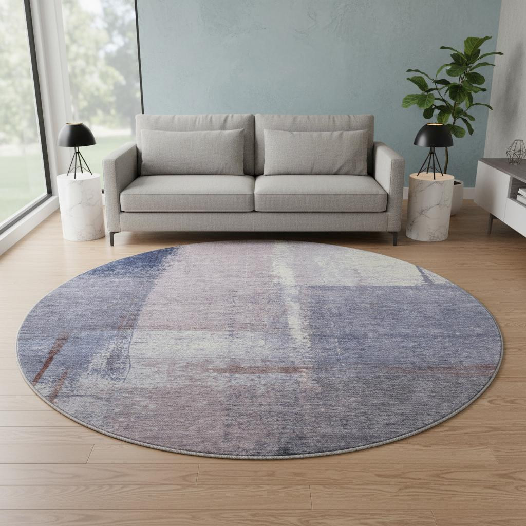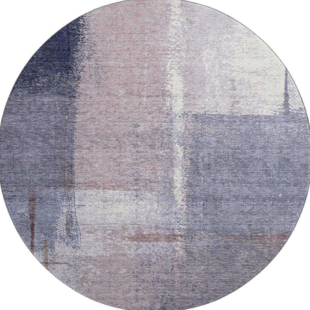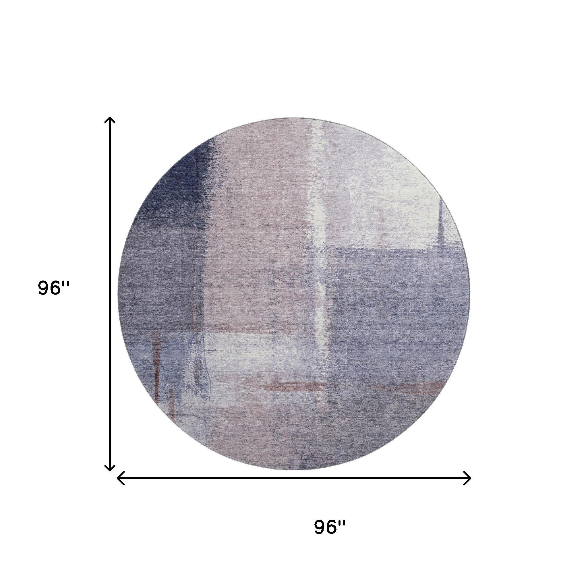 This 8-foot lavender gray and ivory abstract washable round rug with uv protection, is a great way to add warmth to a room. Ideal for spaces with kids and pets, this rug is stain resistant to help repel dirt and spilled liquids. Built to last, this rug crafted from polyester fibers is known for its durability and long lasting appeal. Rugs are a great way to showcase your style, hide imperfections, warm your home and reduce noise. This larger sized, transitional styled rug is ready to create a focal point or statement piece in your room. 96.00-inch h x 96.00-inch w x 0.39-inch d.