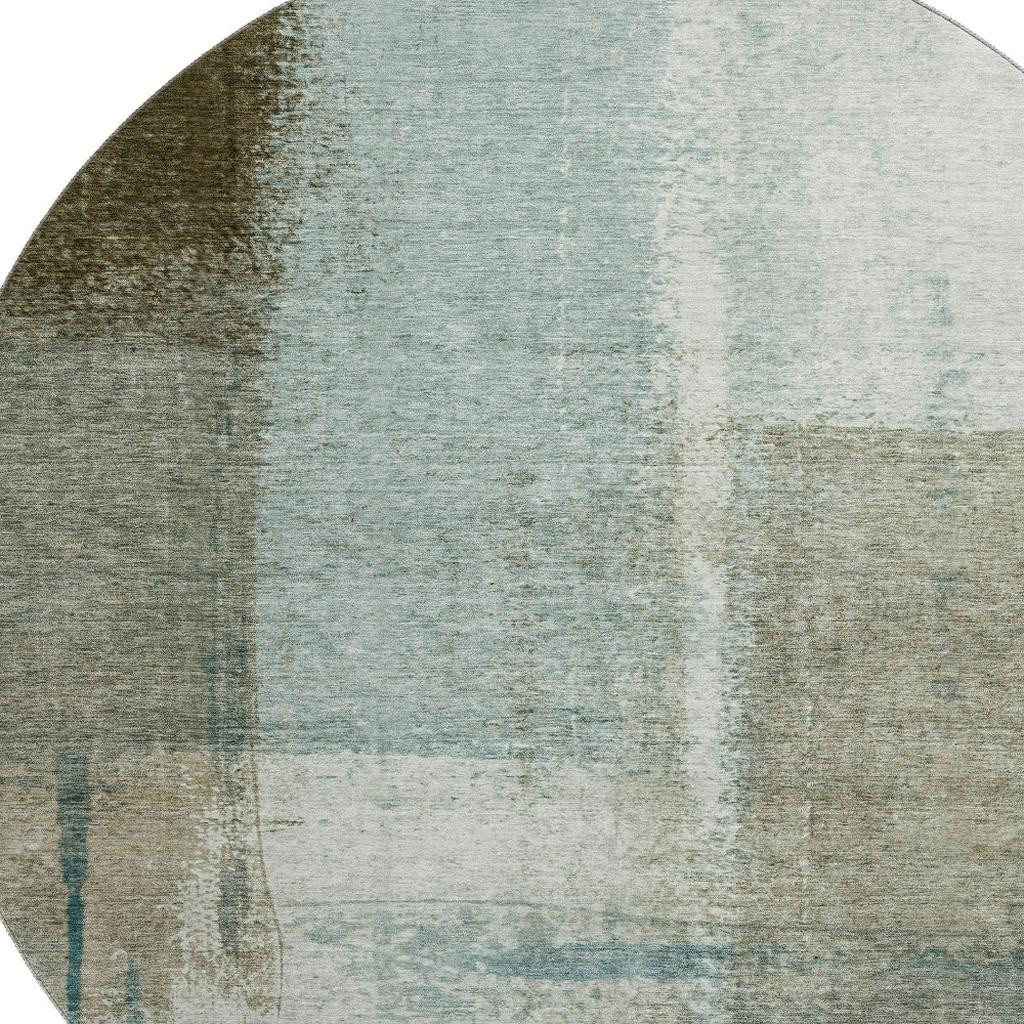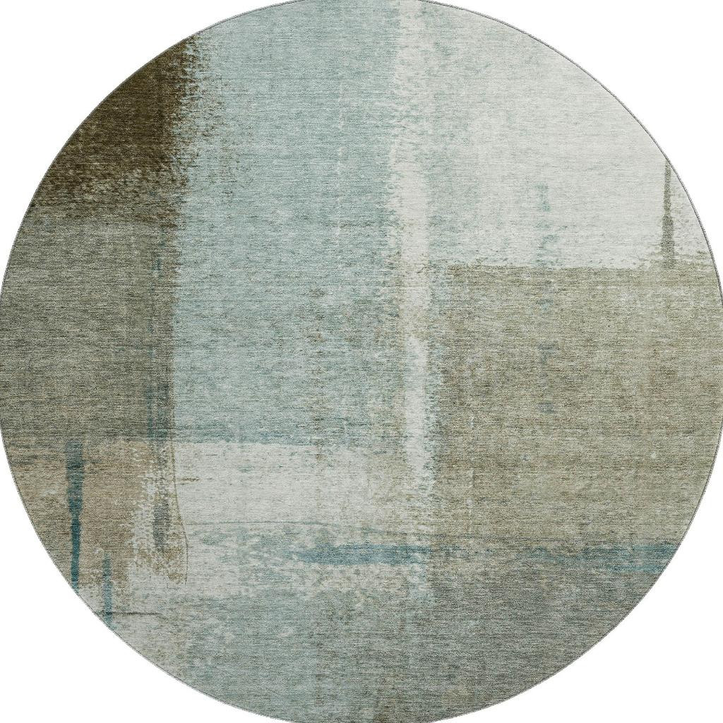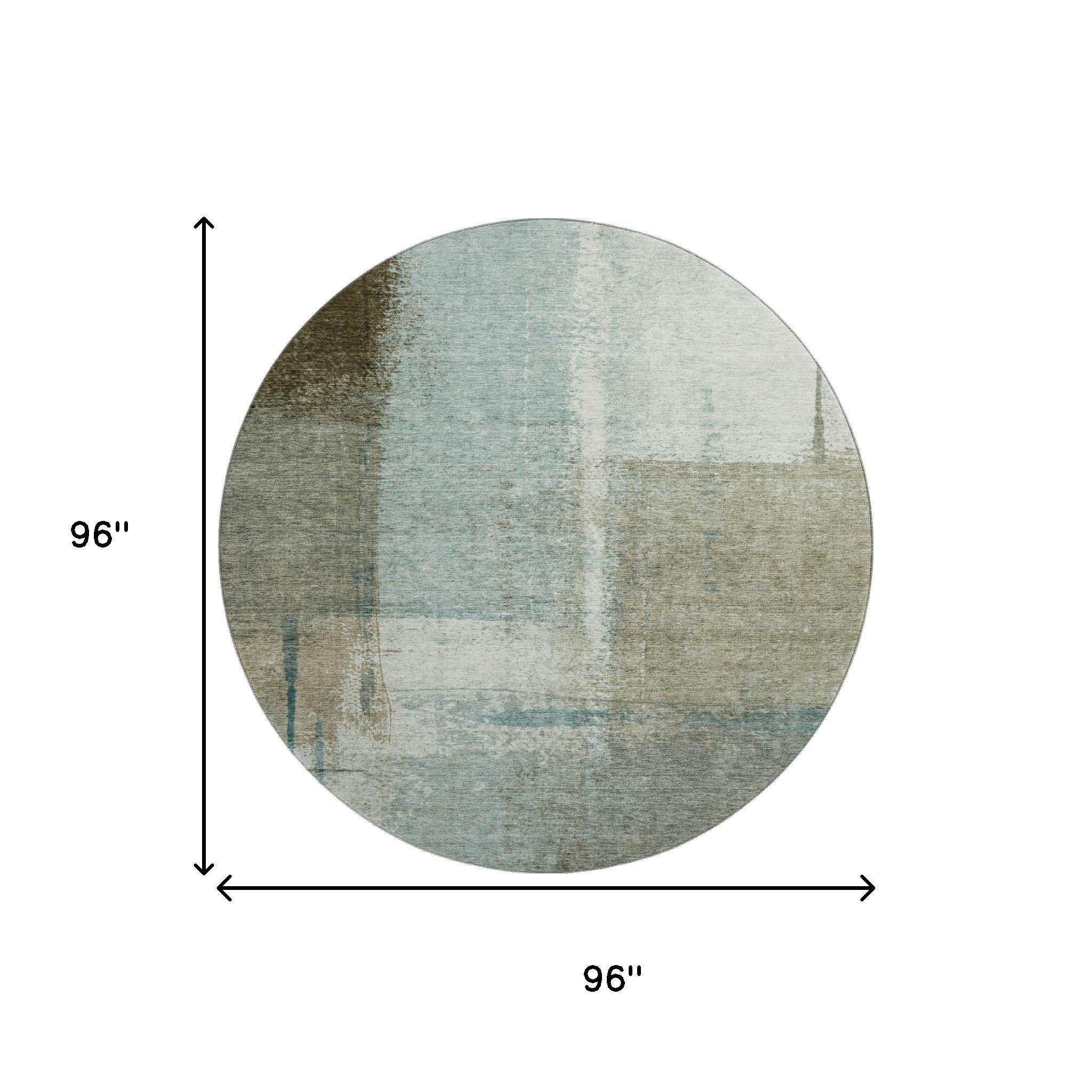 Add some artistry to your room with this 8-foot pale aqua beige and ivory abstract washable round rug with uv protection. Ideal for spaces with kids and pets, this rug is stain resistant to help repel dirt and spilled liquids. Built to last, this rug crafted from polyester fibers is known for its durability and long lasting appeal. Rugs are a great way to showcase your style, hide imperfections, warm your home and reduce noise. This larger sized, transitional styled rug is ready to create a focal point or statement piece in your room. 96.00-inch h x 96.00-inch w x 0.39-inch d.