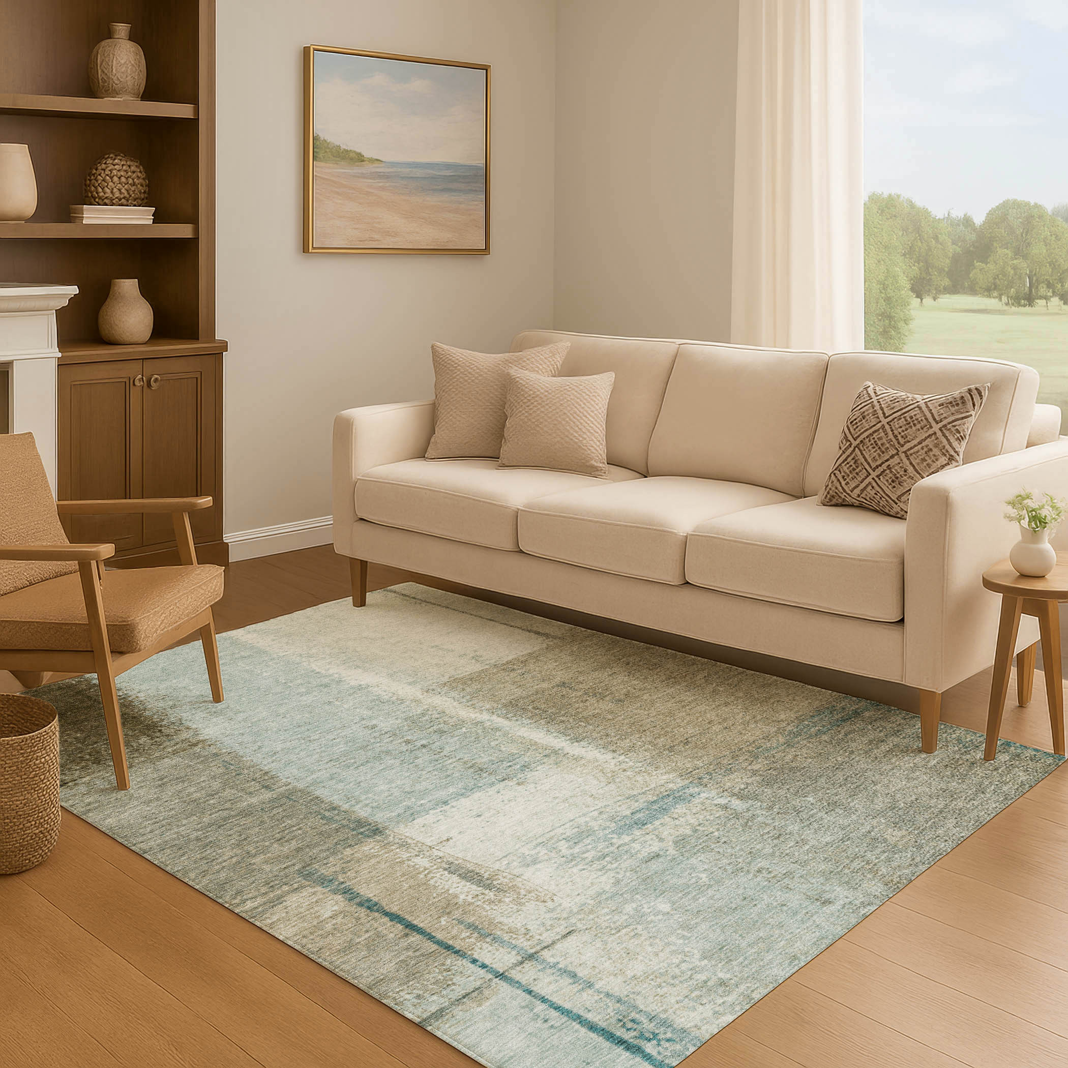 Add great coloration and comfortable texture to your space with this 8-foot x 10-foot pale aqua beige and ivory abstract washable area rug with uv protection. Ideal for spaces with kids and pets, this rug is stain resistant to help repel dirt and spilled liquids. Built to last, this rug crafted from polyester fibers is known for its durability and long lasting appeal. Rugs are a great way to showcase your style, hide imperfections, warm your home and reduce noise. This larger sized, transitional styled rug is ready to create a focal point or statement piece in your room. 96.00-inch h x 120.00-inch w x 0.39-inch d.