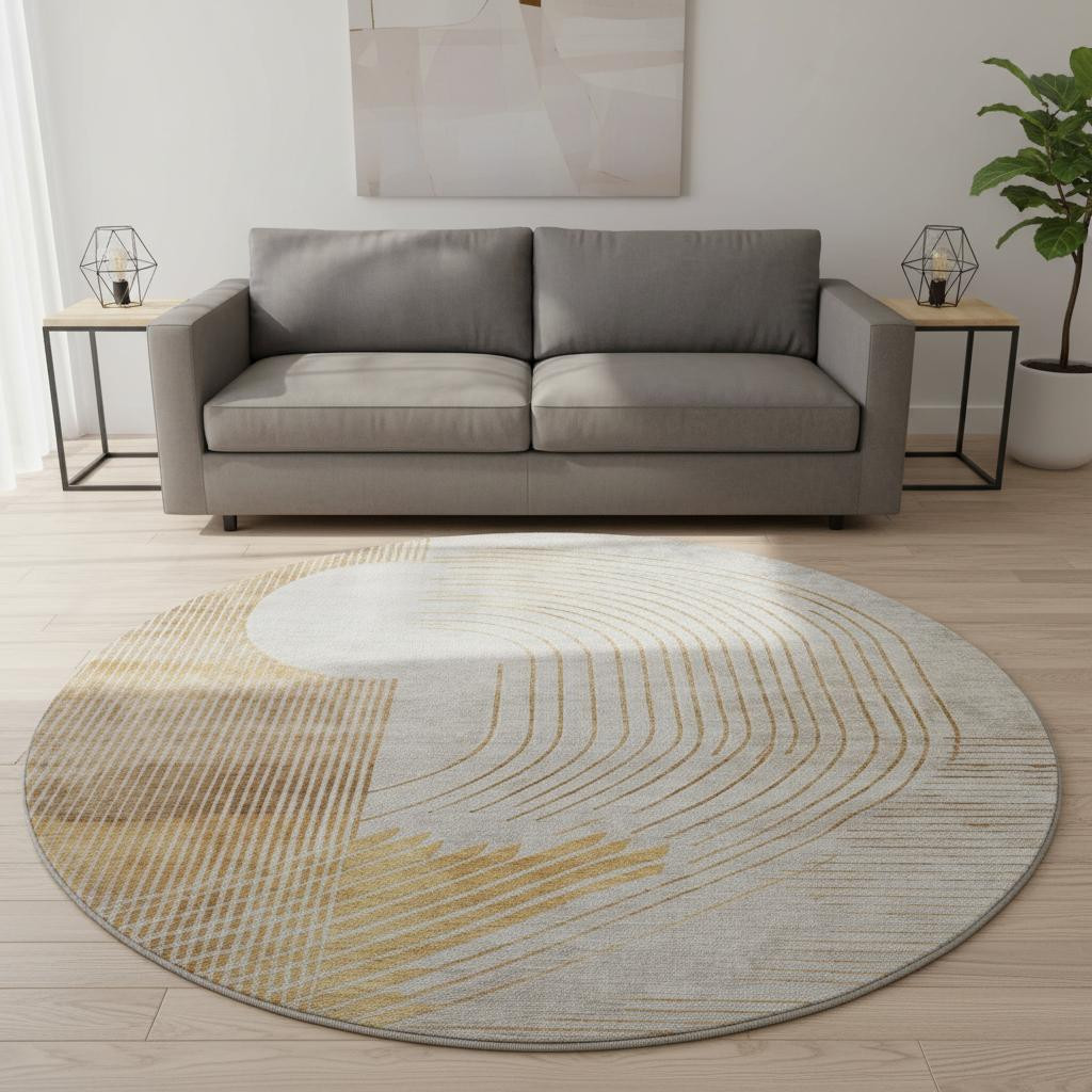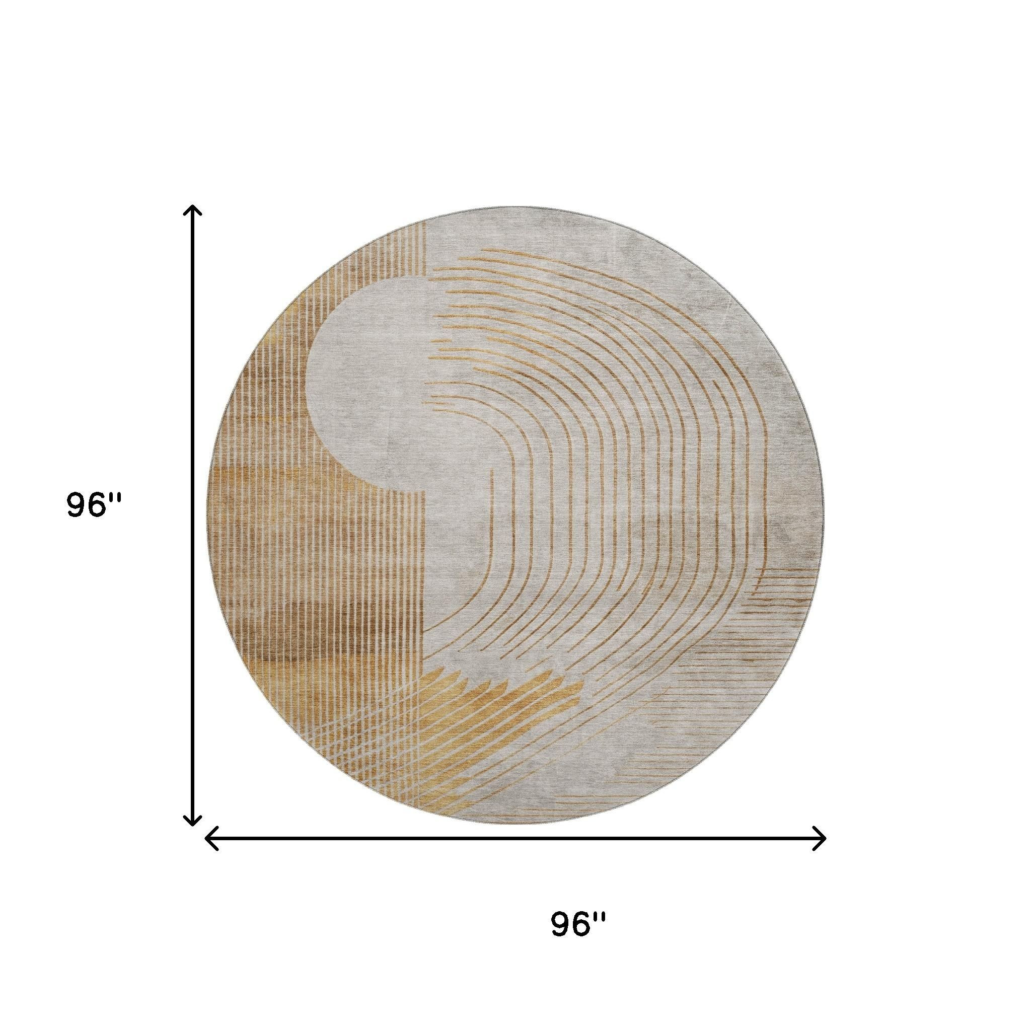 Add some artistry to your room with this 8-foot gold and beige geometric washable round rug with uv protection. Ideal for spaces with kids and pets, this rug is stain resistant to help repel dirt and spilled liquids. Built to last, this rug crafted from polyester fibers is known for its durability and long lasting appeal. Rugs are a great way to showcase your style, hide imperfections, warm your home and reduce noise. This larger sized, transitional styled rug is ready to create a focal point or statement piece in your room. 96.00-inch h x 96.00-inch w x 0.39-inch d.