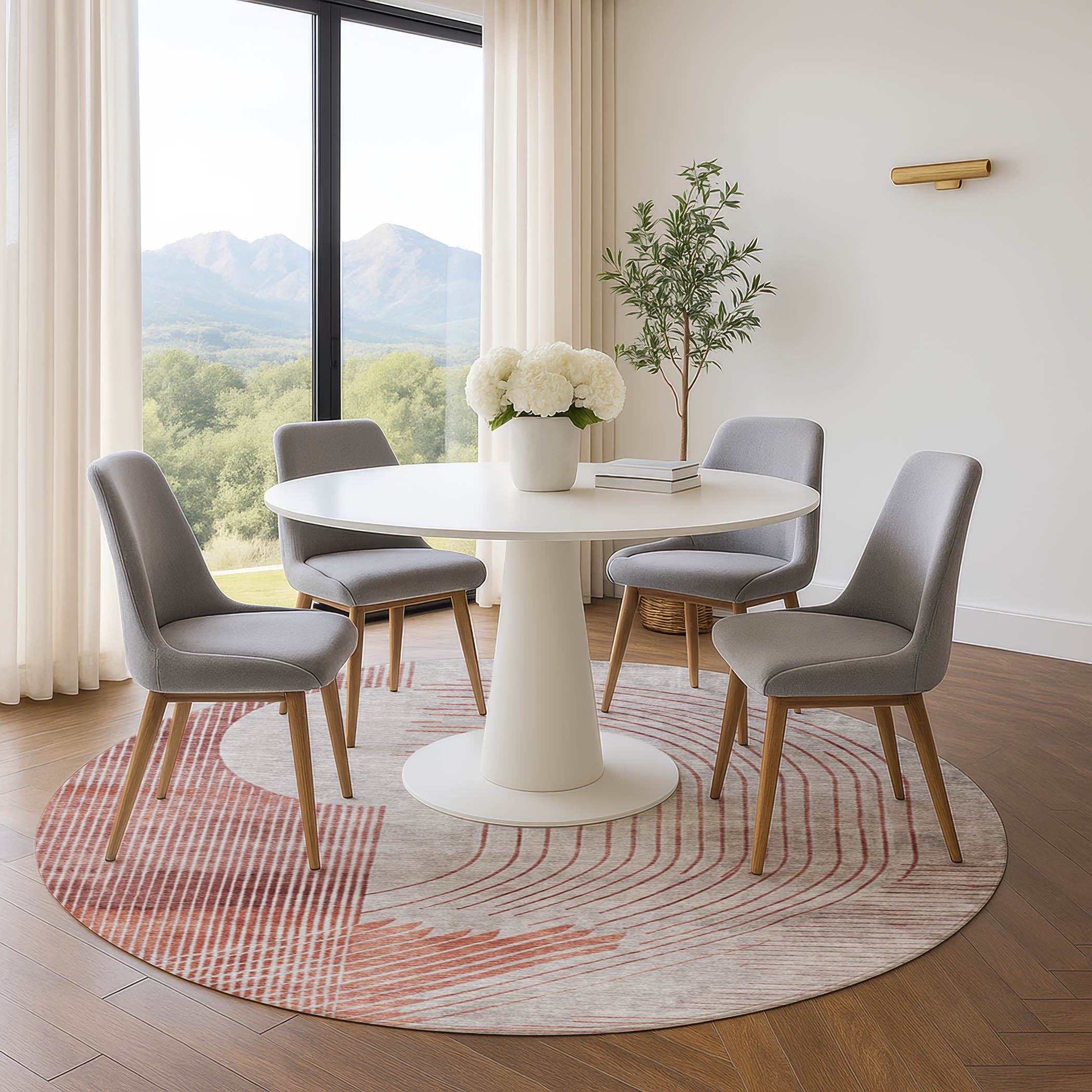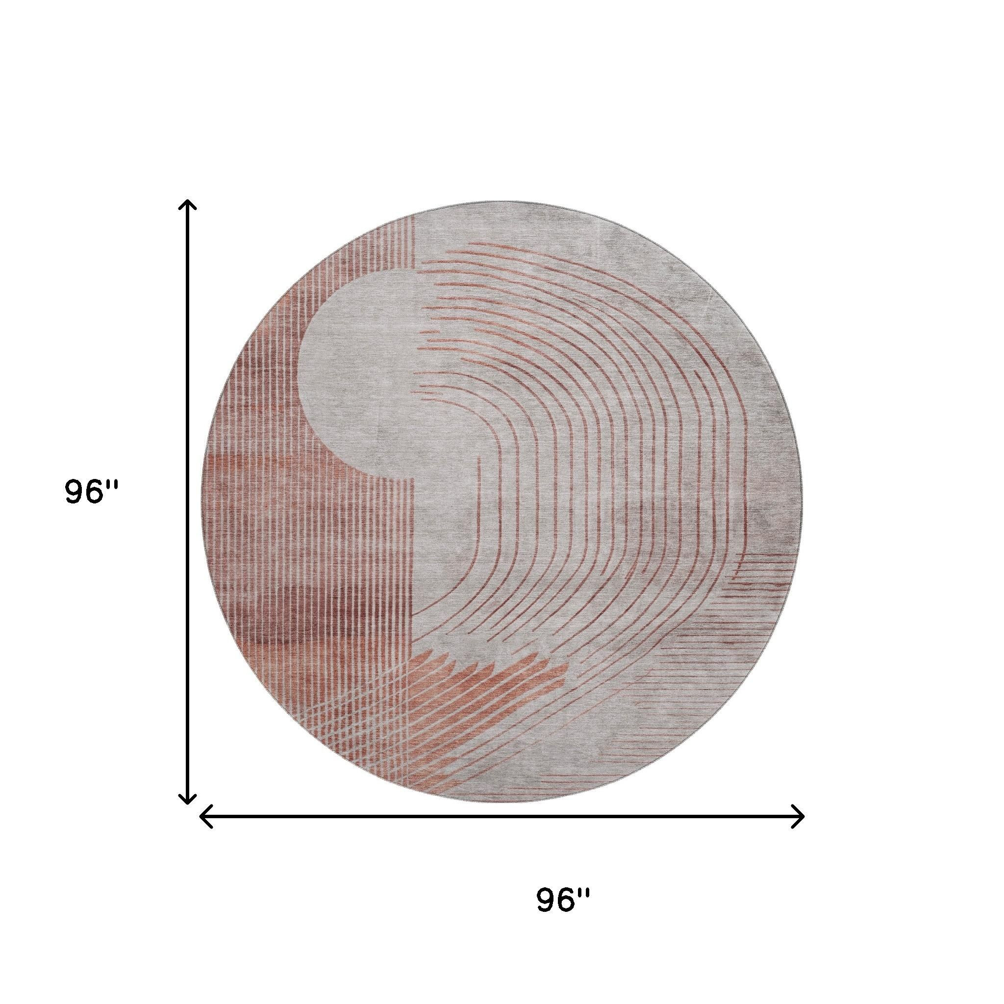 Set an inviting tone in your space with this 8-foot salmon and beige geometric washable round rug with uv protection. Ideal for spaces with kids and pets, this rug is stain resistant to help repel dirt and spilled liquids. Built to last, this rug crafted from polyester fibers is known for its durability and long lasting appeal. Rugs are a great way to showcase your style, hide imperfections, warm your home and reduce noise. This larger sized, transitional styled rug is ready to create a focal point or statement piece in your room. 96.00-inch h x 96.00-inch w x 0.39-inch d.