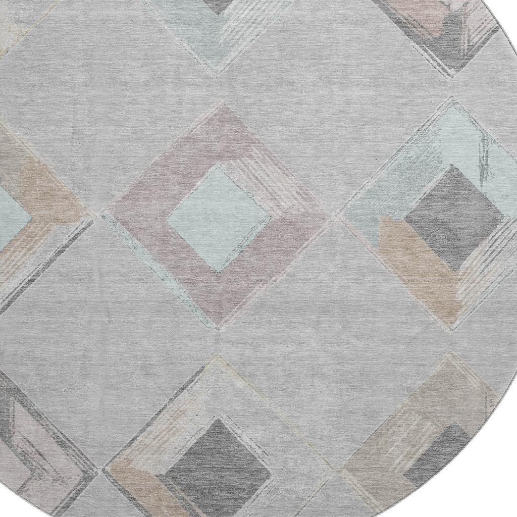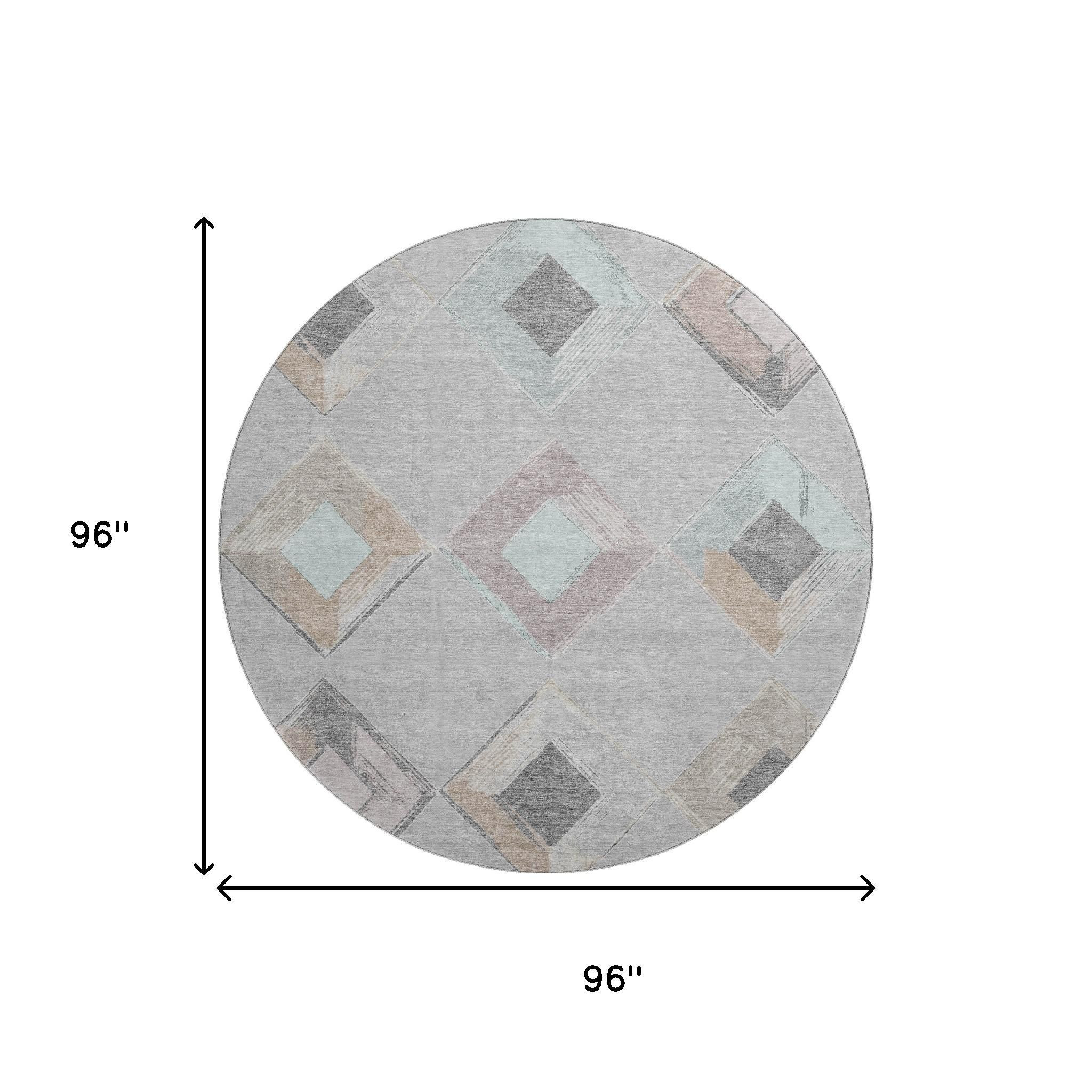 This 8-foot gray beige and charcoal geometric washable round rug with uv protection, is a great way to add warmth to a room. Ideal for spaces with kids and pets, this rug is stain resistant to help repel dirt and spilled liquids. Built to last, this rug crafted from polyester fibers is known for its durability and long lasting appeal. Rugs are a great way to showcase your style, hide imperfections, warm your home and reduce noise. This larger sized, transitional styled rug is ready to create a focal point or statement piece in your room. 96.00-inch h x 96.00-inch w x 0.39-inch d.