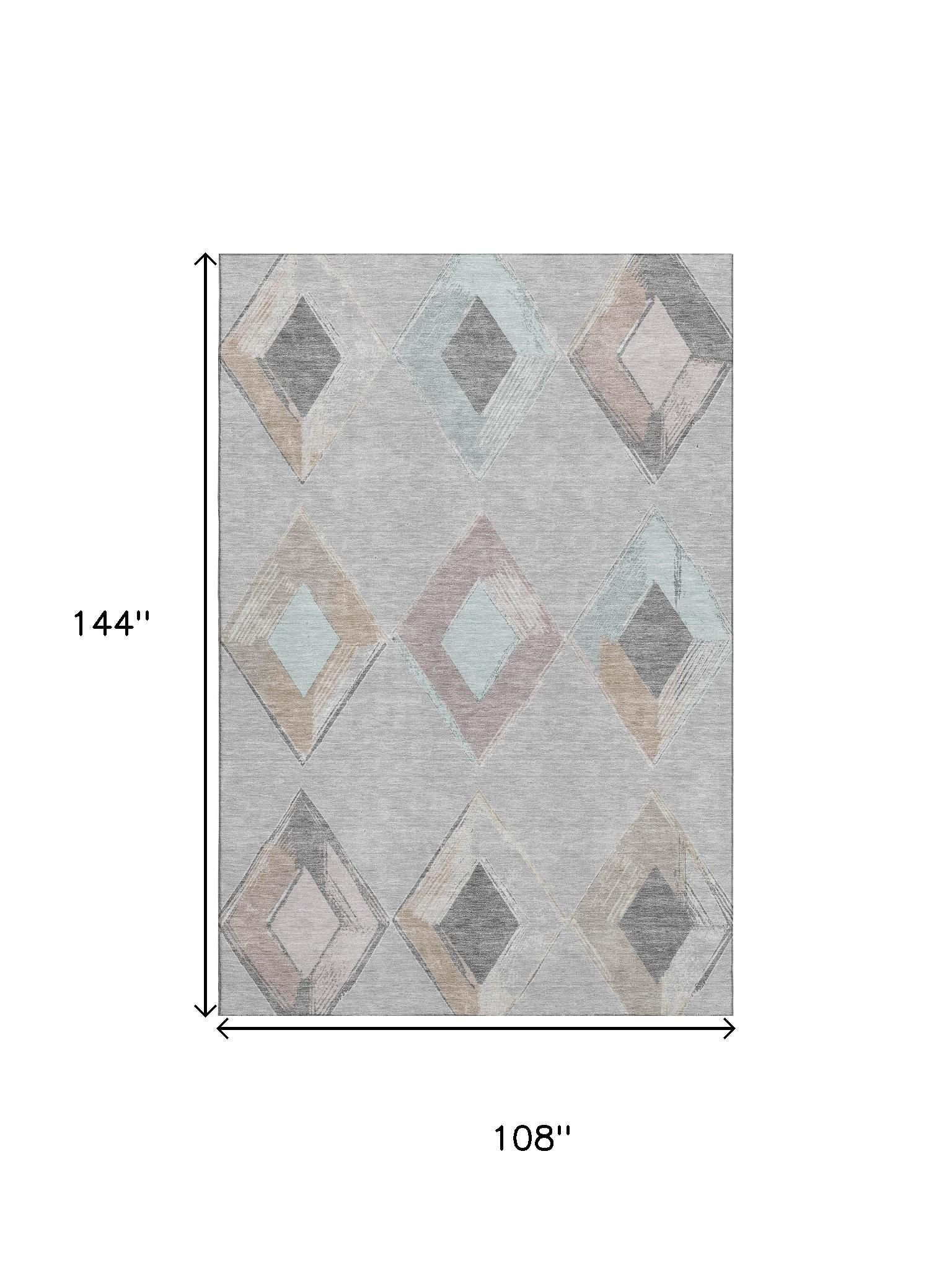 Set an inviting tone in your space with this 9-foot x 12-foot gray beige and charcoal geometric washable area rug with uv protection. Ideal for spaces with kids and pets, this rug is stain resistant to help repel dirt and spilled liquids. Built to last, this rug crafted from polyester fibers is known for its durability and long lasting appeal. Rugs are a great way to showcase your style, hide imperfections, warm your home and reduce noise. This larger sized, transitional styled rug is ready to create a focal point or statement piece in your room. 108.00-inch h x 144.00-inch w x 0.39-inch d.