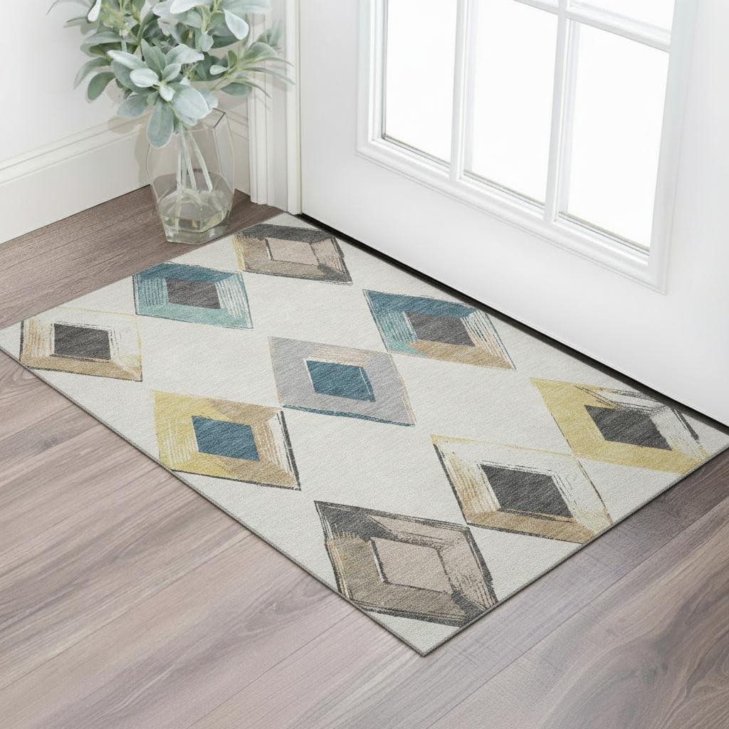Add great coloration and comfortable texture to your space with this 3-foot x 5-foot ivory blue and gold geometric washable area rug with uv protection. Ideal for spaces with kids and pets, this rug is stain resistant to help repel dirt and spilled liquids. Built to last, this rug crafted from polyester fibers is known for its durability and long lasting appeal. Rugs are a great way to showcase your style, hide imperfections, warm your home and reduce noise. This smaller sized, transitional styled rug is just what you need for your walkway, bedside, in front of door, cabinet, refrigerator, or chair. 36.00-inch h x 60.00-inch w x 0.39-inch d.