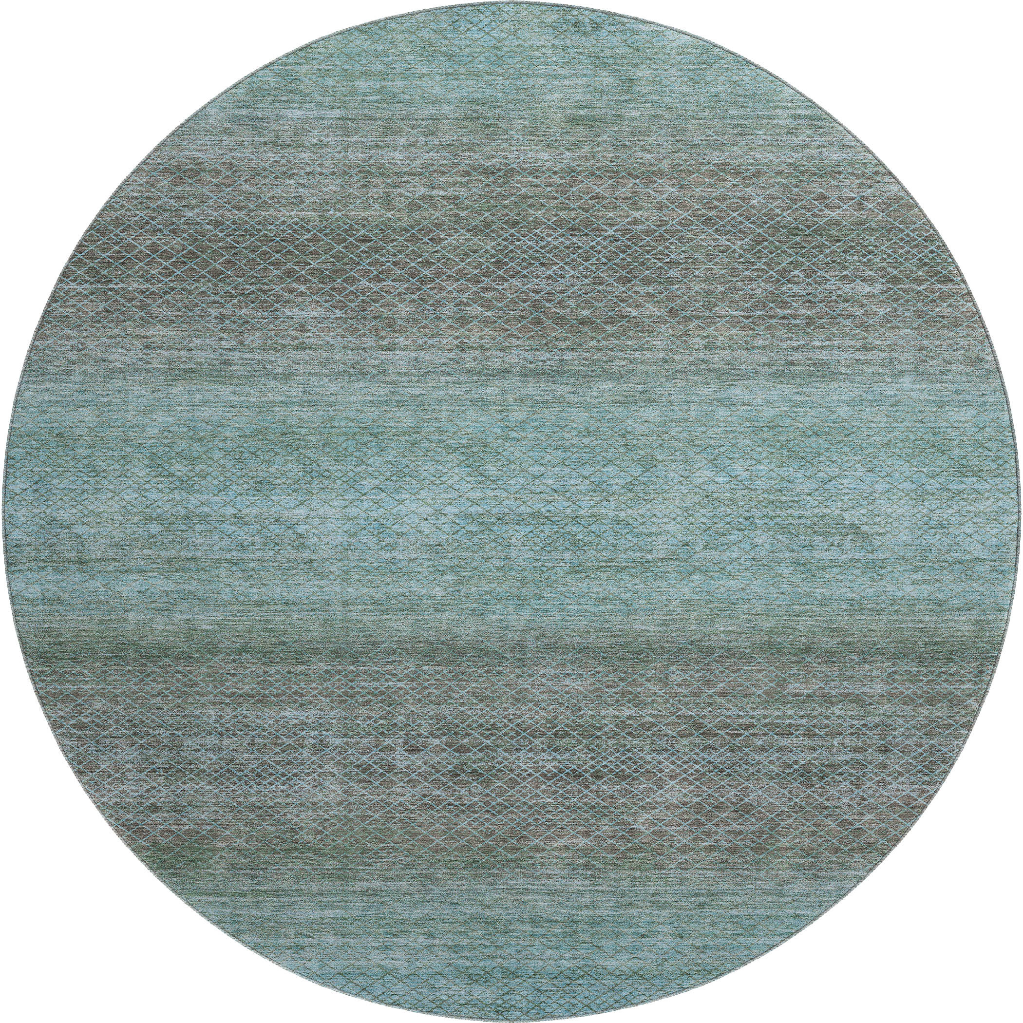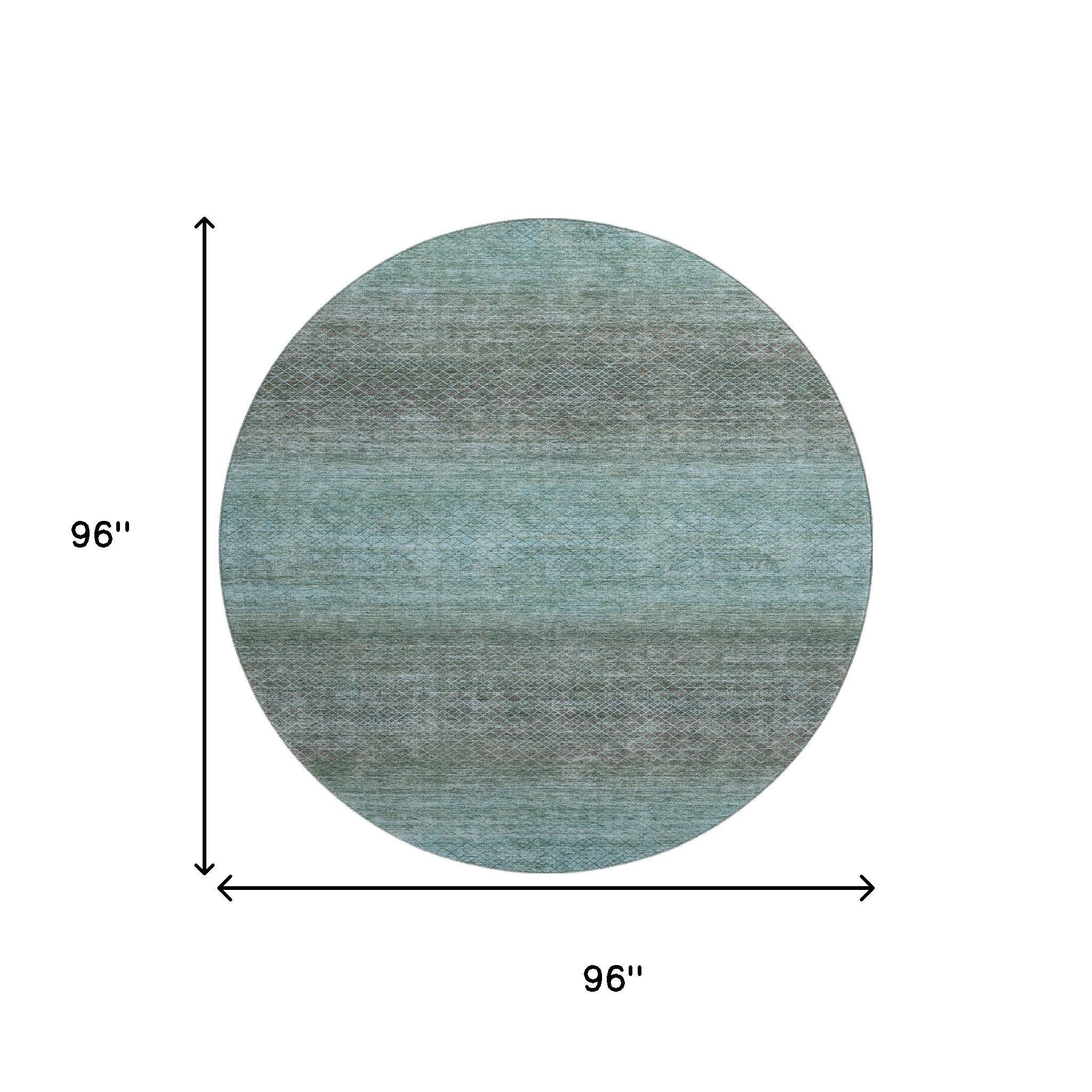This 8-foot teal and brown geometric washable round rug with uv protection, is a great way to add warmth to a room. Ideal for spaces with kids and pets, this rug is stain resistant to help repel dirt and spilled liquids. Built to last, this rug crafted from polyester fibers is known for its durability and long lasting appeal. Rugs are a great way to showcase your style, hide imperfections, warm your home and reduce noise. This larger sized, transitional styled rug is ready to create a focal point or statement piece in your room. 96.00-inch h x 96.00-inch w x 0.39-inch d.