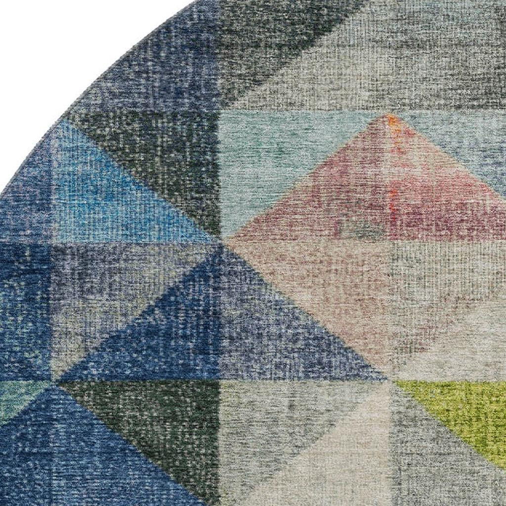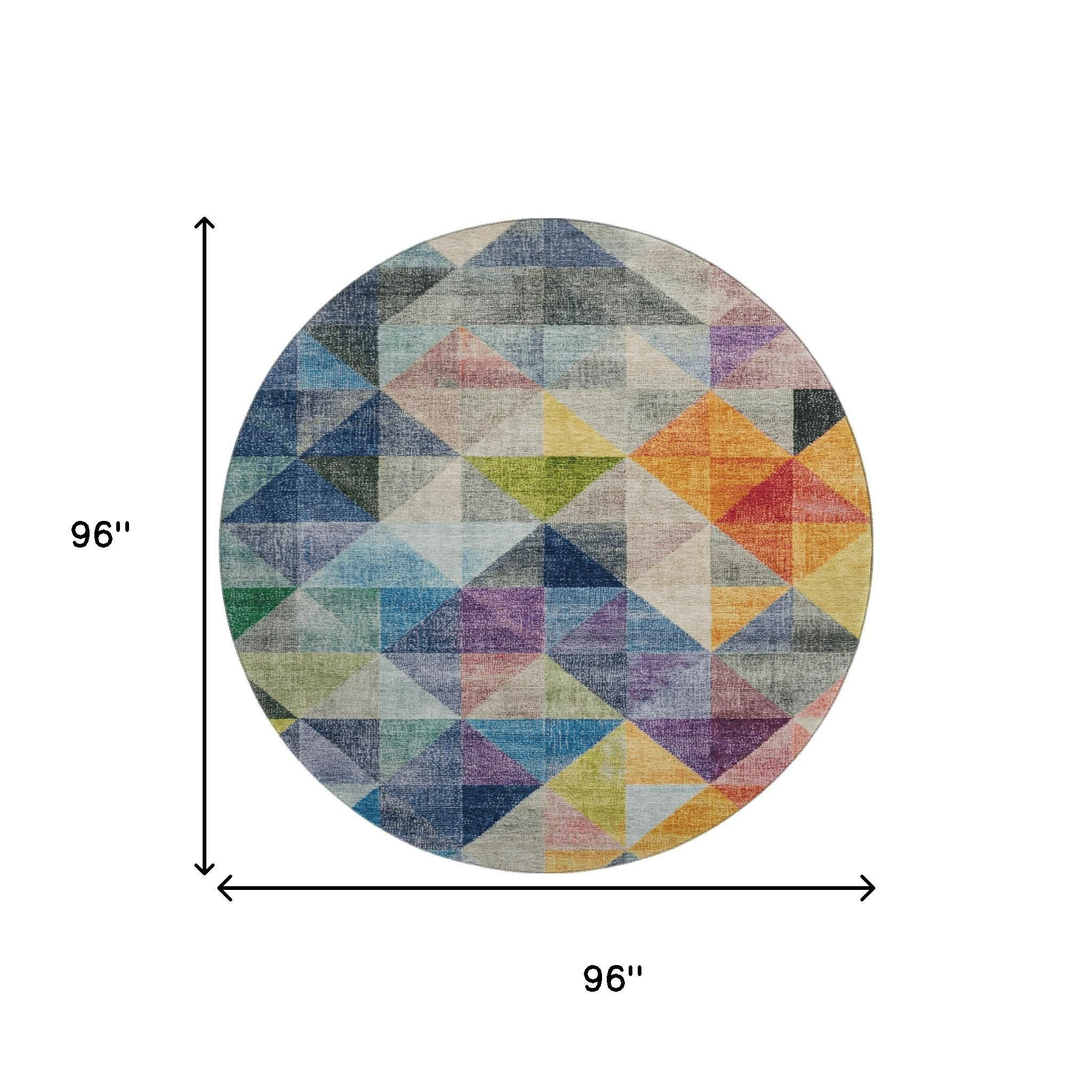 Add some artistry to your room with this 8-foot beige blue and orange geometric washable round rug with uv protection. Ideal for spaces with kids and pets, this rug is stain resistant to help repel dirt and spilled liquids. Built to last, this rug crafted from polyester fibers is known for its durability and long lasting appeal. Rugs are a great way to showcase your style, hide imperfections, warm your home and reduce noise. This larger sized, transitional styled rug is ready to create a focal point or statement piece in your room. 96.00-inch h x 96.00-inch w x 0.39-inch d.