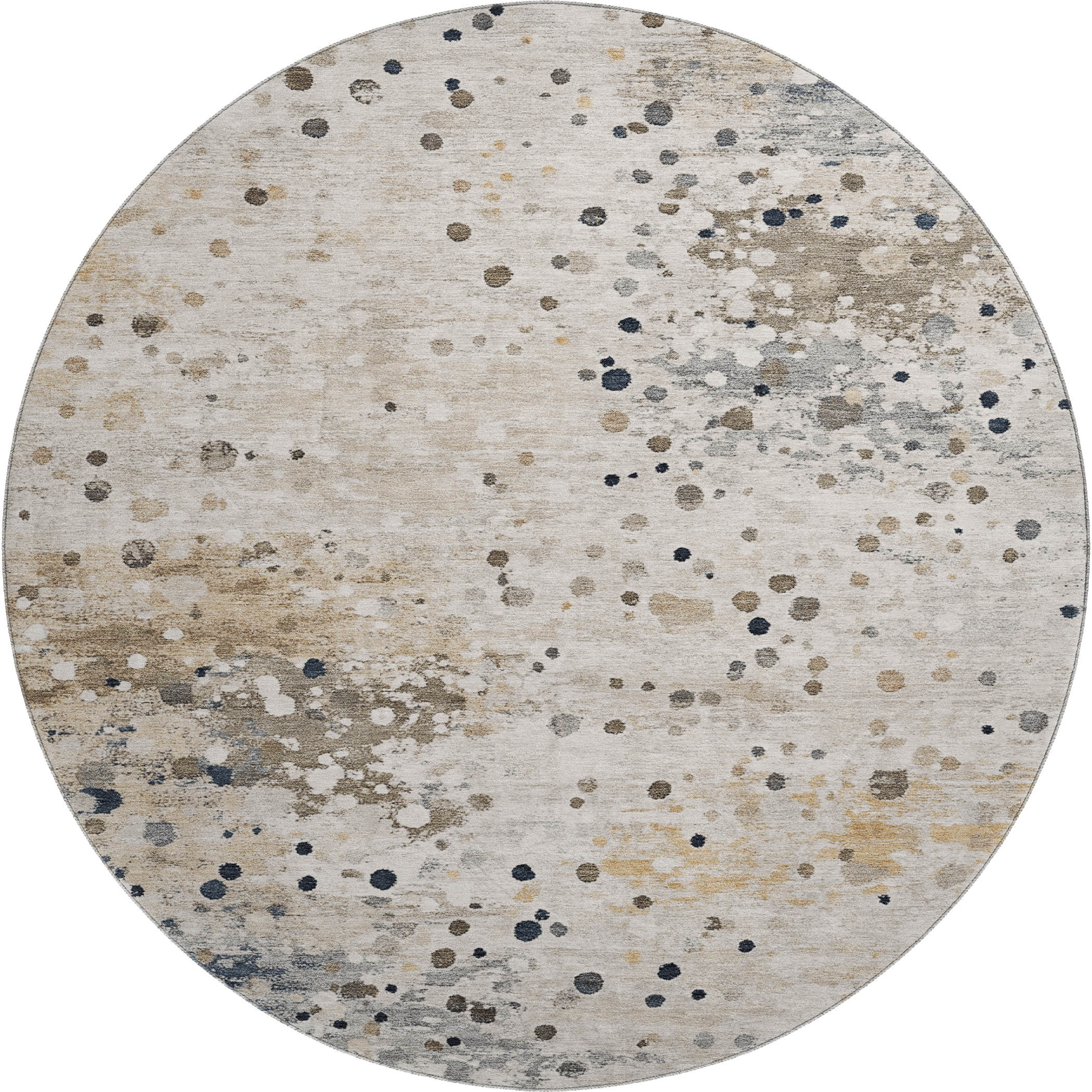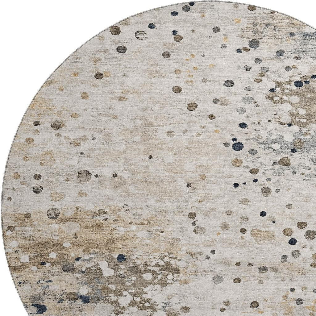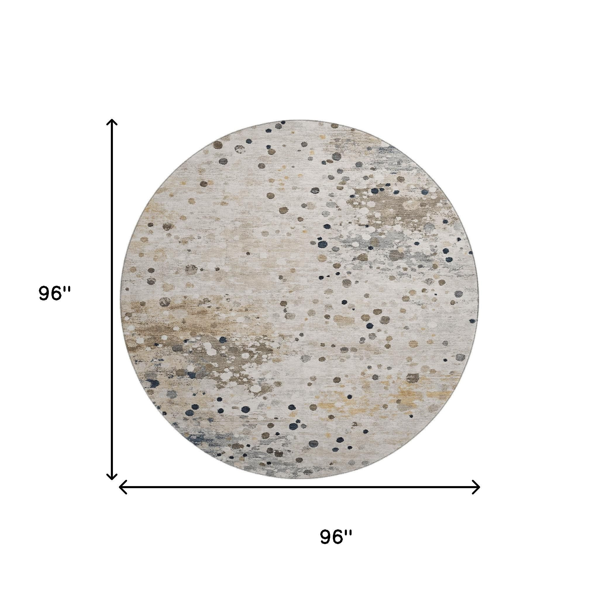 Add some artistry to your room with this 8-foot ivory gold and gray abstract washable round rug with uv protection. Ideal for spaces with kids and pets, this rug is stain resistant to help repel dirt and spilled liquids. Built to last, this rug crafted from polyester fibers is known for its durability and long lasting appeal. Rugs are a great way to showcase your style, hide imperfections, warm your home and reduce noise. This larger sized, transitional styled rug is ready to create a focal point or statement piece in your room. 96.00-inch h x 96.00-inch w x 0.39-inch d.