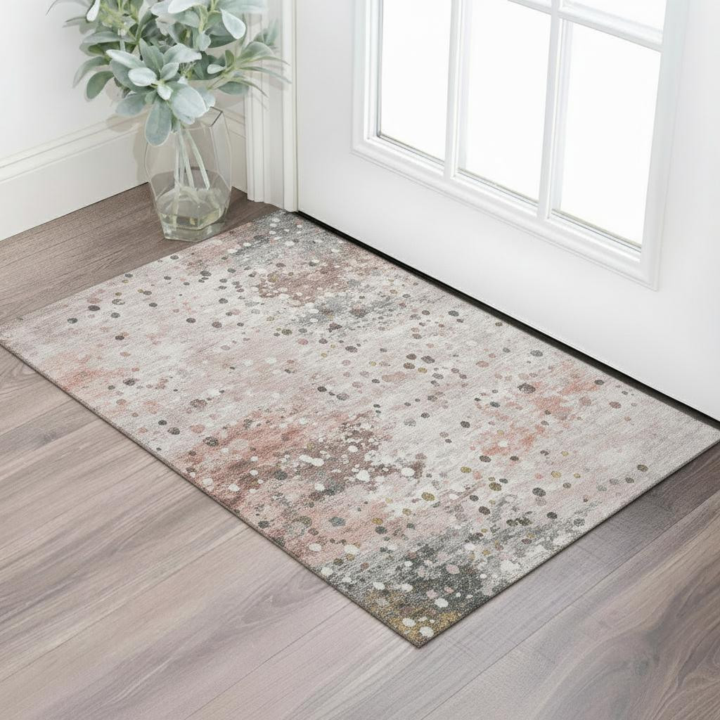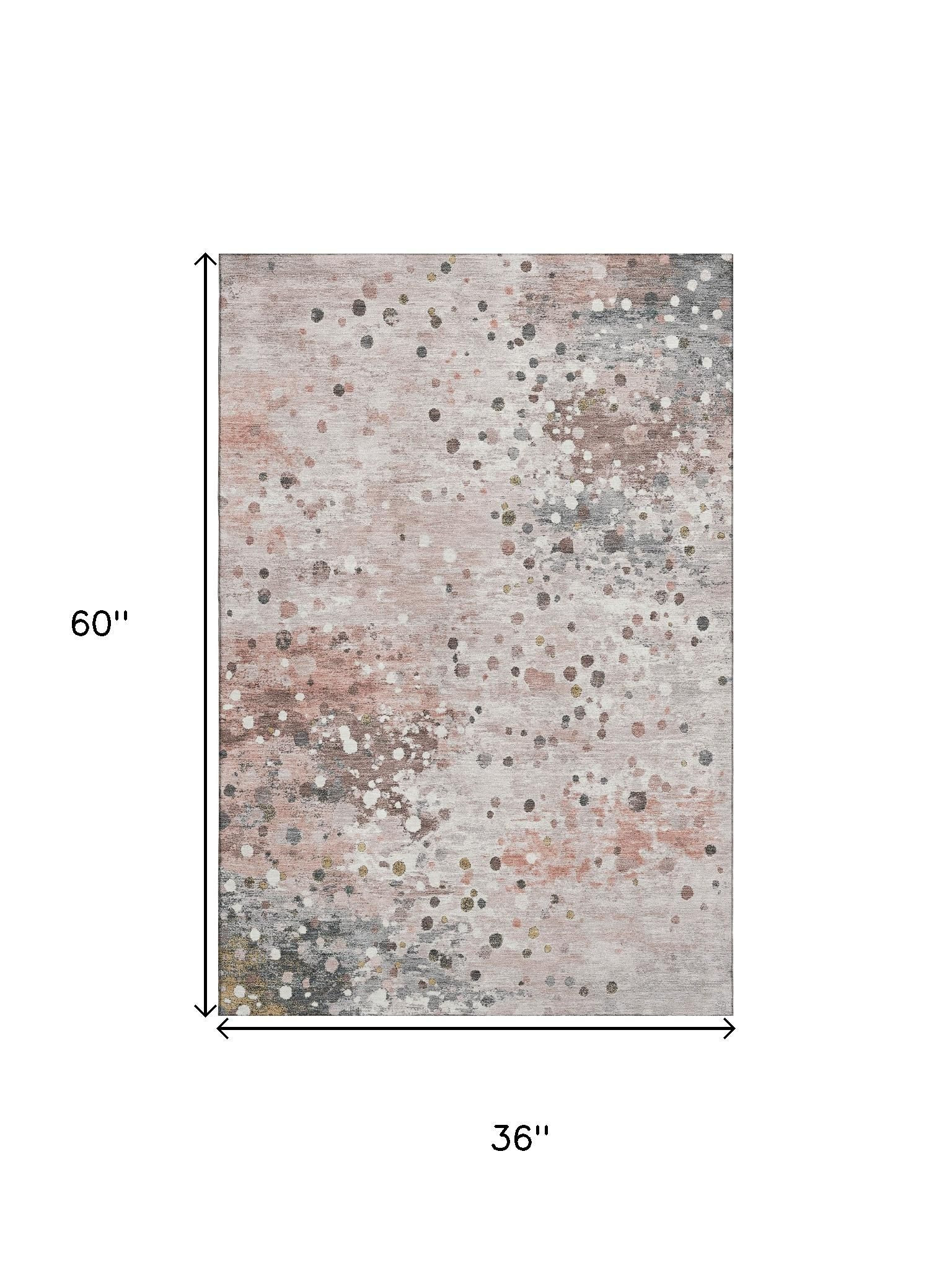 Set an inviting tone in your space with this 3-foot x 5-foot salmon ivory and gray abstract washable area rug with uv protection. Ideal for spaces with kids and pets, this rug is stain resistant to help repel dirt and spilled liquids. Built to last, this rug crafted from polyester fibers is known for its durability and long lasting appeal. Rugs are a great way to showcase your style, hide imperfections, warm your home and reduce noise. This smaller sized, transitional styled rug is just what you need for your walkway, bedside, in front of door, cabinet, refrigerator, or chair. 36.00-inch h x 60.00-inch w x 0.39-inch d.