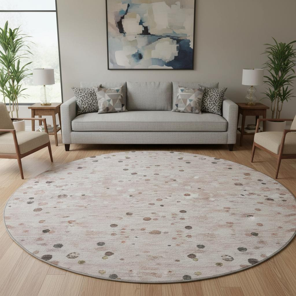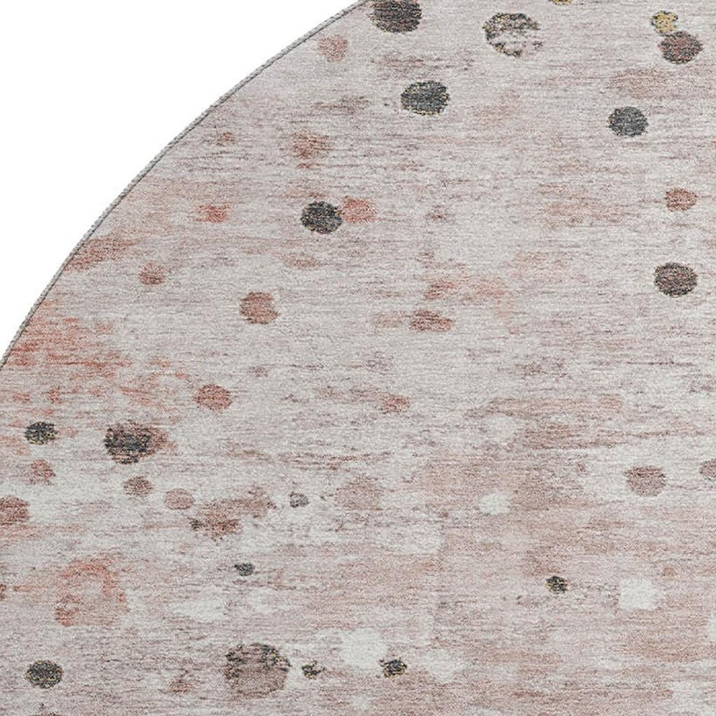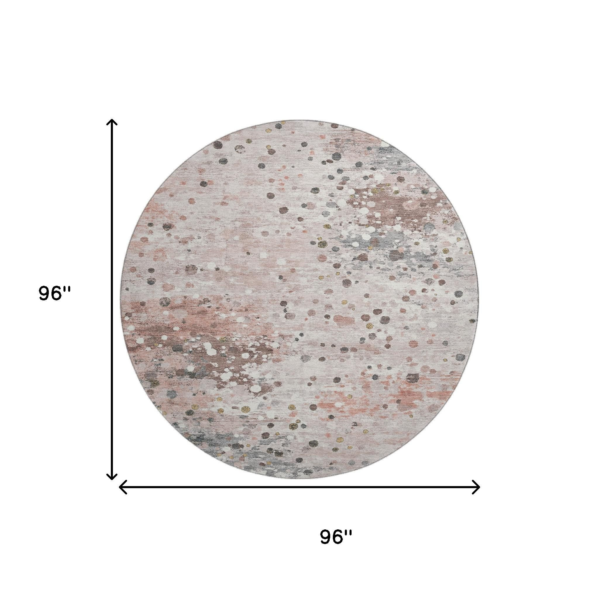 Add great coloration and comfortable texture to your space with this 8-foot salmon ivory and gray abstract washable round rug with uv protection. Ideal for spaces with kids and pets, this rug is stain resistant to help repel dirt and spilled liquids. Built to last, this rug crafted from polyester fibers is known for its durability and long lasting appeal. Rugs are a great way to showcase your style, hide imperfections, warm your home and reduce noise. This larger sized, transitional styled rug is ready to create a focal point or statement piece in your room. 96.00-inch h x 96.00-inch w x 0.39-inch d.