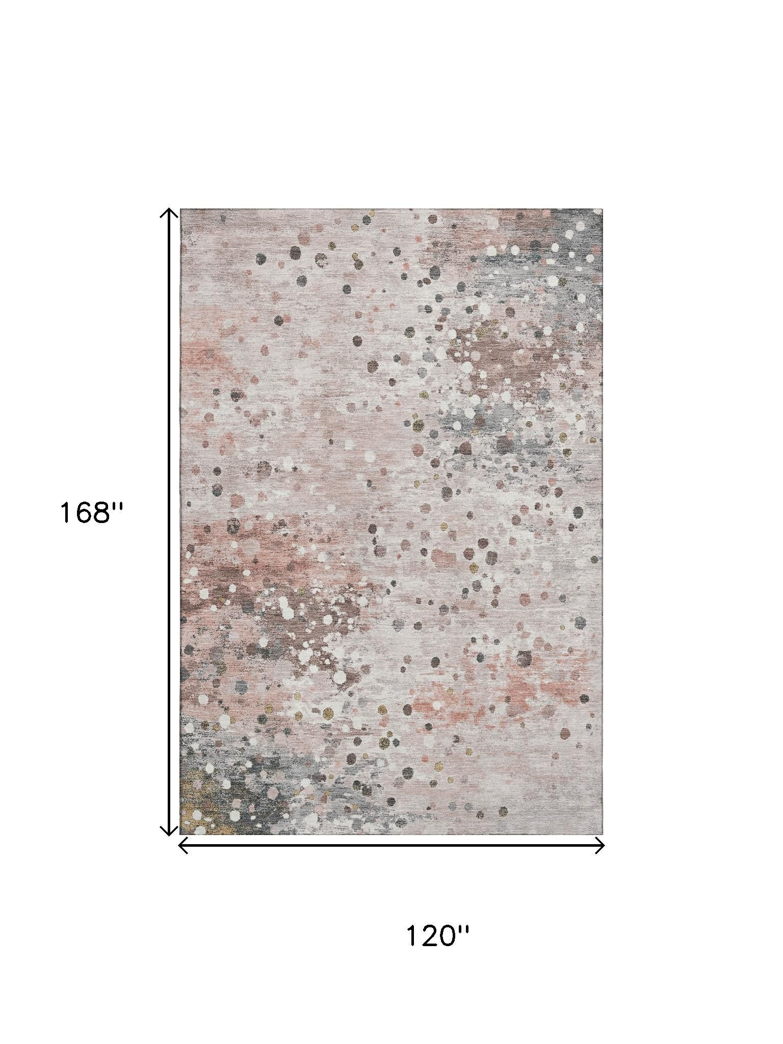 Set an inviting tone in your space with this 10-foot x 14-foot salmon ivory and gray abstract washable area rug with uv protection. Ideal for spaces with kids and pets, this rug is stain resistant to help repel dirt and spilled liquids. Built to last, this rug crafted from polyester fibers is known for its durability and long lasting appeal. Rugs are a great way to showcase your style, hide imperfections, warm your home and reduce noise. This larger sized, transitional styled rug is ready to create a focal point or statement piece in your room. 120.00-inch h x 168.00-inch w x 0.39-inch d.
