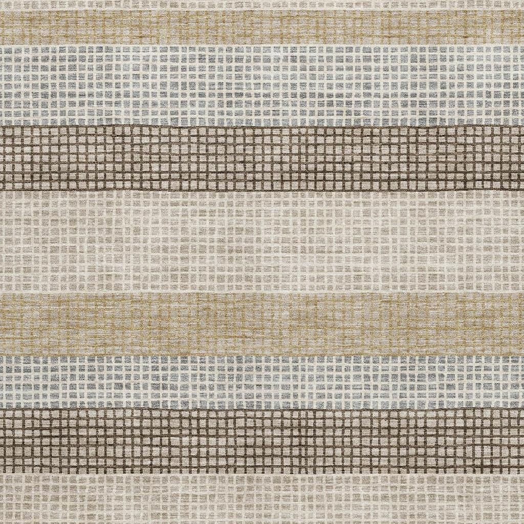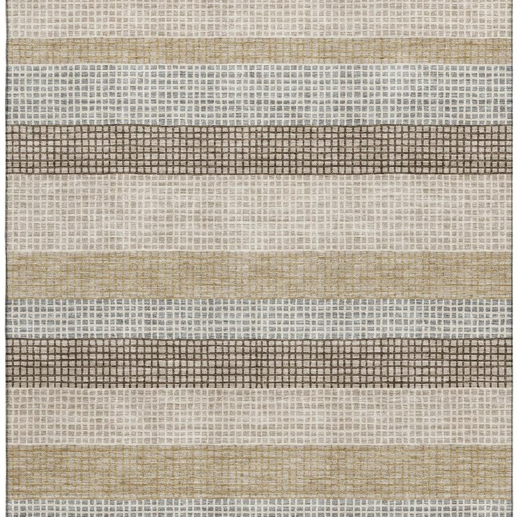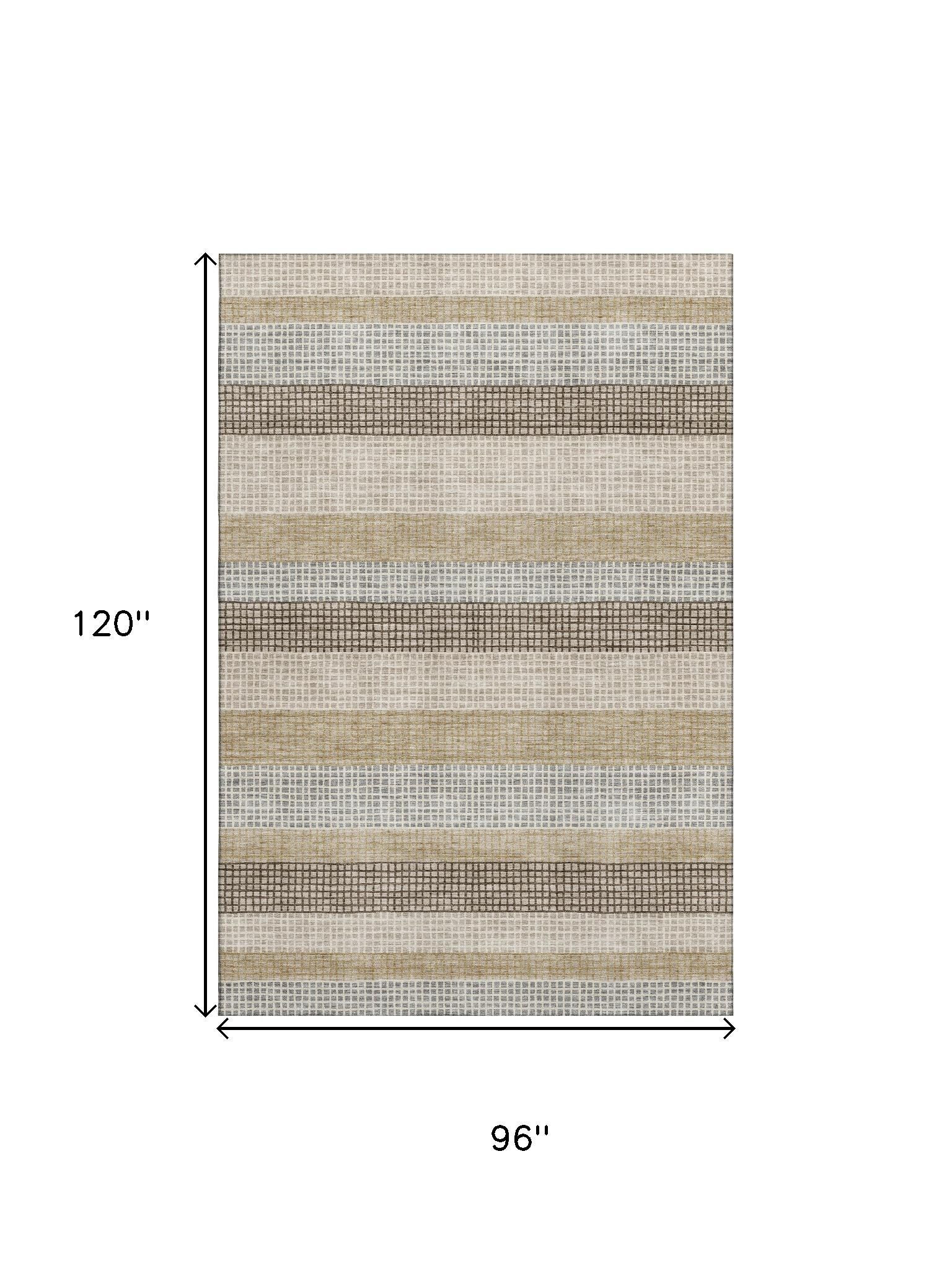 Add some artistry to your room with this 8-foot x 10-foot beige ivory and chocolate striped washable area rug with uv protection. Ideal for spaces with kids and pets, this rug is stain resistant to help repel dirt and spilled liquids. Built to last, this rug crafted from polyester fibers is known for its durability and long lasting appeal. Rugs are a great way to showcase your style, hide imperfections, warm your home and reduce noise. This larger sized, transitional styled rug is ready to create a focal point or statement piece in your room. 96.00-inch h x 120.00-inch w x 0.39-inch d.