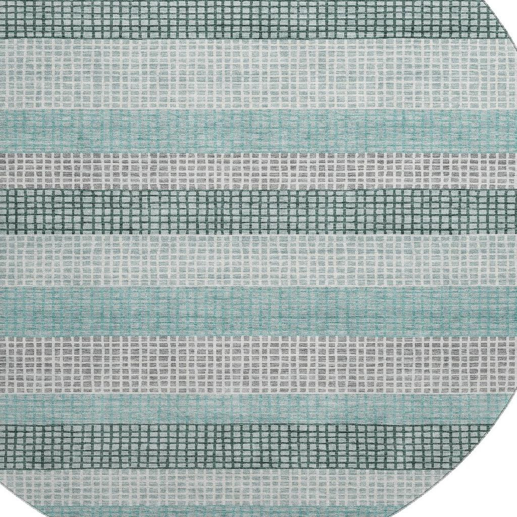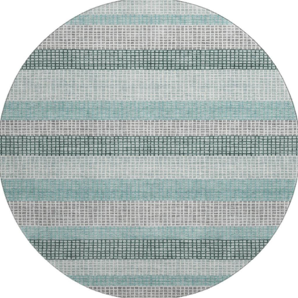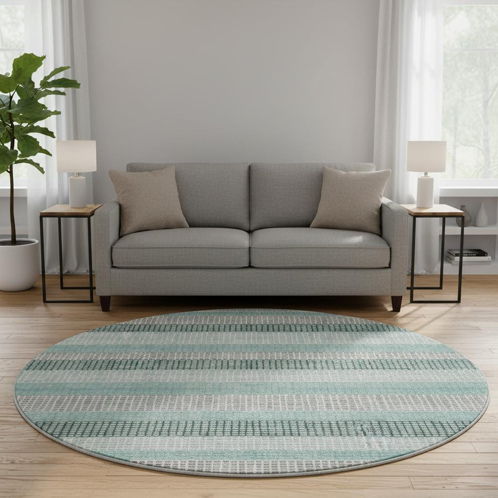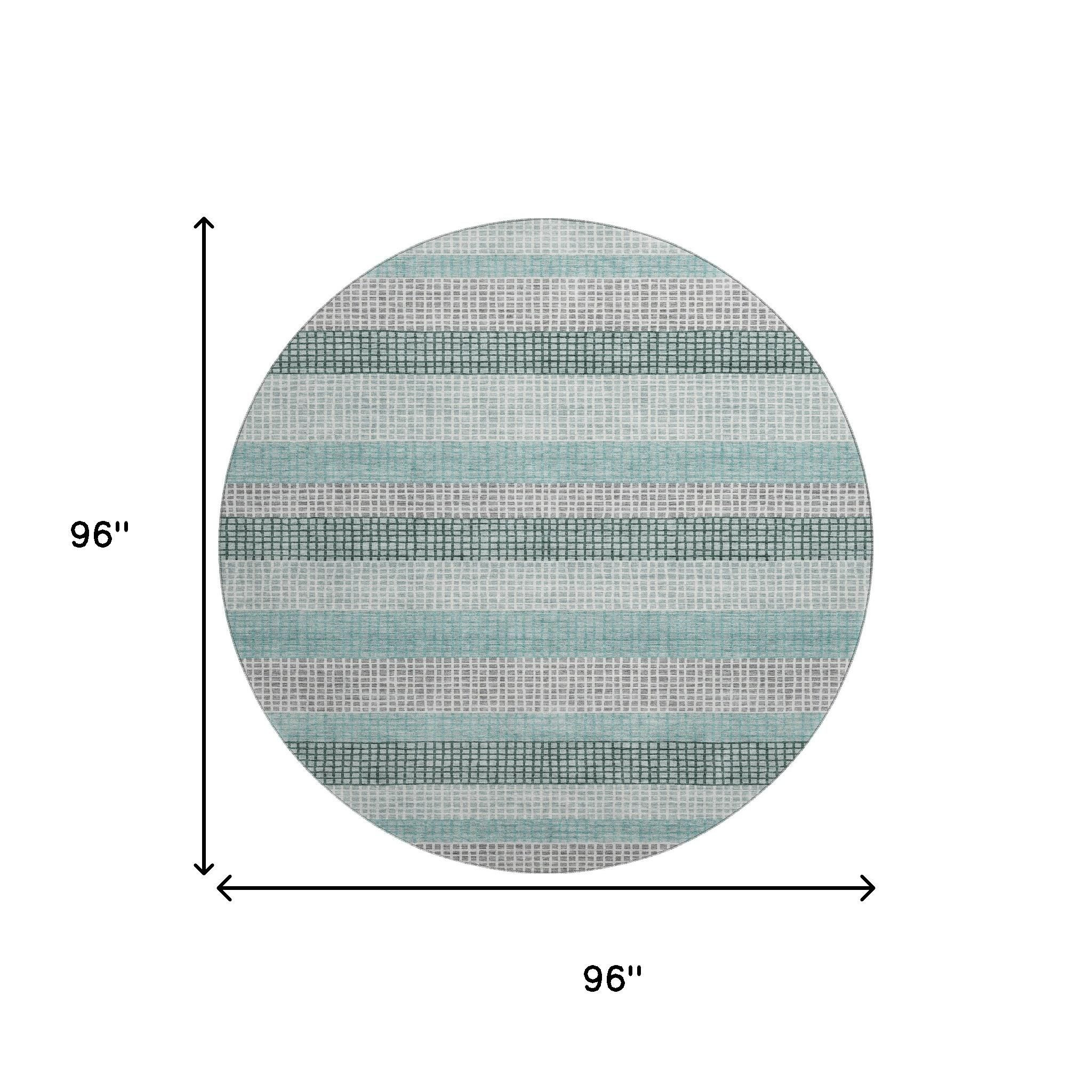 Add some artistry to your room with this 8-foot teal ivory and gray striped washable round rug with uv protection. Ideal for spaces with kids and pets, this rug is stain resistant to help repel dirt and spilled liquids. Built to last, this rug crafted from polyester fibers is known for its durability and long lasting appeal. Rugs are a great way to showcase your style, hide imperfections, warm your home and reduce noise. This larger sized, transitional styled rug is ready to create a focal point or statement piece in your room. 96.00-inch h x 96.00-inch w x 0.39-inch d.