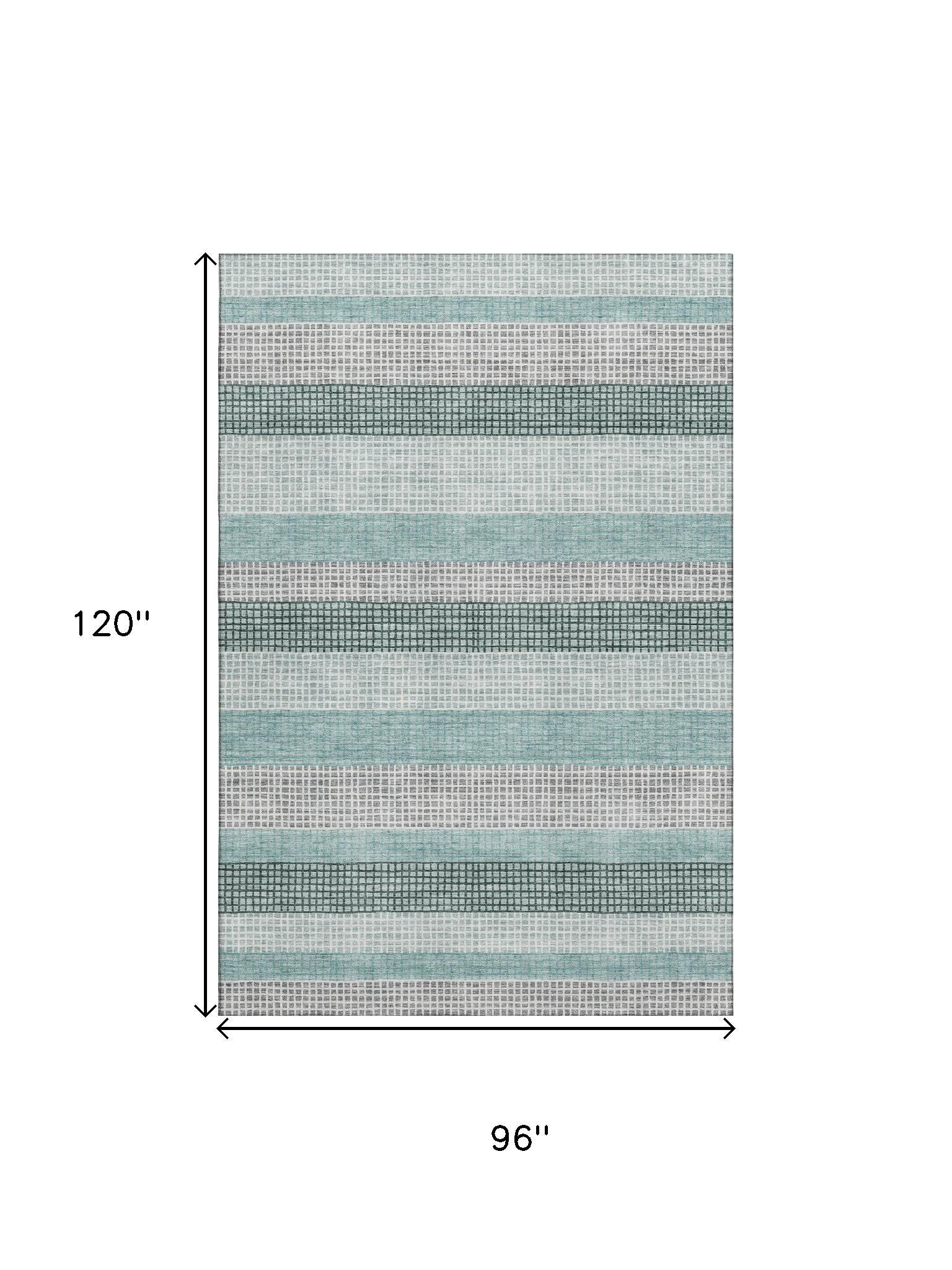 This 8-foot x 10-foot teal ivory and gray striped washable area rug with uv protection, is a great way to add warmth to a room. Ideal for spaces with kids and pets, this rug is stain resistant to help repel dirt and spilled liquids. Built to last, this rug crafted from polyester fibers is known for its durability and long lasting appeal. Rugs are a great way to showcase your style, hide imperfections, warm your home and reduce noise. This larger sized, transitional styled rug is ready to create a focal point or statement piece in your room. 96.00-inch h x 120.00-inch w x 0.39-inch d.