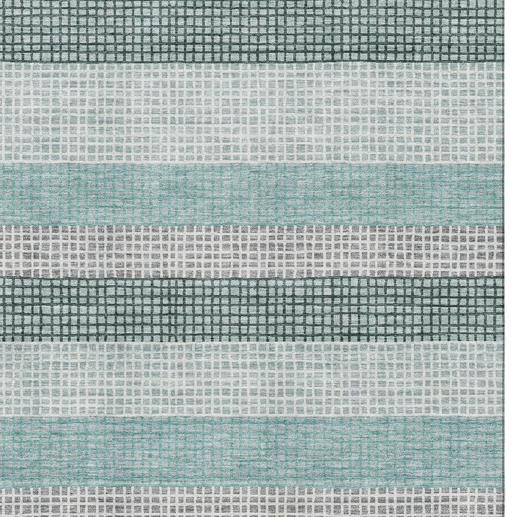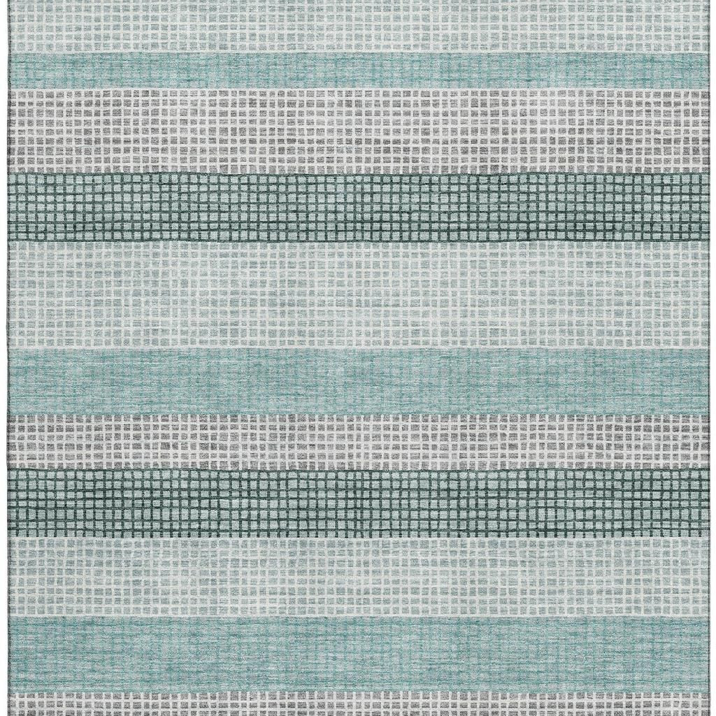 Set an inviting tone in your space with this 9-foot x 12-foot teal ivory and gray striped washable area rug with uv protection. Ideal for spaces with kids and pets, this rug is stain resistant to help repel dirt and spilled liquids. Built to last, this rug crafted from polyester fibers is known for its durability and long lasting appeal. Rugs are a great way to showcase your style, hide imperfections, warm your home and reduce noise. This larger sized, transitional styled rug is ready to create a focal point or statement piece in your room. 108.00-inch h x 144.00-inch w x 0.39-inch d.