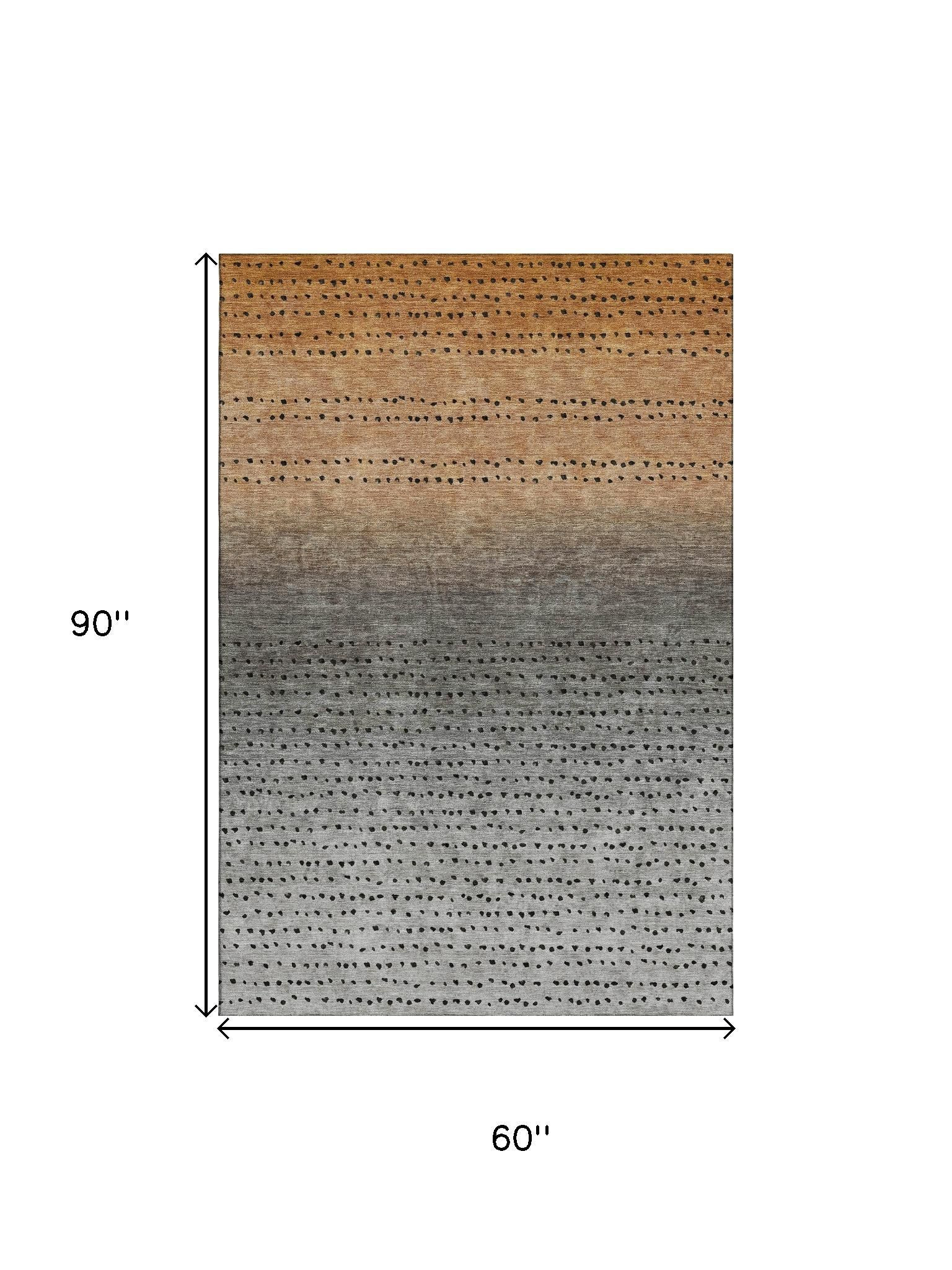 This 5-foot x 8-foot copper gray and silver abstract washable area rug with uv protection, is a great way to add warmth to a room. Ideal for spaces with kids and pets, this rug is stain resistant to help repel dirt and spilled liquids. Built to last, this rug crafted from polyester fibers is known for its durability and long lasting appeal. Rugs are a great way to showcase your style, hide imperfections, warm your home and reduce noise. This larger sized, transitional styled rug is ready to create a focal point or statement piece in your room. 60.00-inch h x 90.00-inch w x 0.39-inch d.