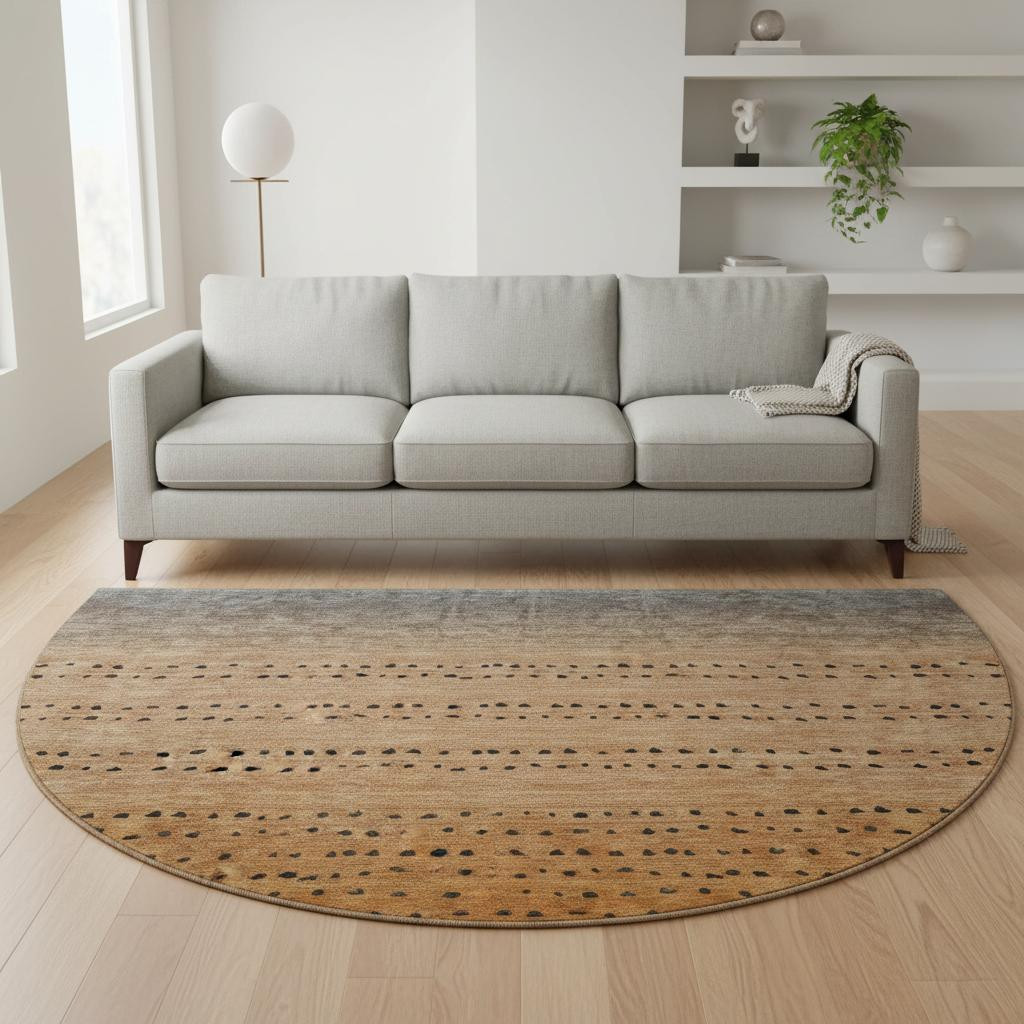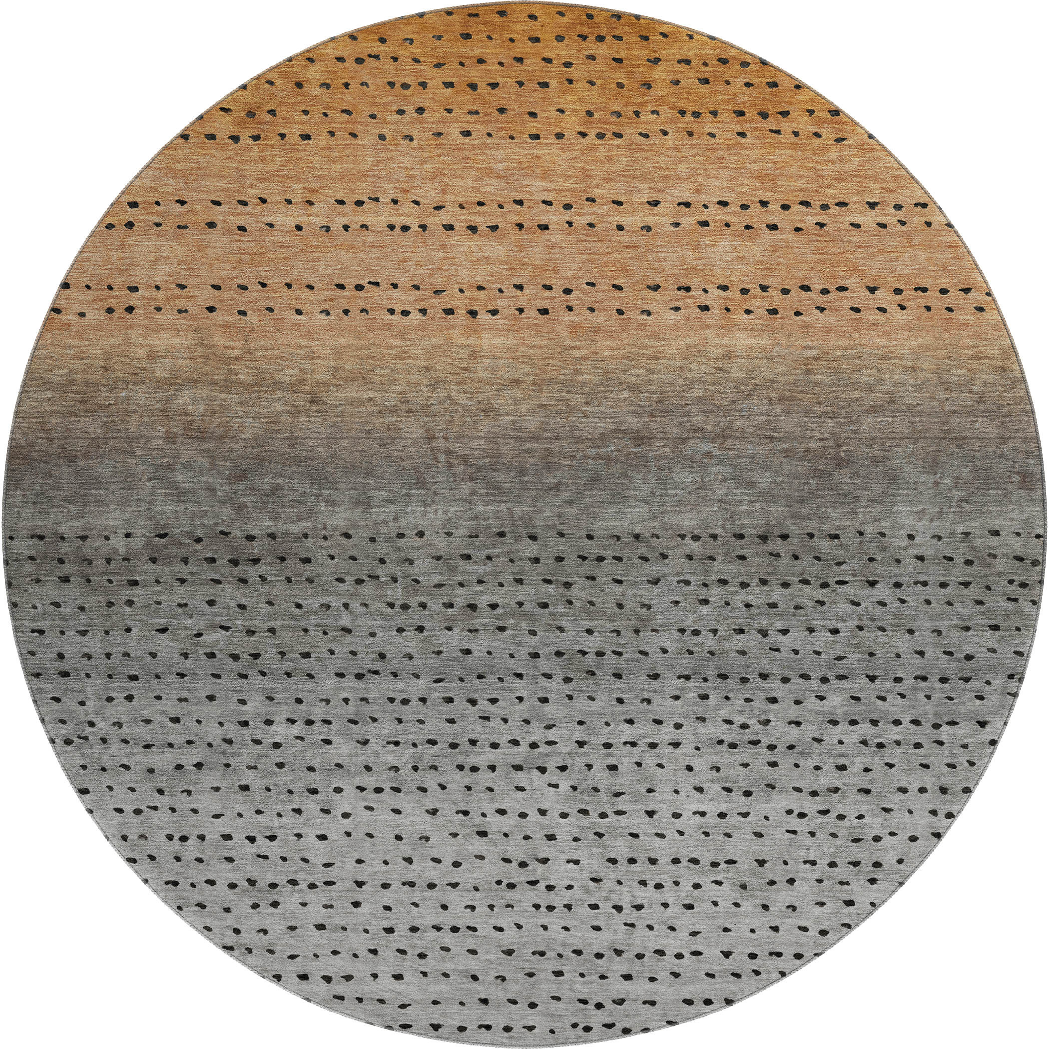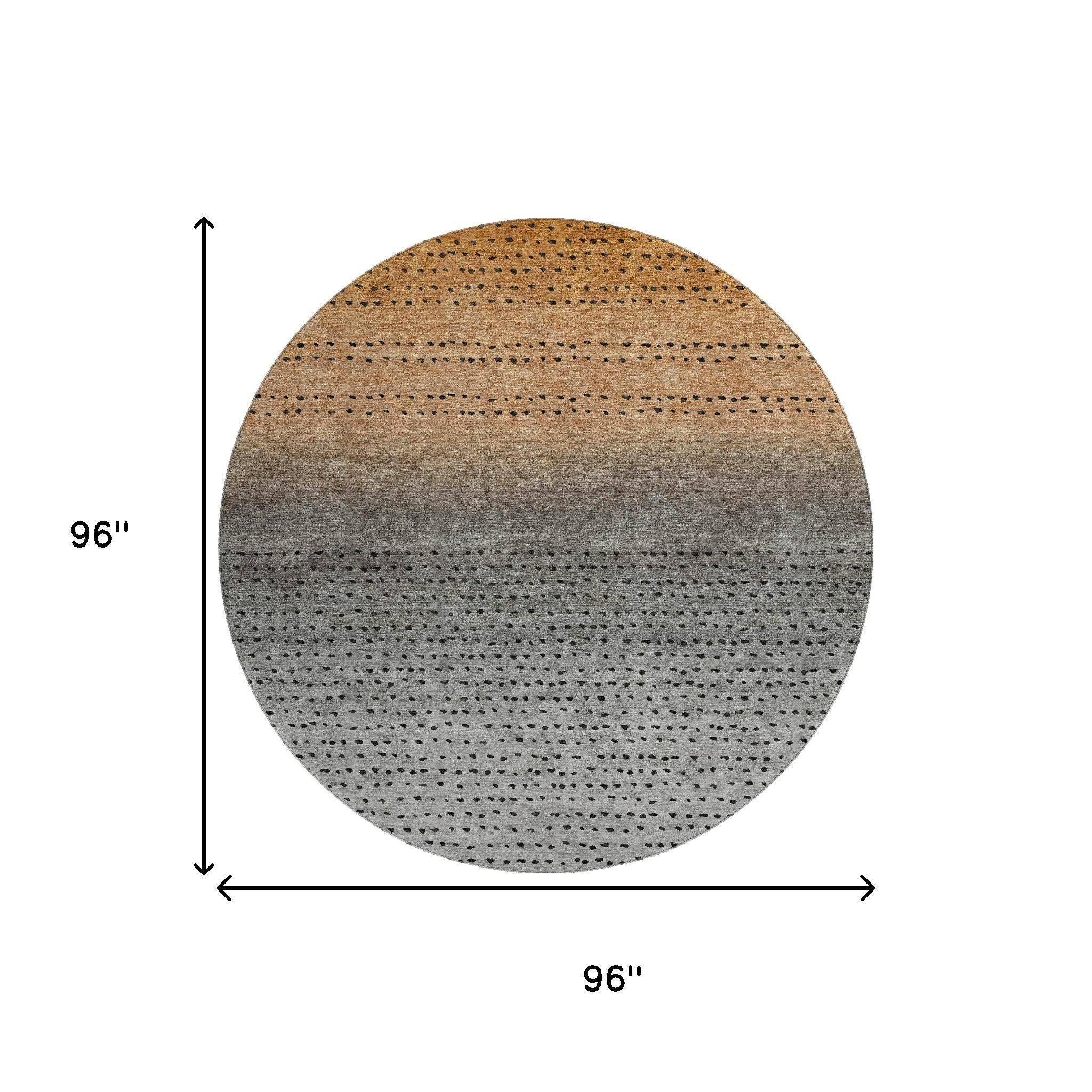 This 8-foot copper gray and silver abstract washable round rug with uv protection, is a great way to add warmth to a room. Ideal for spaces with kids and pets, this rug is stain resistant to help repel dirt and spilled liquids. Built to last, this rug crafted from polyester fibers is known for its durability and long lasting appeal. Rugs are a great way to showcase your style, hide imperfections, warm your home and reduce noise. This larger sized, transitional styled rug is ready to create a focal point or statement piece in your room. 96.00-inch h x 96.00-inch w x 0.39-inch d.