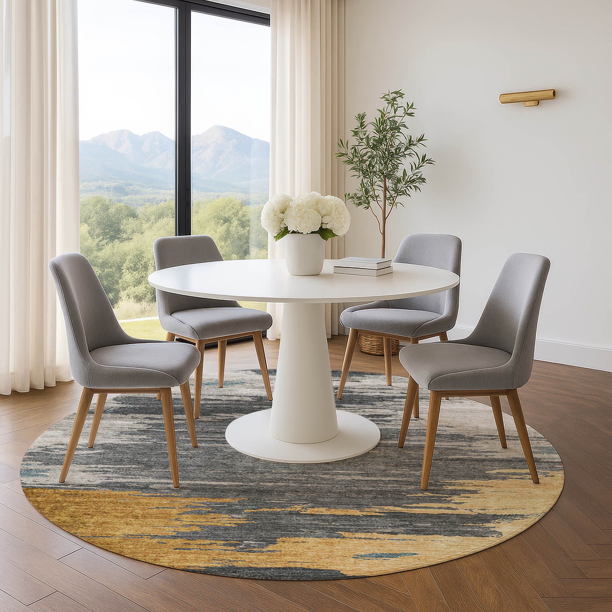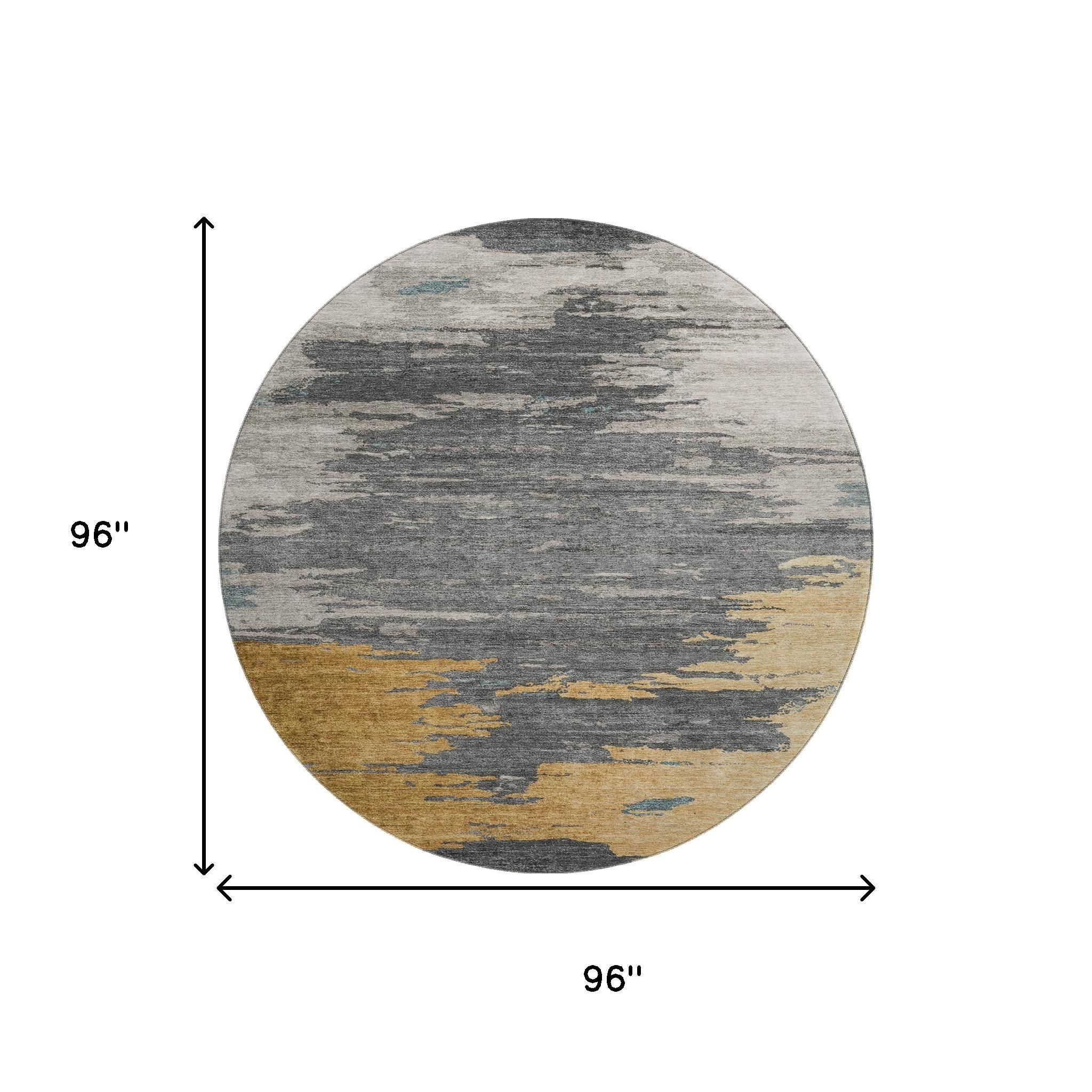 Add great coloration and comfortable texture to your space with this 8-foot gold charcoal and gray abstract washable round rug with uv protection. Ideal for spaces with kids and pets, this rug is stain resistant to help repel dirt and spilled liquids. Built to last, this rug crafted from polyester fibers is known for its durability and long lasting appeal. Rugs are a great way to showcase your style, hide imperfections, warm your home and reduce noise. This larger sized, transitional styled rug is ready to create a focal point or statement piece in your room. 96.00-inch h x 96.00-inch w x 0.39-inch d.