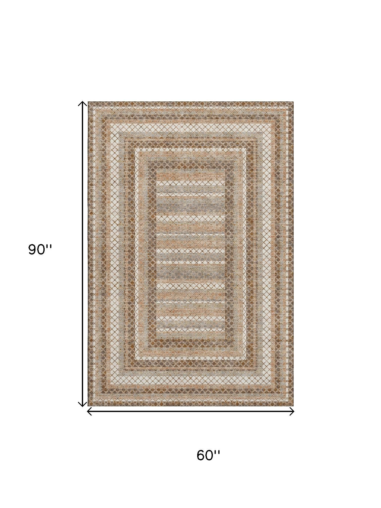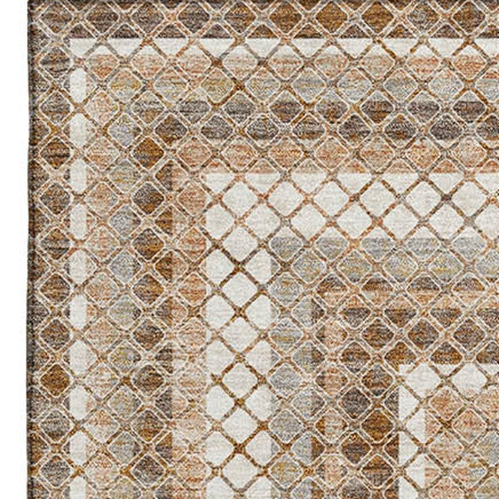 Add some artistry to your room with this 5-foot x 8-foot chocolate ivory and beige geometric washable area rug with uv protection. Ideal for spaces with kids and pets, this rug is stain resistant to help repel dirt and spilled liquids. Built to last, this rug crafted from polyester fibers is known for its durability and long lasting appeal. Rugs are a great way to showcase your style, hide imperfections, warm your home and reduce noise. This larger sized, transitional styled rug is ready to create a focal point or statement piece in your room. 60.00-inch h x 90.00-inch w x 0.39-inch d.