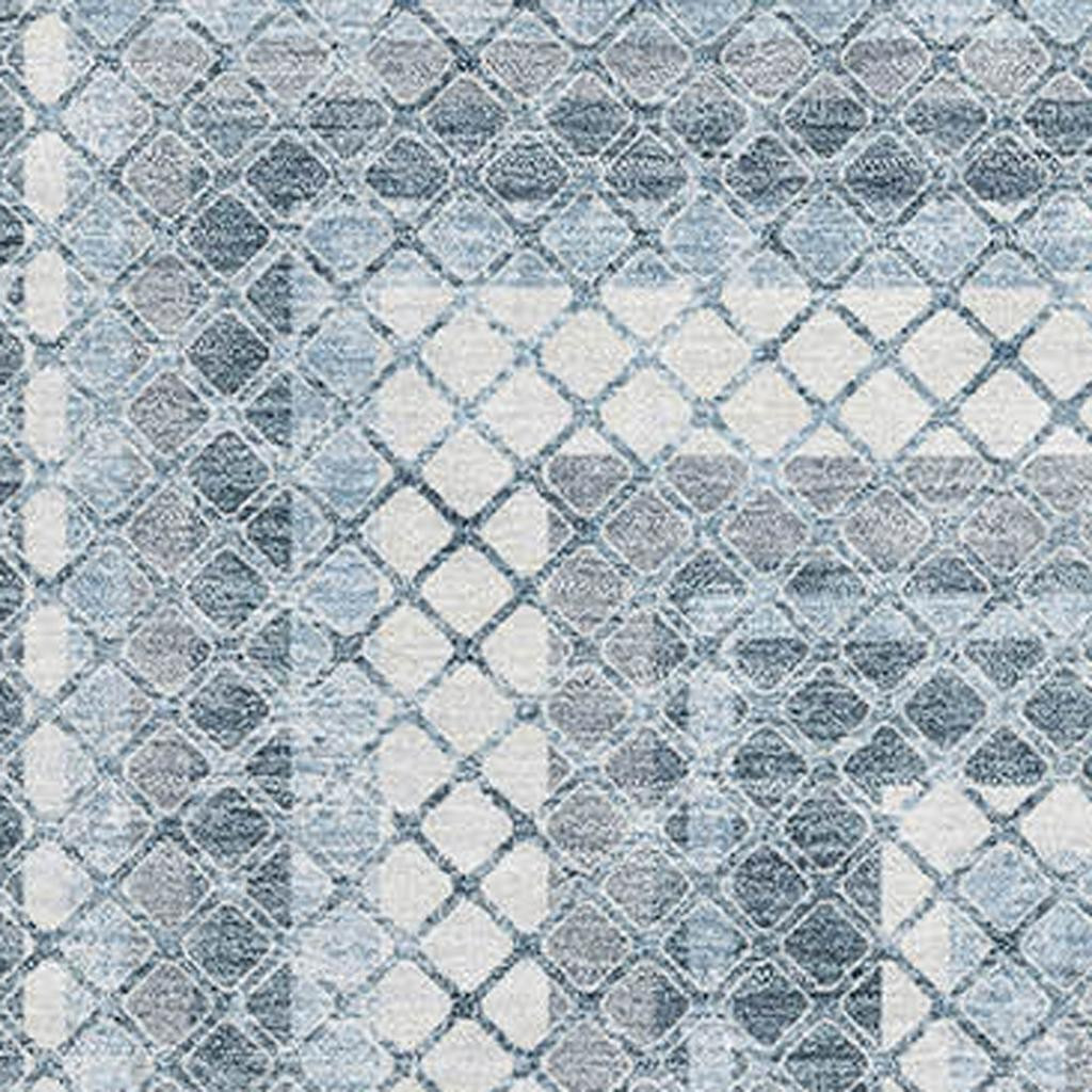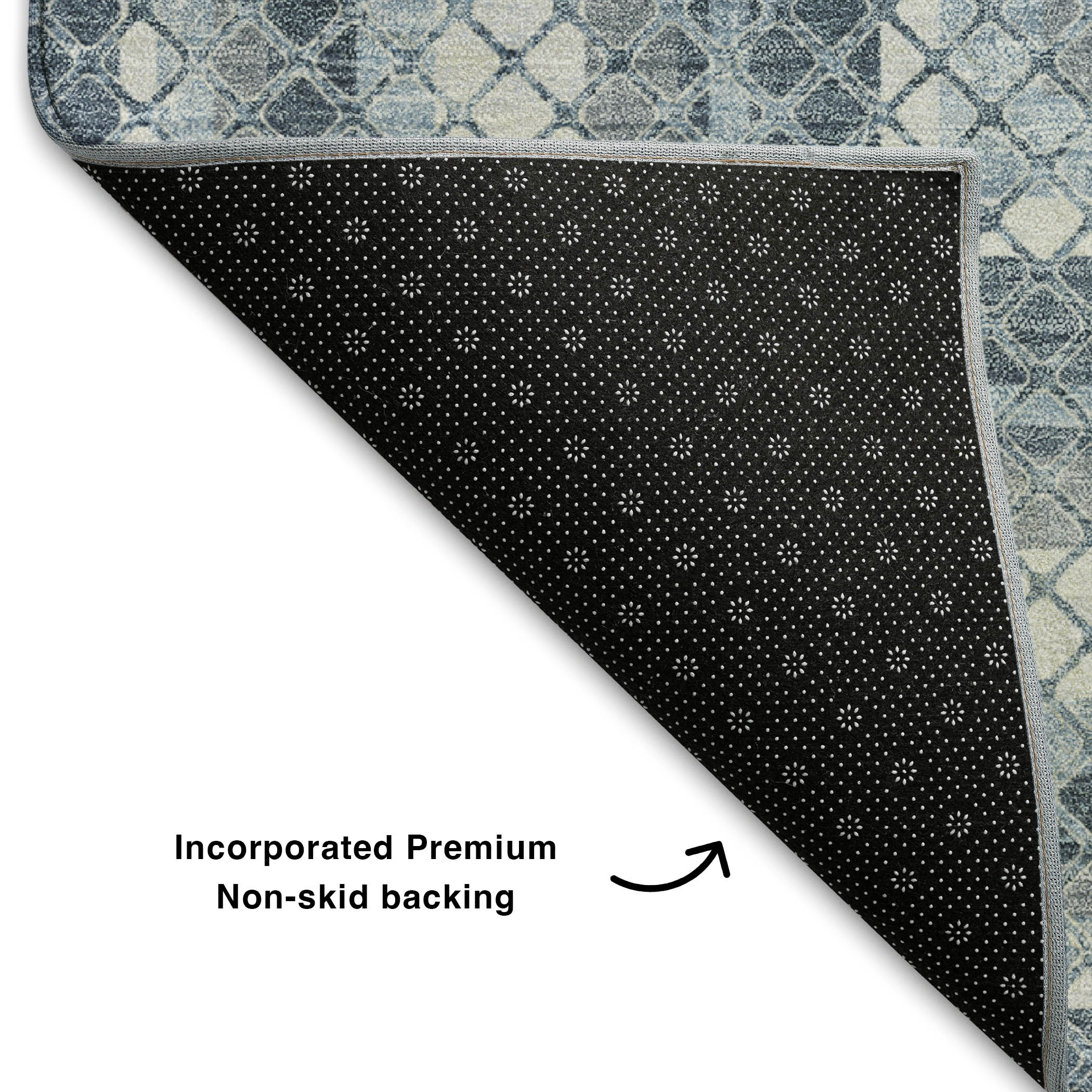 Add some artistry to your room with this 8-foot x 10-foot denim blue and ivory geometric washable area rug with uv protection. Ideal for spaces with kids and pets, this rug is stain resistant to help repel dirt and spilled liquids. Built to last, this rug crafted from polyester fibers is known for its durability and long lasting appeal. Rugs are a great way to showcase your style, hide imperfections, warm your home and reduce noise. This larger sized, transitional styled rug is ready to create a focal point or statement piece in your room. 96.00-inch h x 120.00-inch w x 0.39-inch d.