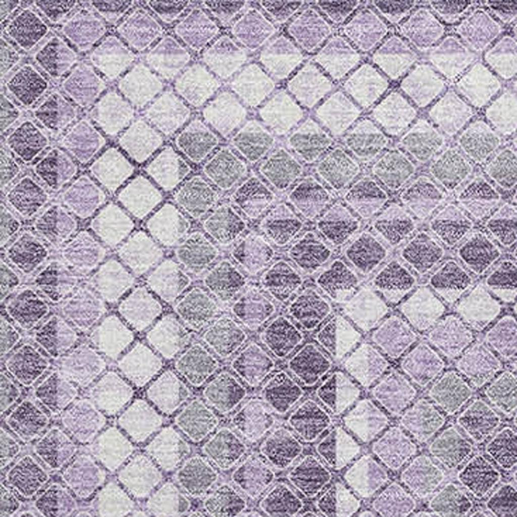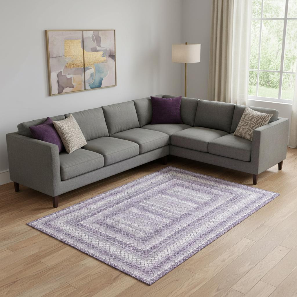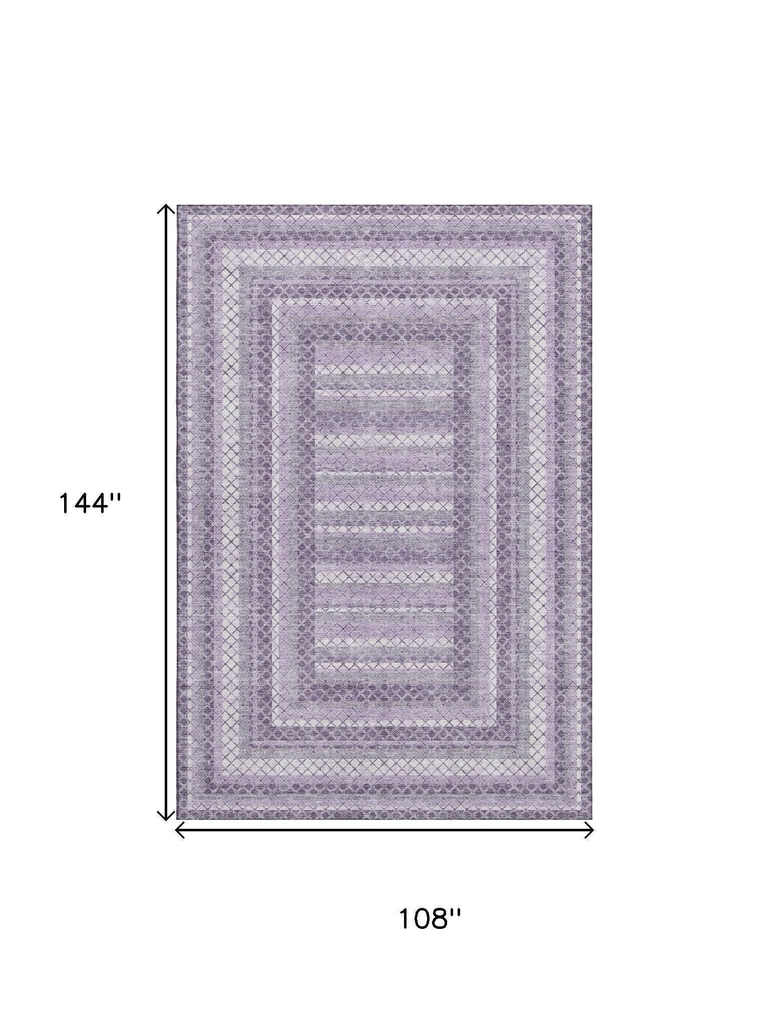 Add some artistry to your room with this 9-foot x 12-foot lavender and ivory geometric washable area rug with uv protection. Ideal for spaces with kids and pets, this rug is stain resistant to help repel dirt and spilled liquids. Built to last, this rug crafted from polyester fibers is known for its durability and long lasting appeal. Rugs are a great way to showcase your style, hide imperfections, warm your home and reduce noise. This larger sized, transitional styled rug is ready to create a focal point or statement piece in your room. 108.00-inch h x 144.00-inch w x 0.39-inch d.