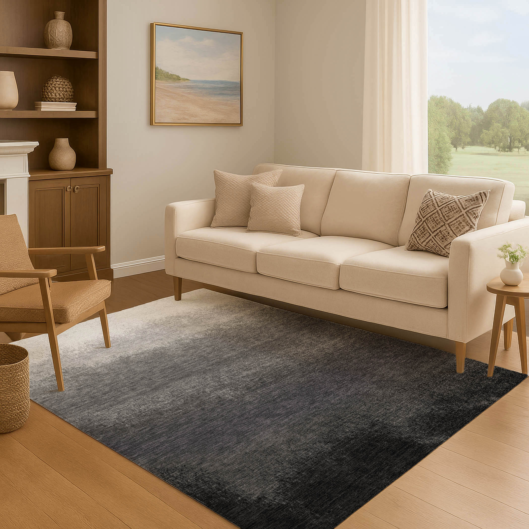 This 9-foot x 12-foot gray black and silver ombre washable area rug with uv protection, is a great way to add warmth to a room. Ideal for spaces with kids and pets, this rug is stain resistant to help repel dirt and spilled liquids. Built to last, this rug crafted from polyester fibers is known for its durability and long lasting appeal. Rugs are a great way to showcase your style, hide imperfections, warm your home and reduce noise. This larger sized, transitional styled rug is ready to create a focal point or statement piece in your room. 108.00-inch h x 144.00-inch w x 0.39-inch d.