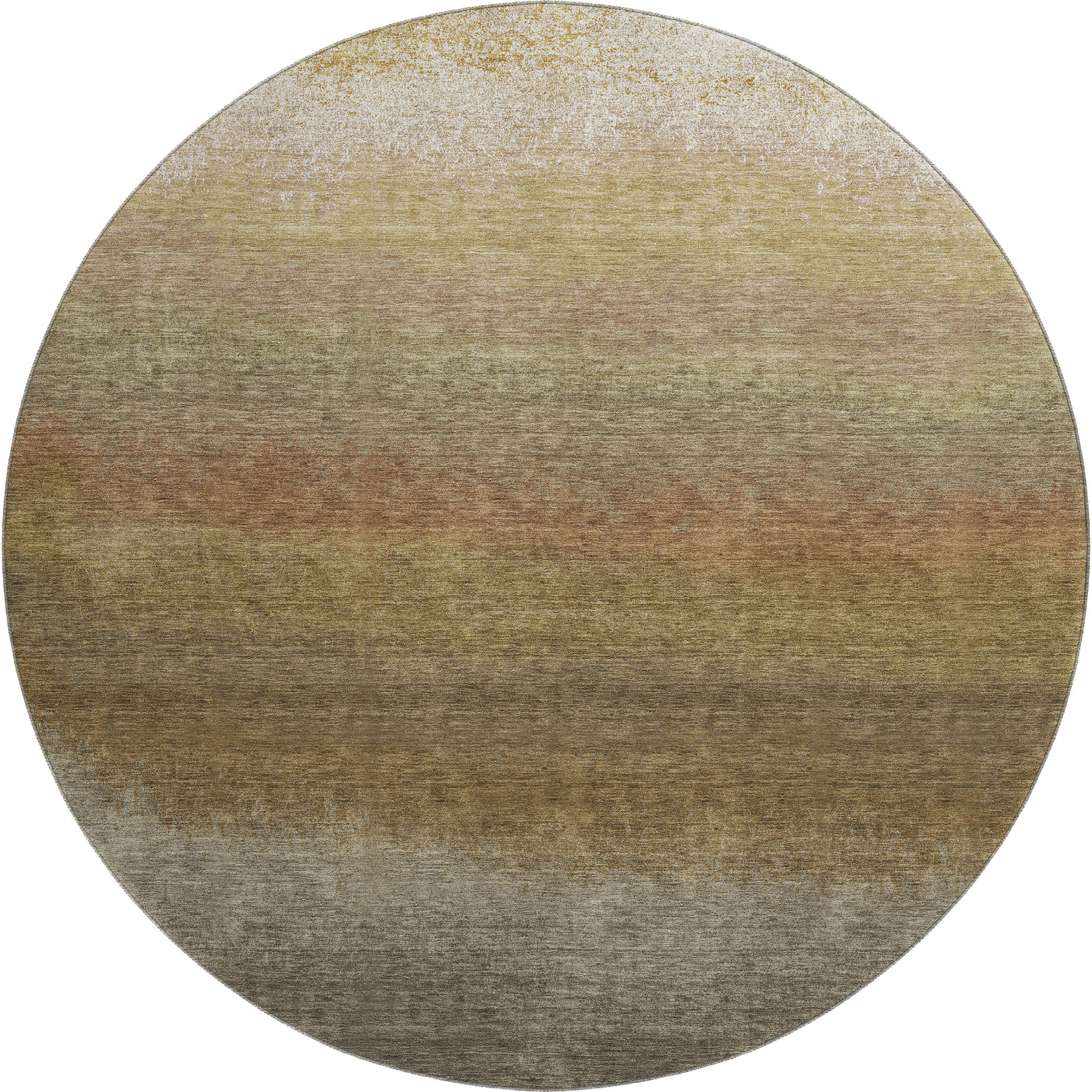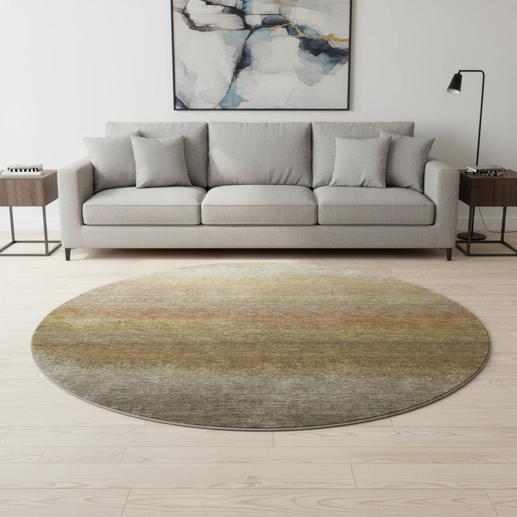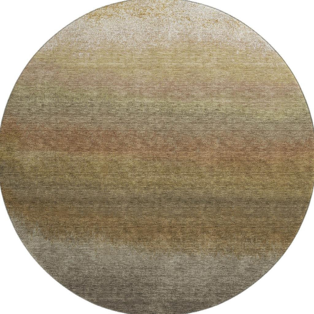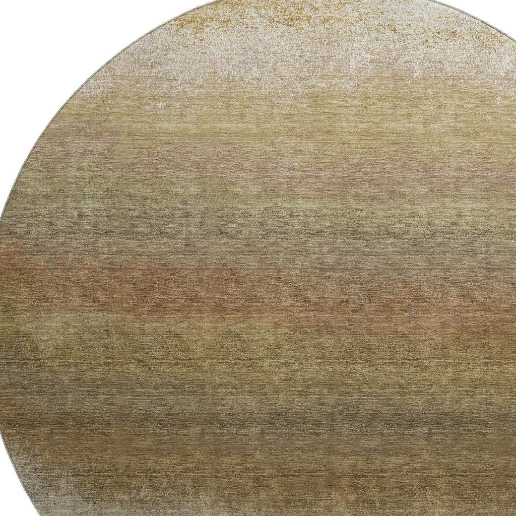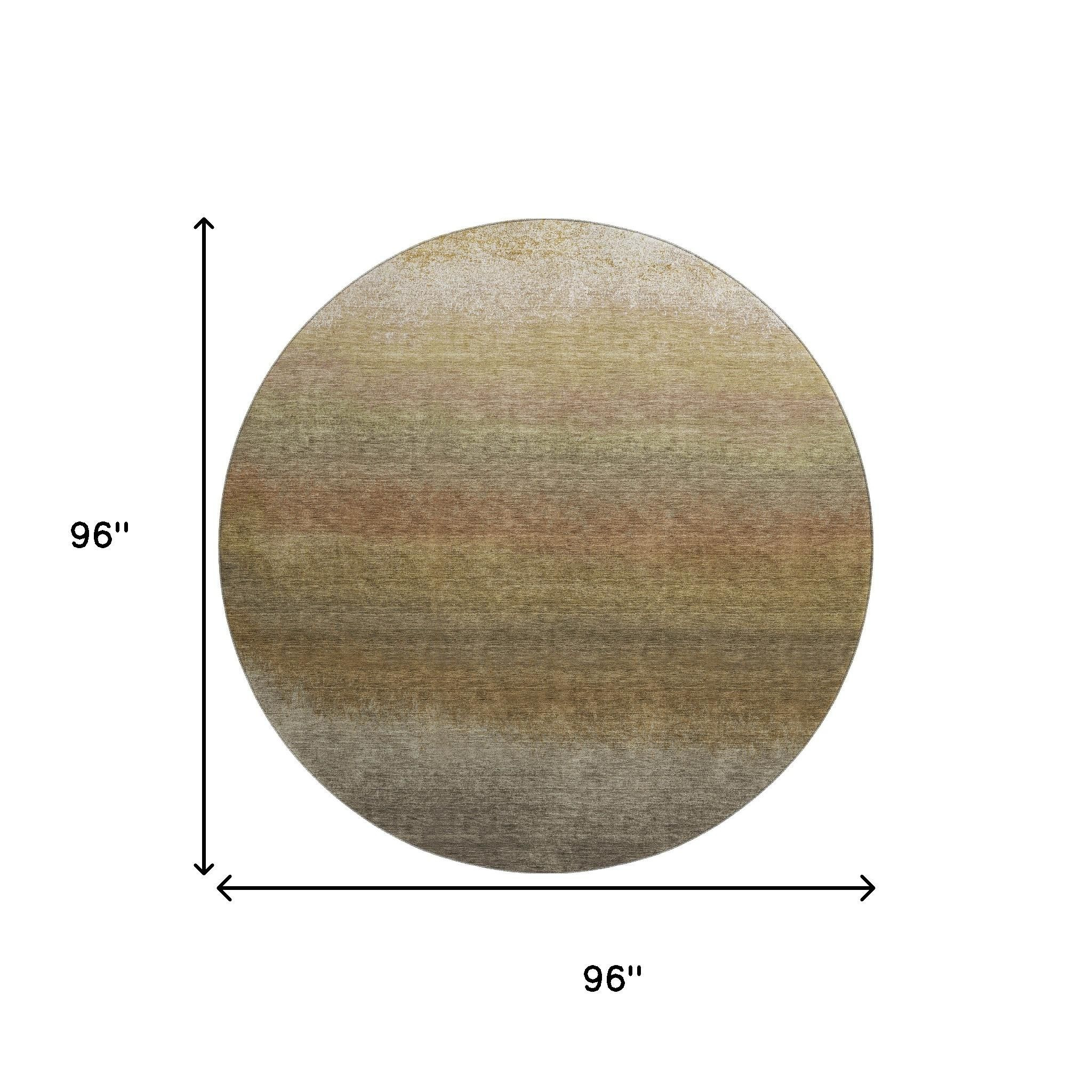 Add great coloration and comfortable texture to your space with this 8-foot taupe beige and gold ombre washable round rug with uv protection. Ideal for spaces with kids and pets, this rug is stain resistant to help repel dirt and spilled liquids. Built to last, this rug crafted from polyester fibers is known for its durability and long lasting appeal. Rugs are a great way to showcase your style, hide imperfections, warm your home and reduce noise. This larger sized, transitional styled rug is ready to create a focal point or statement piece in your room. 96.00-inch h x 96.00-inch w x 0.39-inch d.