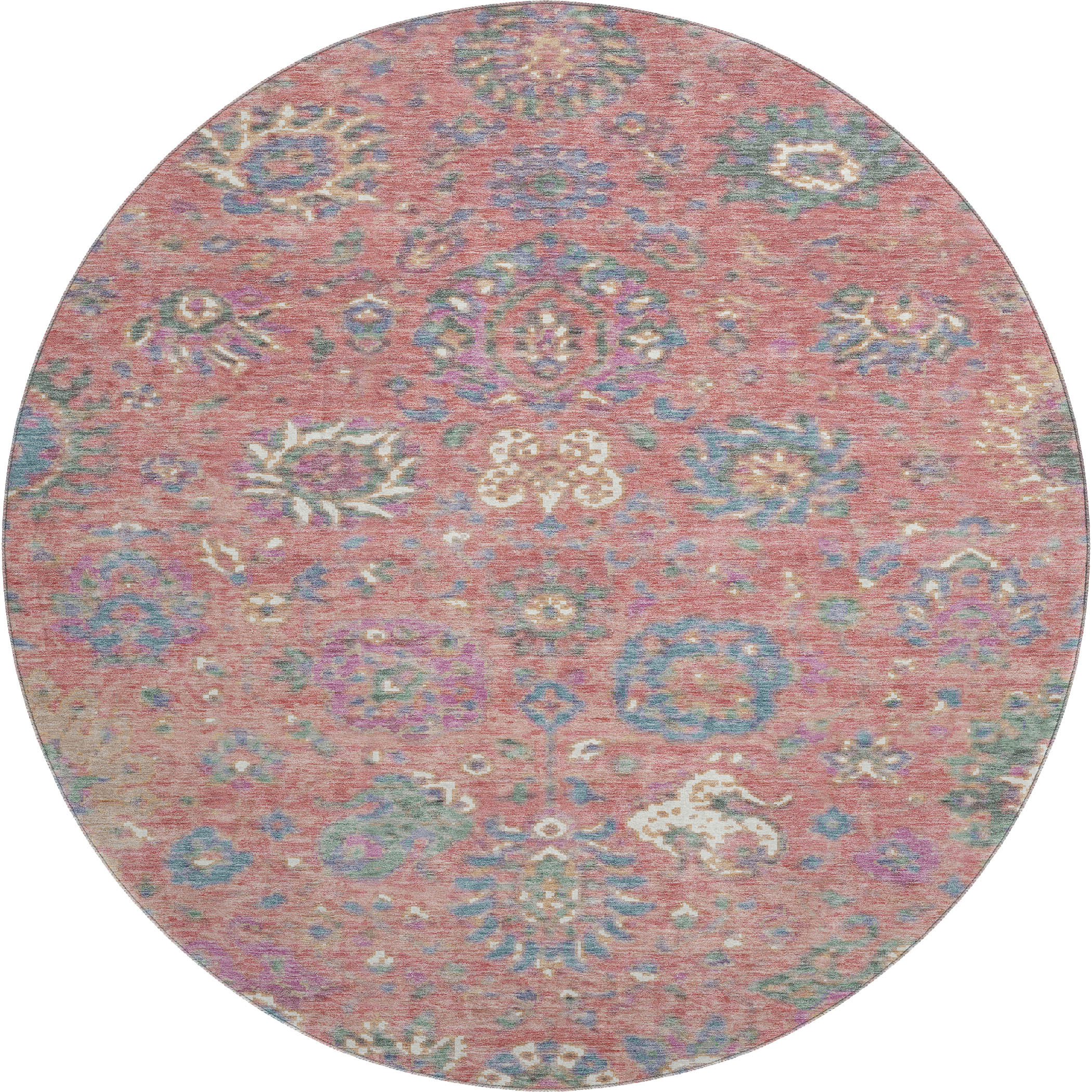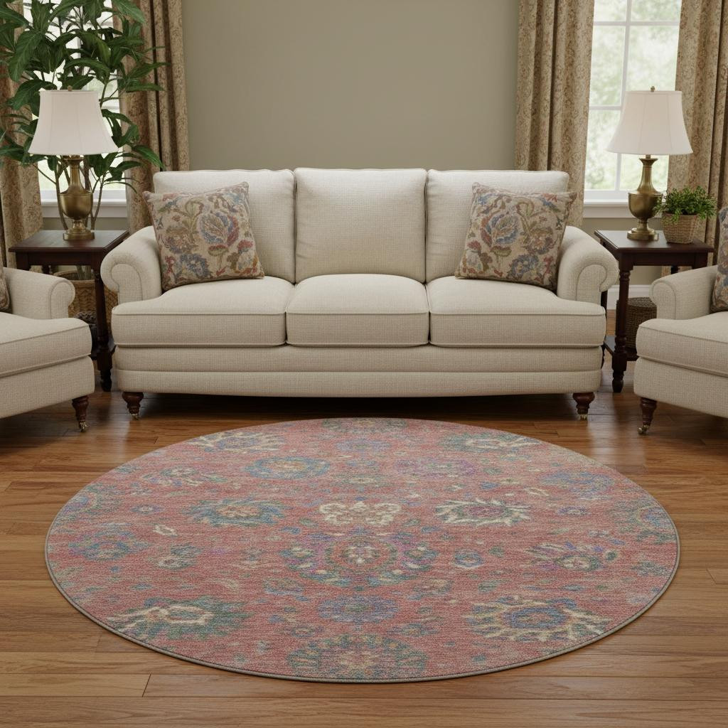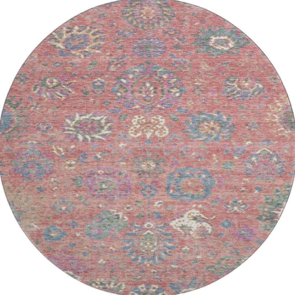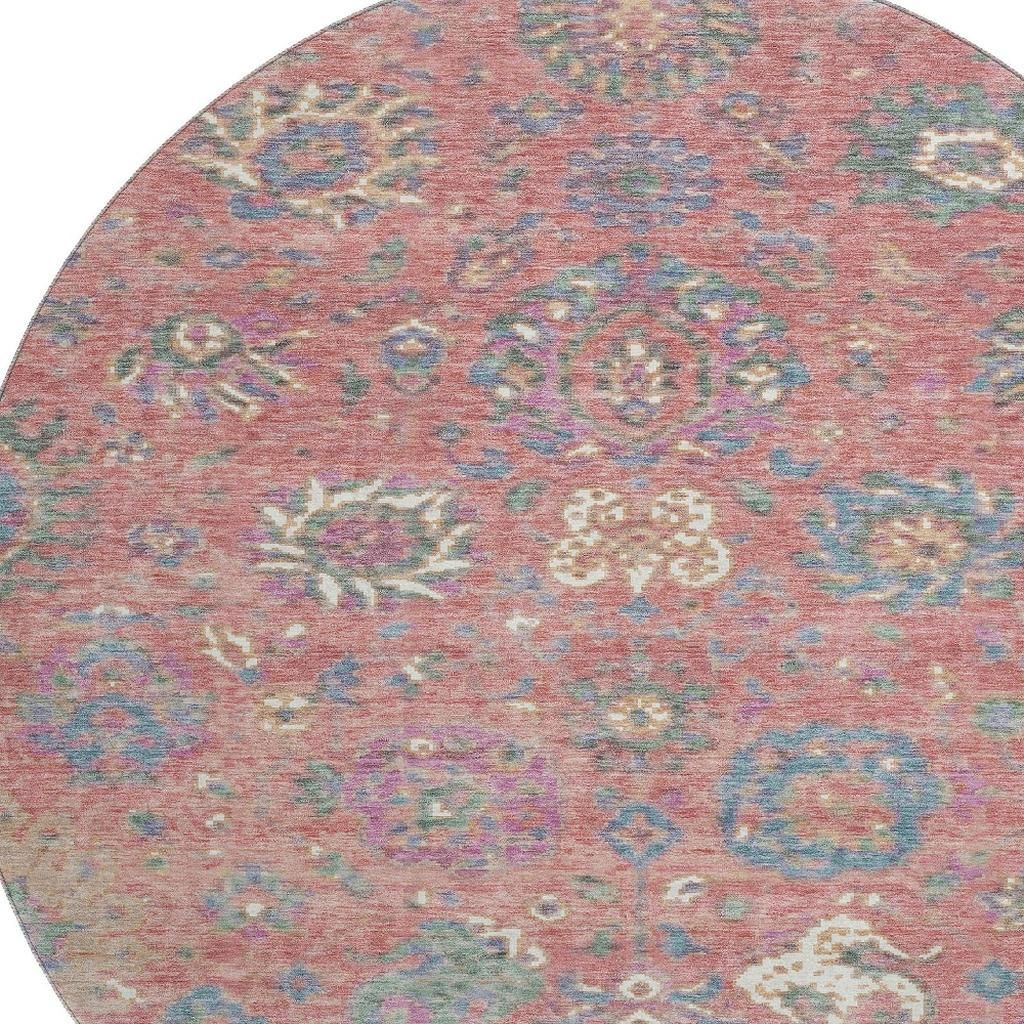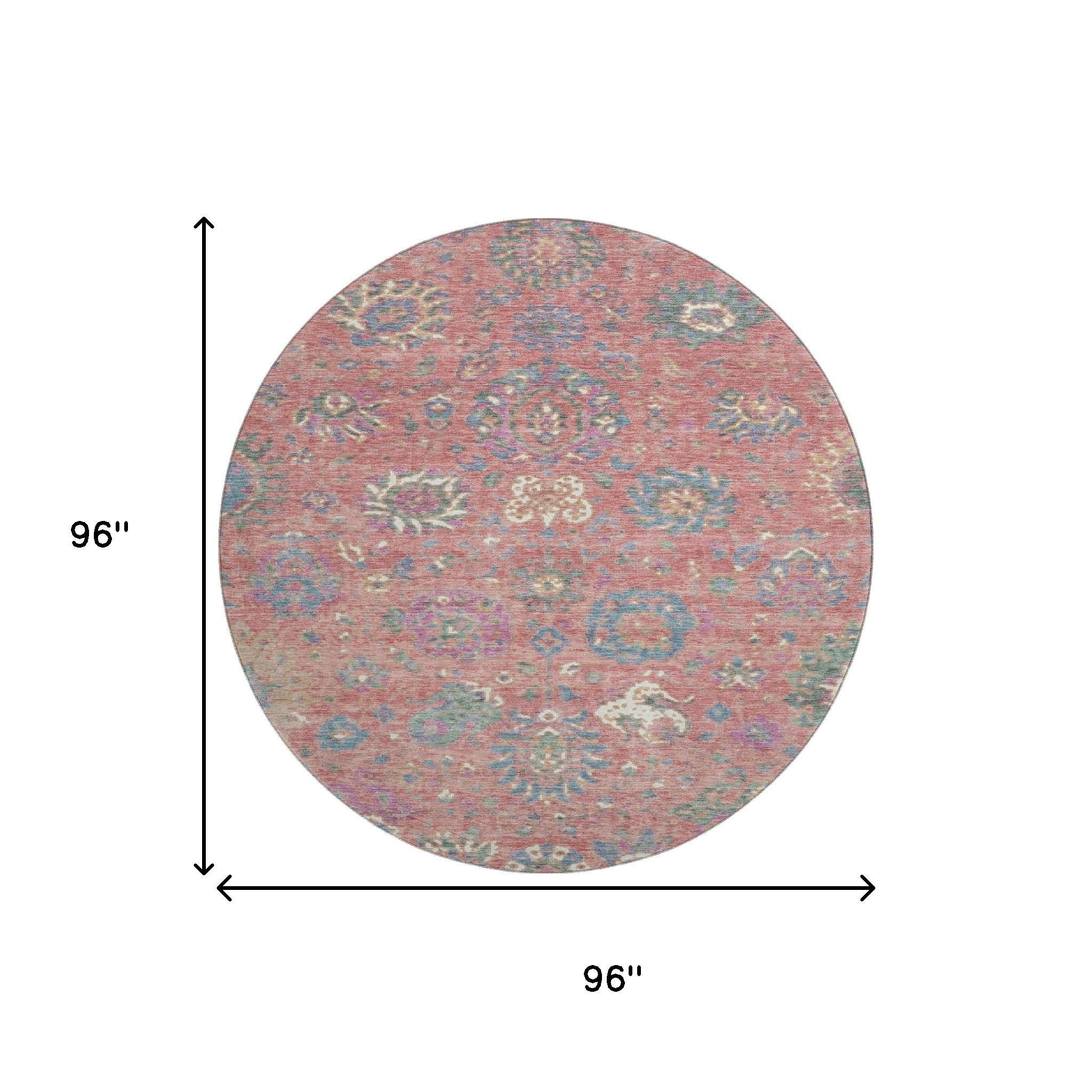 Set an inviting tone in your space with this 8-foot coral blue and ivory oriental washable round rug with uv protection. Ideal for spaces with kids and pets, this rug is stain resistant to help repel dirt and spilled liquids. Built to last, this rug crafted from polyester fibers is known for its durability and long lasting appeal. Rugs are a great way to showcase your style, hide imperfections, warm your home and reduce noise. This larger sized, traditional styled rug is ready to create a focal point or statement piece in your room. 96.00-inch h x 96.00-inch w x 0.39-inch d.
