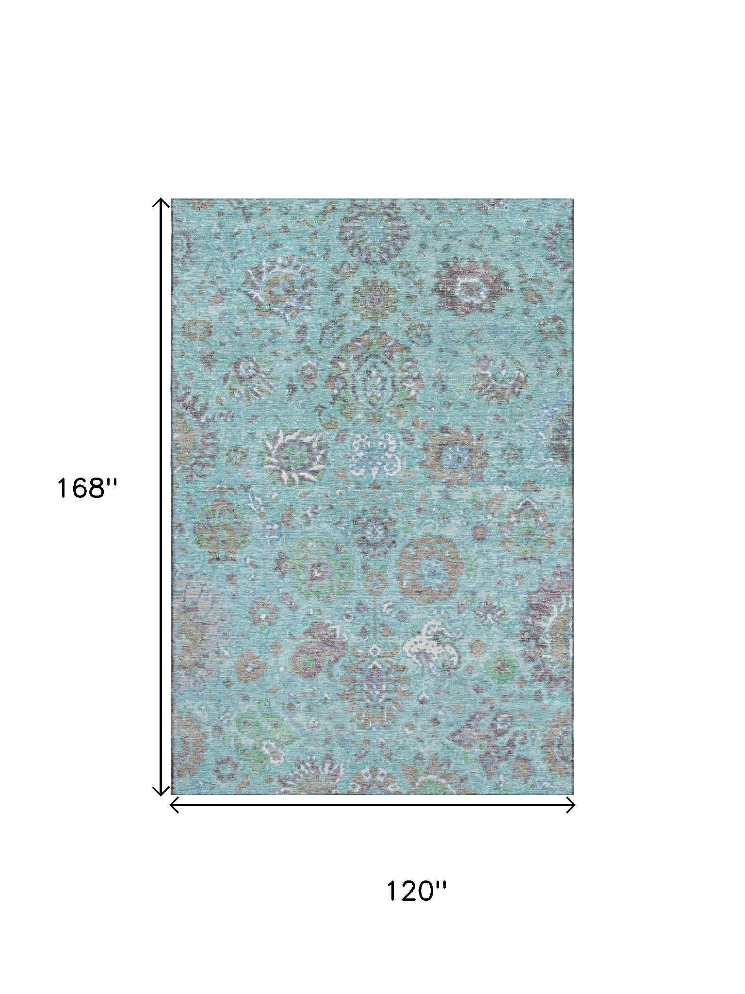 Add some artistry to your room with this 10-foot x 14-foot teal gray and ivory oriental washable area rug with uv protection. Ideal for spaces with kids and pets, this rug is stain resistant to help repel dirt and spilled liquids. Built to last, this rug crafted from polyester fibers is known for its durability and long lasting appeal. Rugs are a great way to showcase your style, hide imperfections, warm your home and reduce noise. This larger sized, traditional styled rug is ready to create a focal point or statement piece in your room. 120.00-inch h x 168.00-inch w x 0.39-inch d.