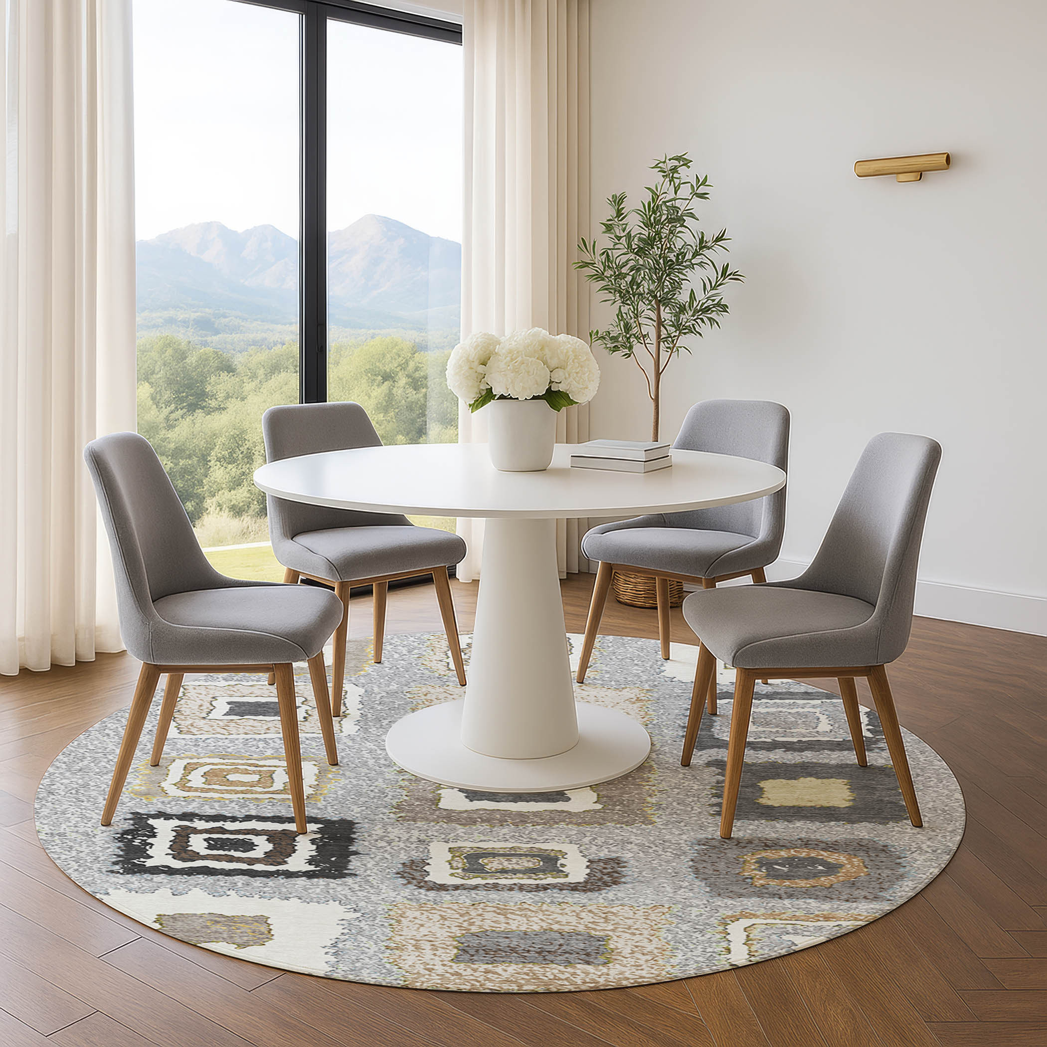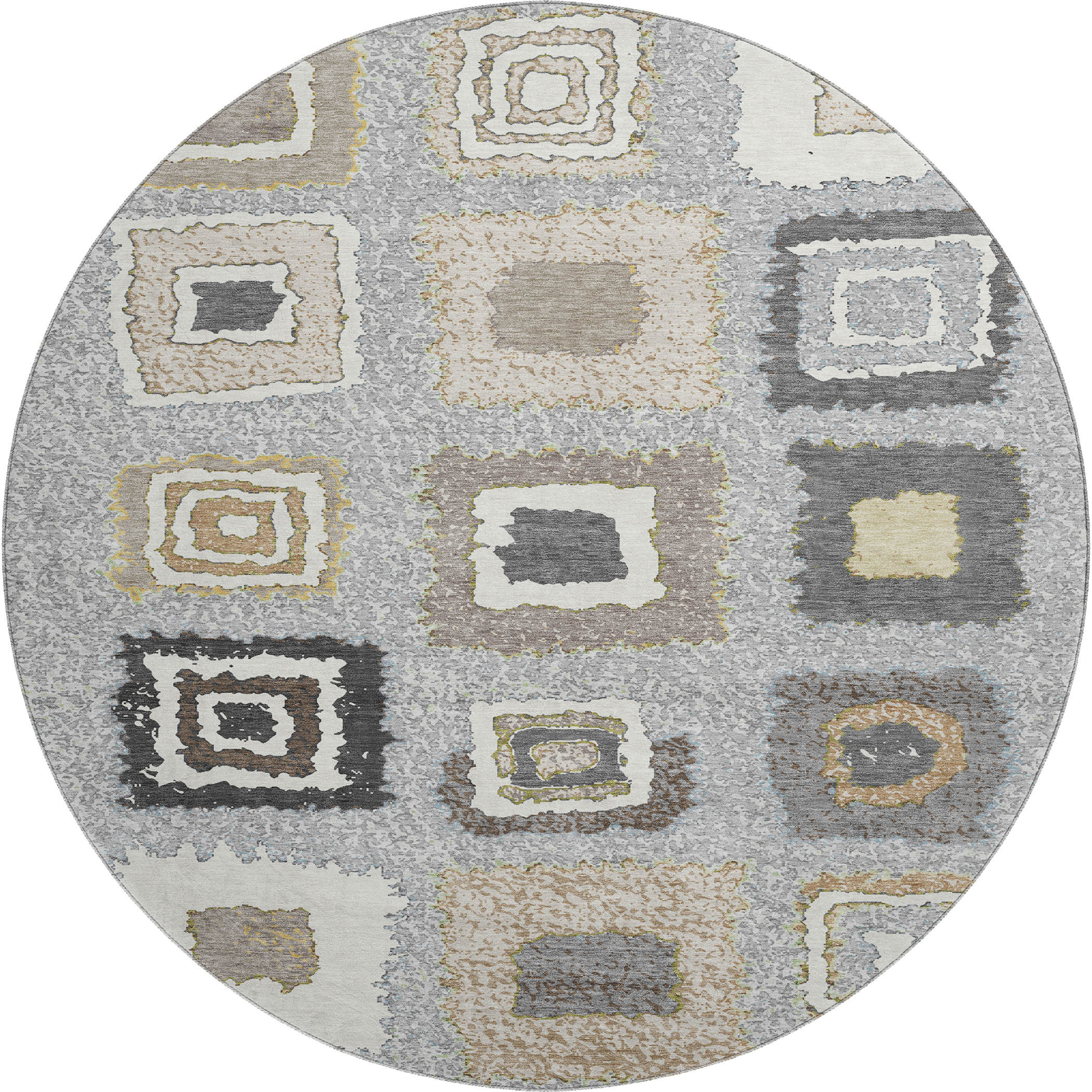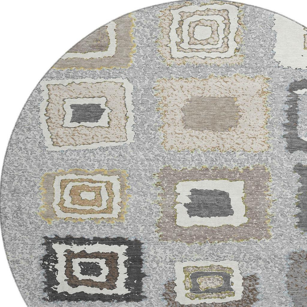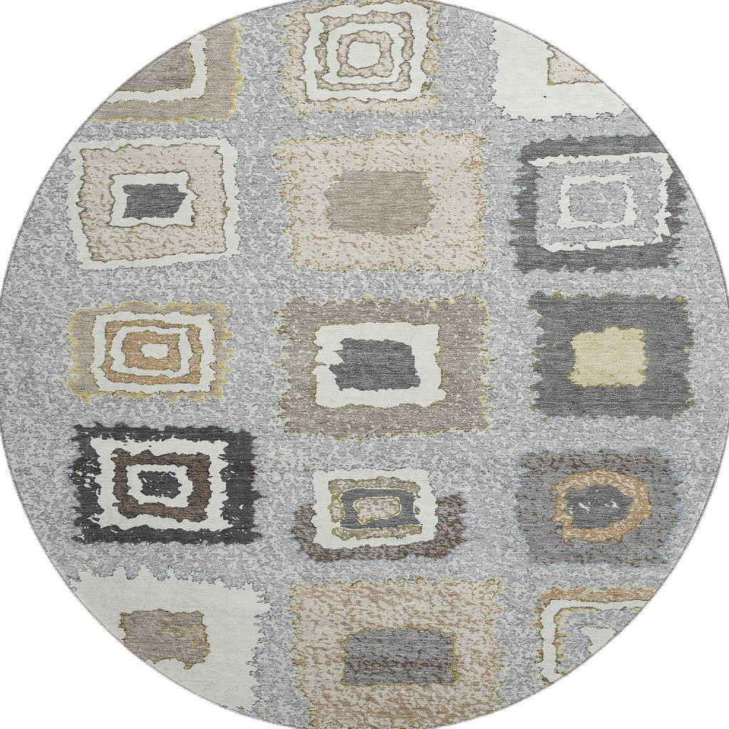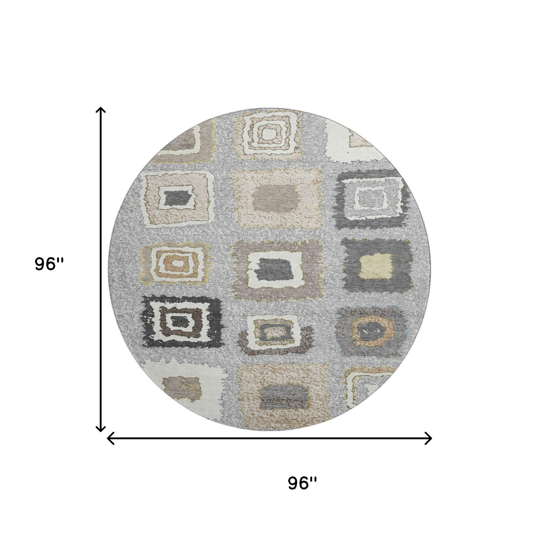 This 8-foot gray ivory and beige geometric washable round rug with uv protection, is a great way to add warmth to a room. Ideal for spaces with kids and pets, this rug is stain resistant to help repel dirt and spilled liquids. Built to last, this rug crafted from polyester fibers is known for its durability and long lasting appeal. Rugs are a great way to showcase your style, hide imperfections, warm your home and reduce noise. This larger sized, transitional styled rug is ready to create a focal point or statement piece in your room. 96.00-inch h x 96.00-inch w x 0.39-inch d.