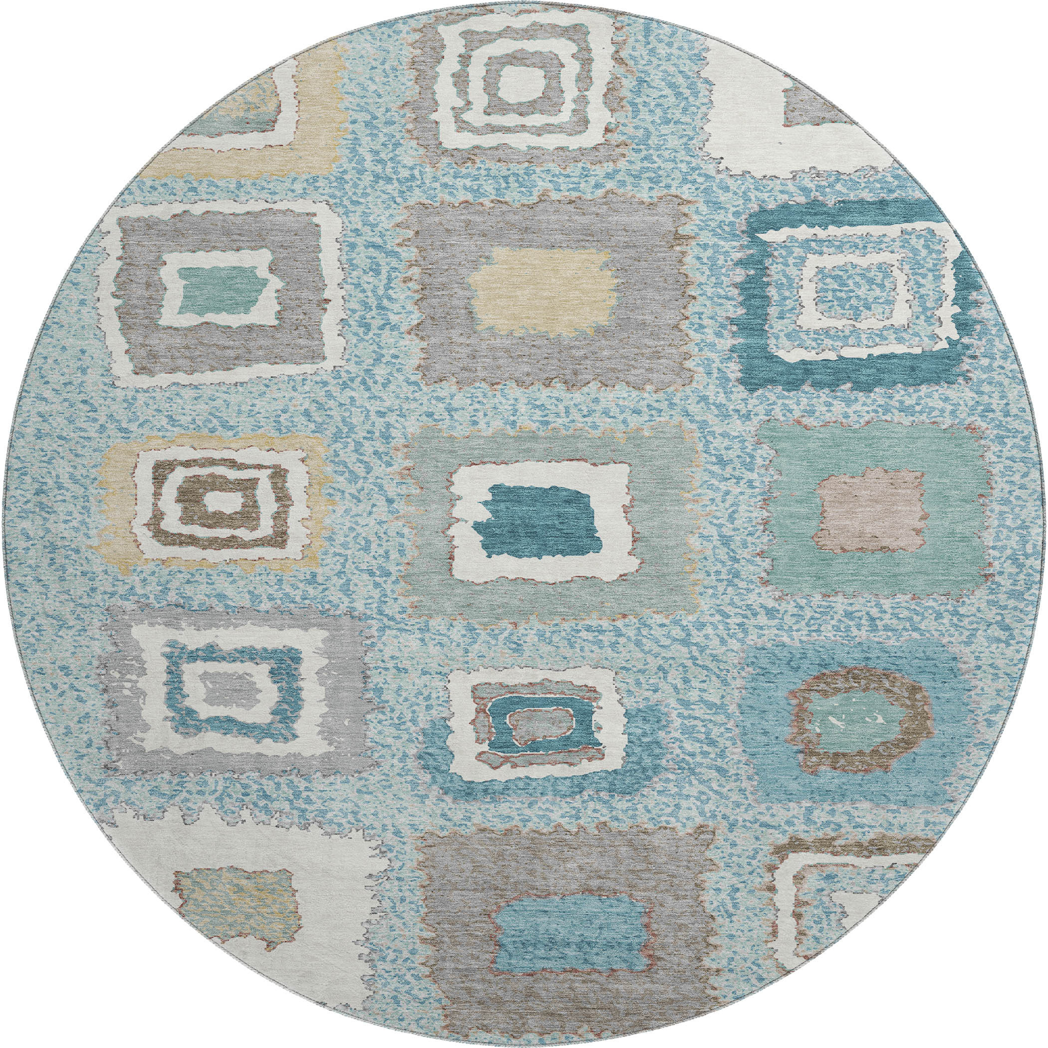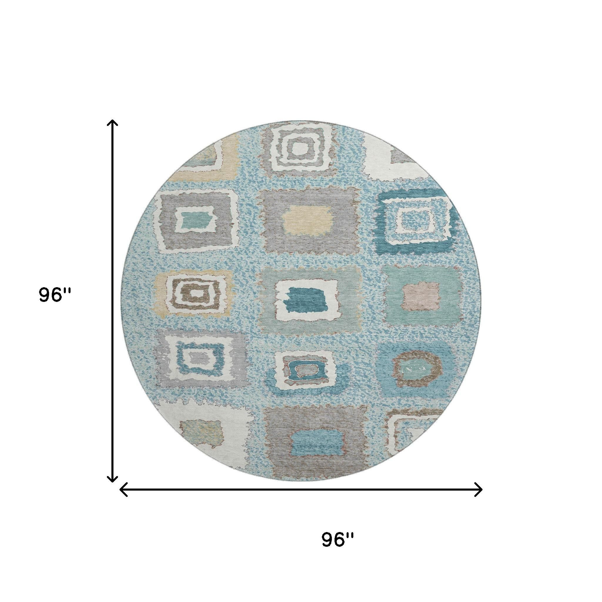 Add some artistry to your room with this 8-foot teal ivory and beige geometric washable round rug with uv protection. Ideal for spaces with kids and pets, this rug is stain resistant to help repel dirt and spilled liquids. Built to last, this rug crafted from polyester fibers is known for its durability and long lasting appeal. Rugs are a great way to showcase your style, hide imperfections, warm your home and reduce noise. This larger sized, transitional styled rug is ready to create a focal point or statement piece in your room. 96.00-inch h x 96.00-inch w x 0.39-inch d.