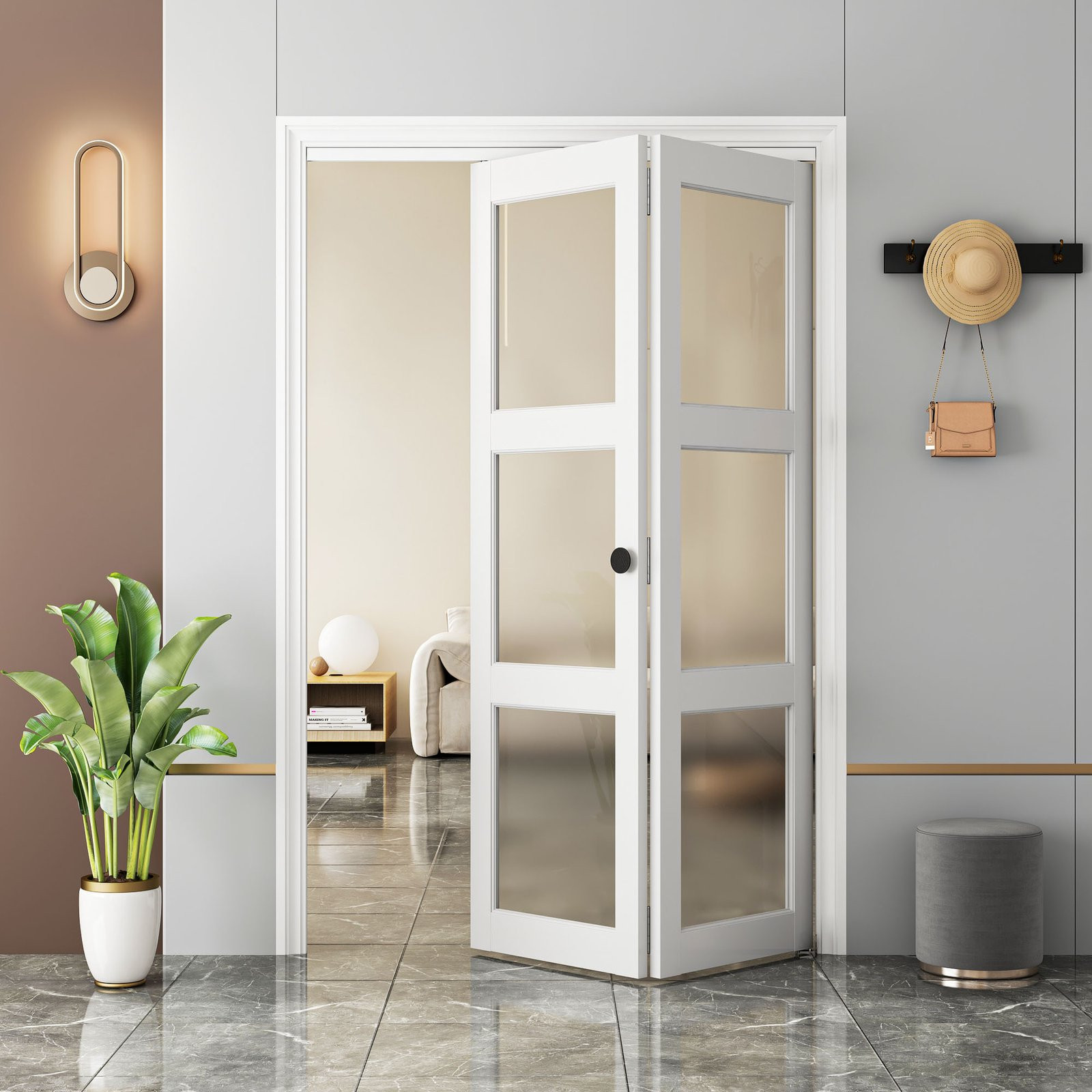 Set of two 78-inch white glass bi-fold door is a stylish addition to any modern home. Crafted from high-quality glass, these doors offer a sleek and elegant look while maximizing natural light in your space. The bi-fold design allows for easy access and flexibility, making them perfect for creating a seamless transition between rooms or closing off areas when needed. With a stunning white finish, they not only enhance the aesthetic appeal but also complement a variety of interior styles. Whether you're renovating or looking to upgrade your living space, this set of doors combines functionality and sophistication effortlessly. Enjoy the blend of contemporary design and practicality with these exceptional bi-fold doors. 78.00-inch h x 36.00-inch w x 0.87-inch d.