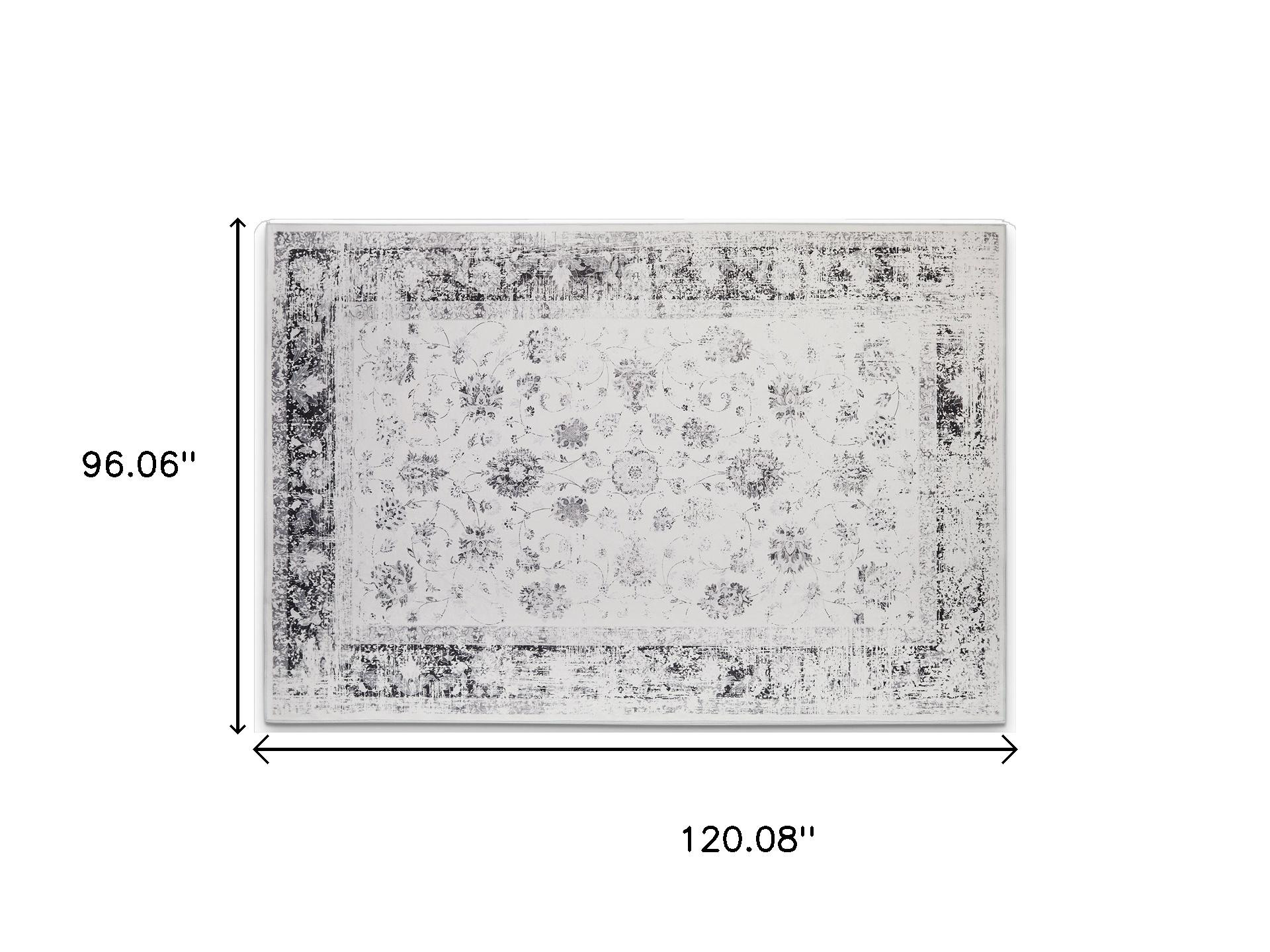 Set an inviting tone in your space with this 8-foot x 10-foot charcoal and ivory floral distressed area rug. Ideal for spaces with kids and pets, this rug is stain resistant to help repel dirt and spilled liquids. Rugs are a great way to showcase your style, hide imperfections, warm your home and reduce noise. This larger sized, traditional styled rug is ready to create a focal point or statement piece in your room. 120.08-inch h x 96.06-inch w x 0.17-inch d.
