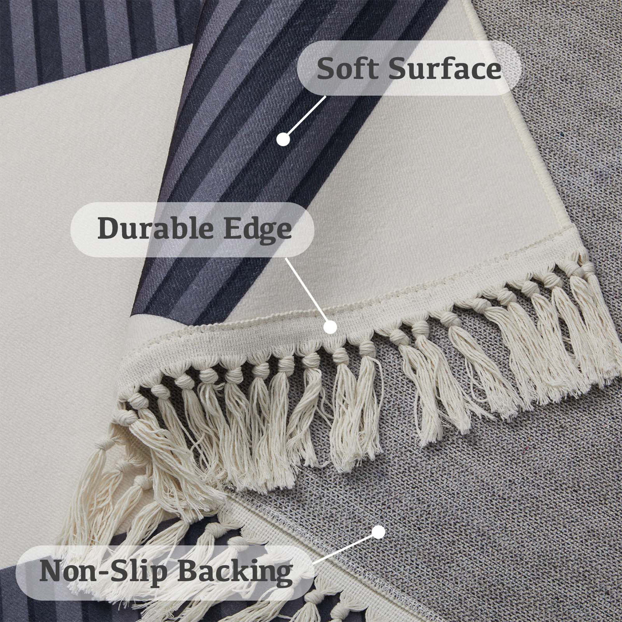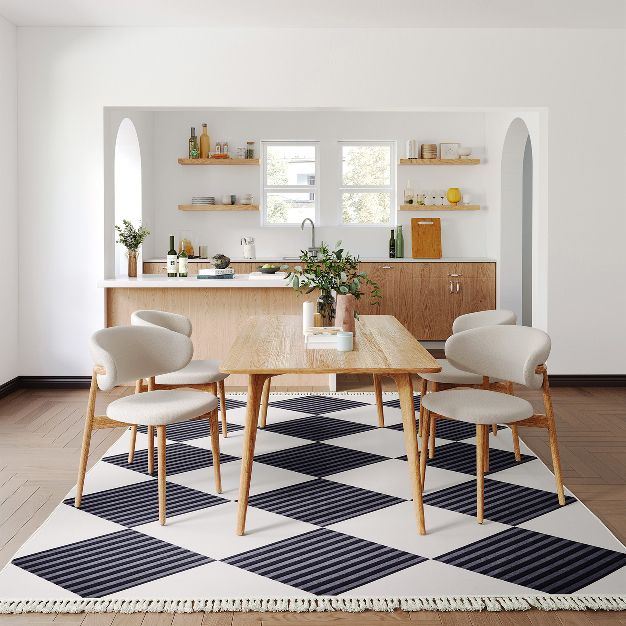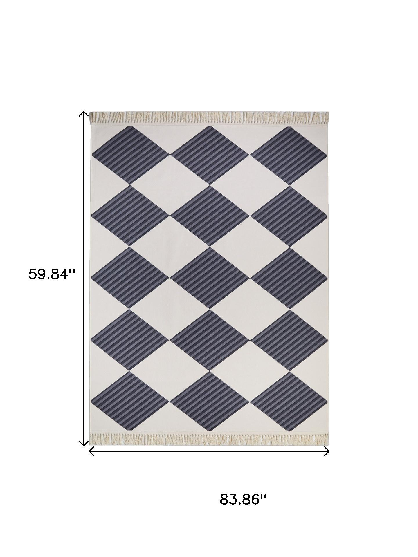Set an inviting tone in your space with this 3-foot x 5-foot white and black diamond area rug with fringe. Ideal for spaces with kids and pets, this rug is stain resistant to help repel dirt and spilled liquids. Rugs are a great way to showcase your style, hide imperfections, warm your home and reduce noise. Tassel ends bring a timeless and fashionable look to your interior. This larger sized, modern and contemporary styled rug is ready to create a focal point or statement piece in your room. 59.84-inch h x 83.86-inch w x 0.17-inch d.