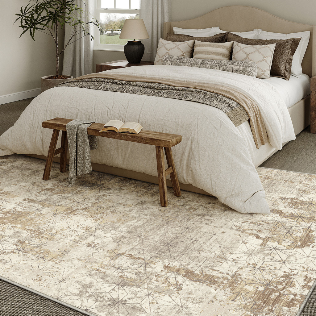 Add some artistry to your room with this 8-foot x 10-foot gold brown and ivory abstract washable area rug. Ideal for spaces with kids and pets, this rug is stain resistant to help repel dirt and spilled liquids. Built to last, this rug crafted from polyester fibers is known for its durability and long lasting appeal. Rugs are a great way to showcase your style, hide imperfections, warm your home and reduce noise. This larger sized, modern styled rug is ready to create a focal point or statement piece in your room. 120.00-inch h x 96.00-inch w x 0.30-inch d.