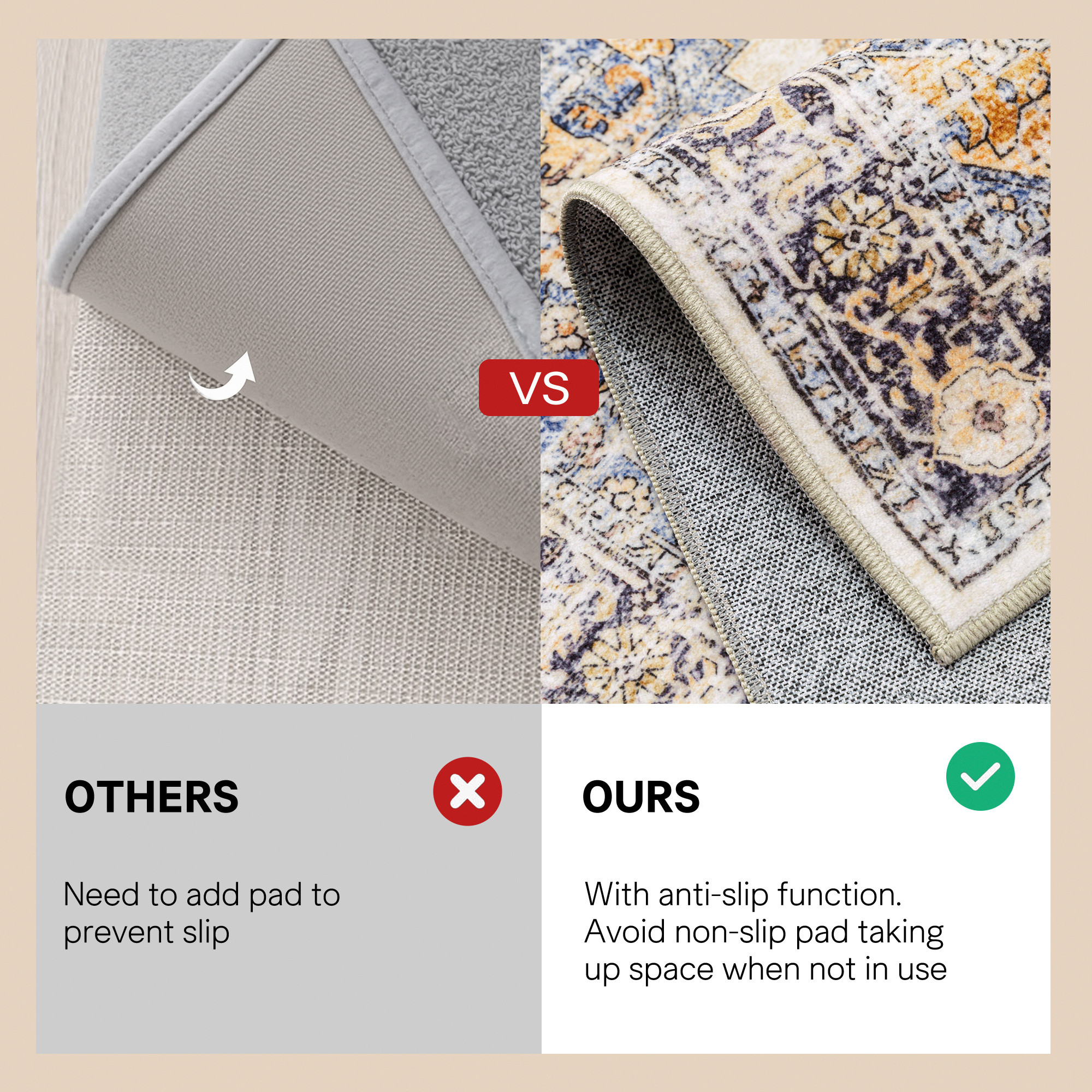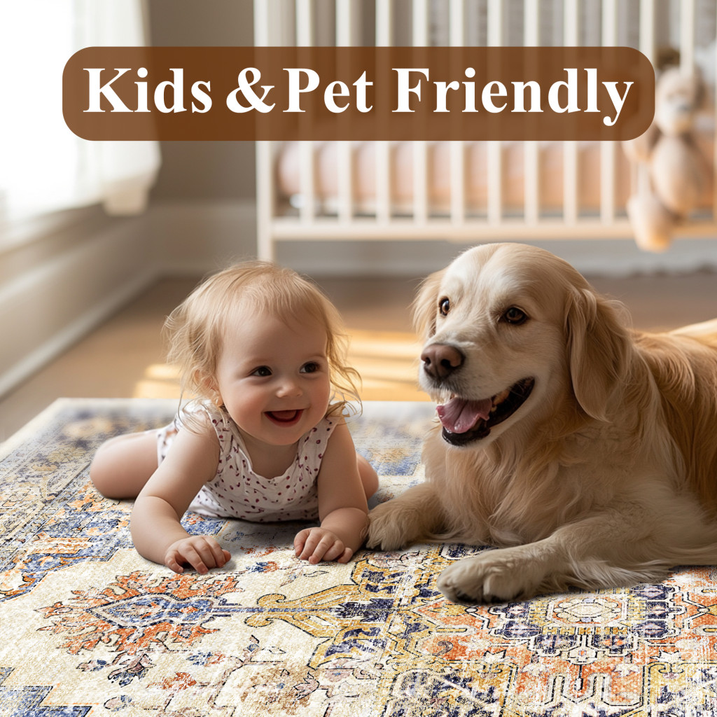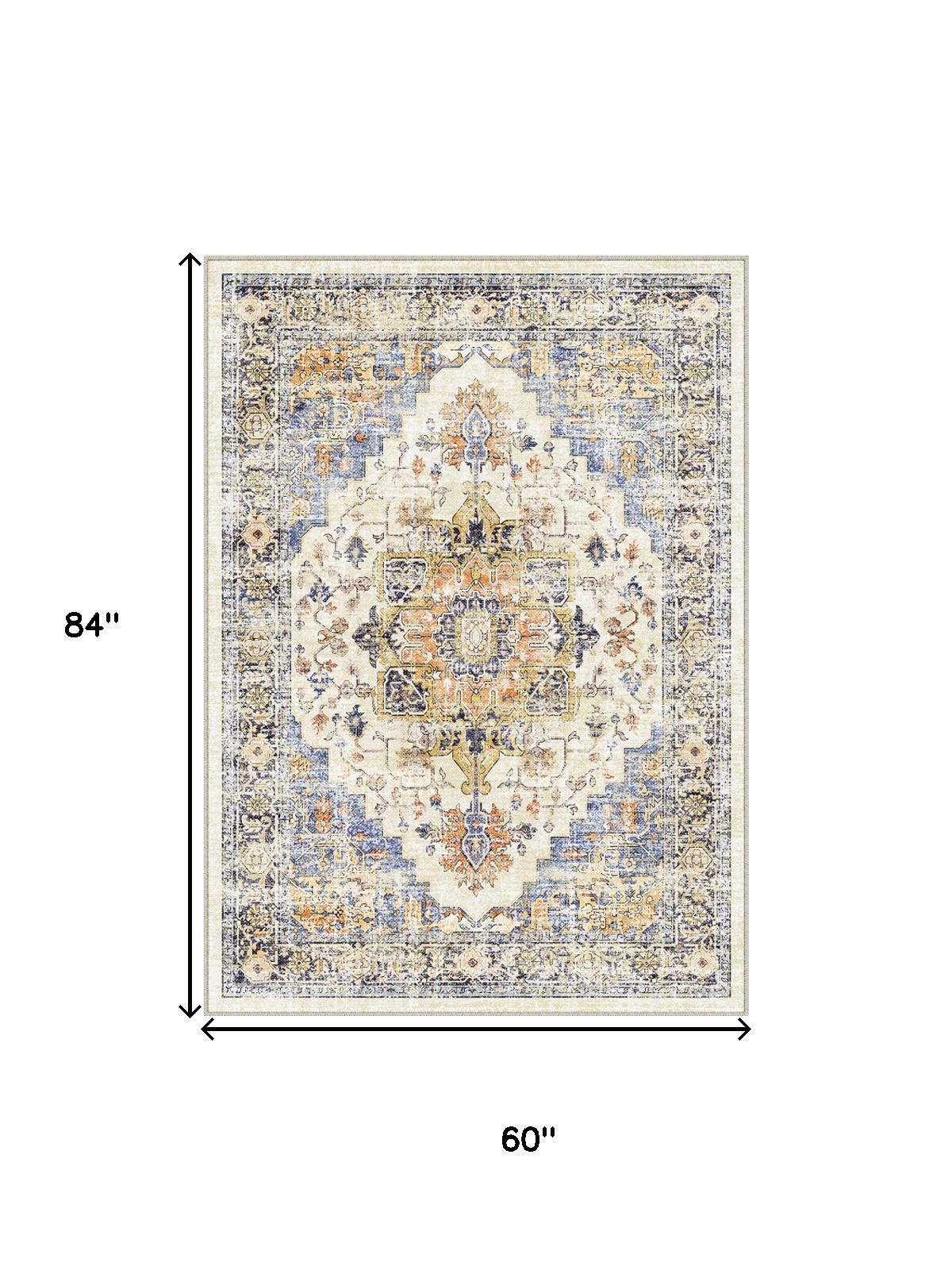 Add great coloration and comfortable texture to your space with this 5-foot x 7-foot ivory blue and orange medallion washable area rug. Ideal for spaces with kids and pets, this rug is stain resistant to help repel dirt and spilled liquids. Built to last, this rug crafted from polyester fibers is known for its durability and long lasting appeal. Rugs are a great way to showcase your style, hide imperfections, warm your home and reduce noise. This larger sized, persian styled rug is ready to create a focal point or statement piece in your room. 84.00-inch h x 60.00-inch w x 0.30-inch d.