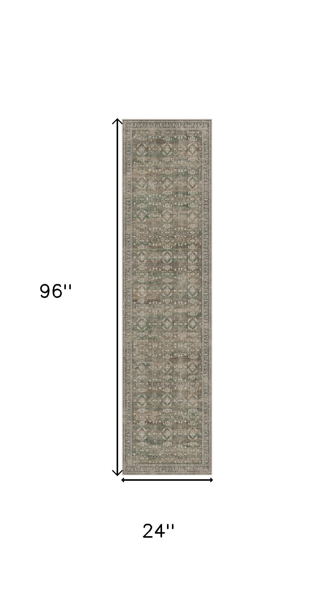 Add great coloration and comfortable texture to your space with this 8-foot brown ivory and green floral medallion distressed washable runner rug. Ideal for spaces with kids and pets, this rug is stain resistant to help repel dirt and spilled liquids. Built to last, this rug crafted from polyester fibers is known for its durability and long lasting appeal. Rugs are a great way to showcase your style, hide imperfections, warm your home and reduce noise. This larger sized, traditional styled rug is ready to create a focal point or statement piece in your room. This traditional style runner makes a great accent for the hallway, in front of cabinets, in the laundry room, or any other space you need a narrow and long rug. 96.00-inch h x 24.00-inch w x 0.30-inch d.