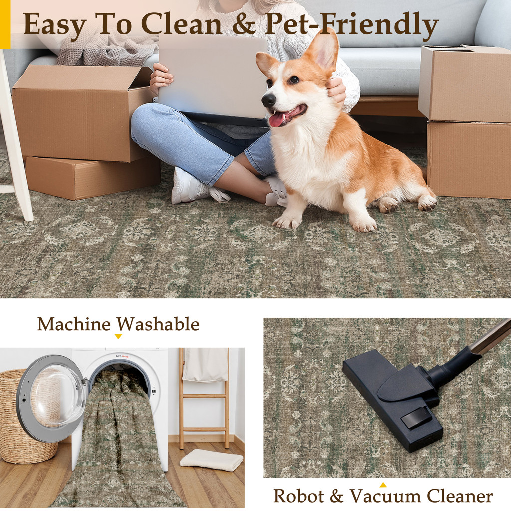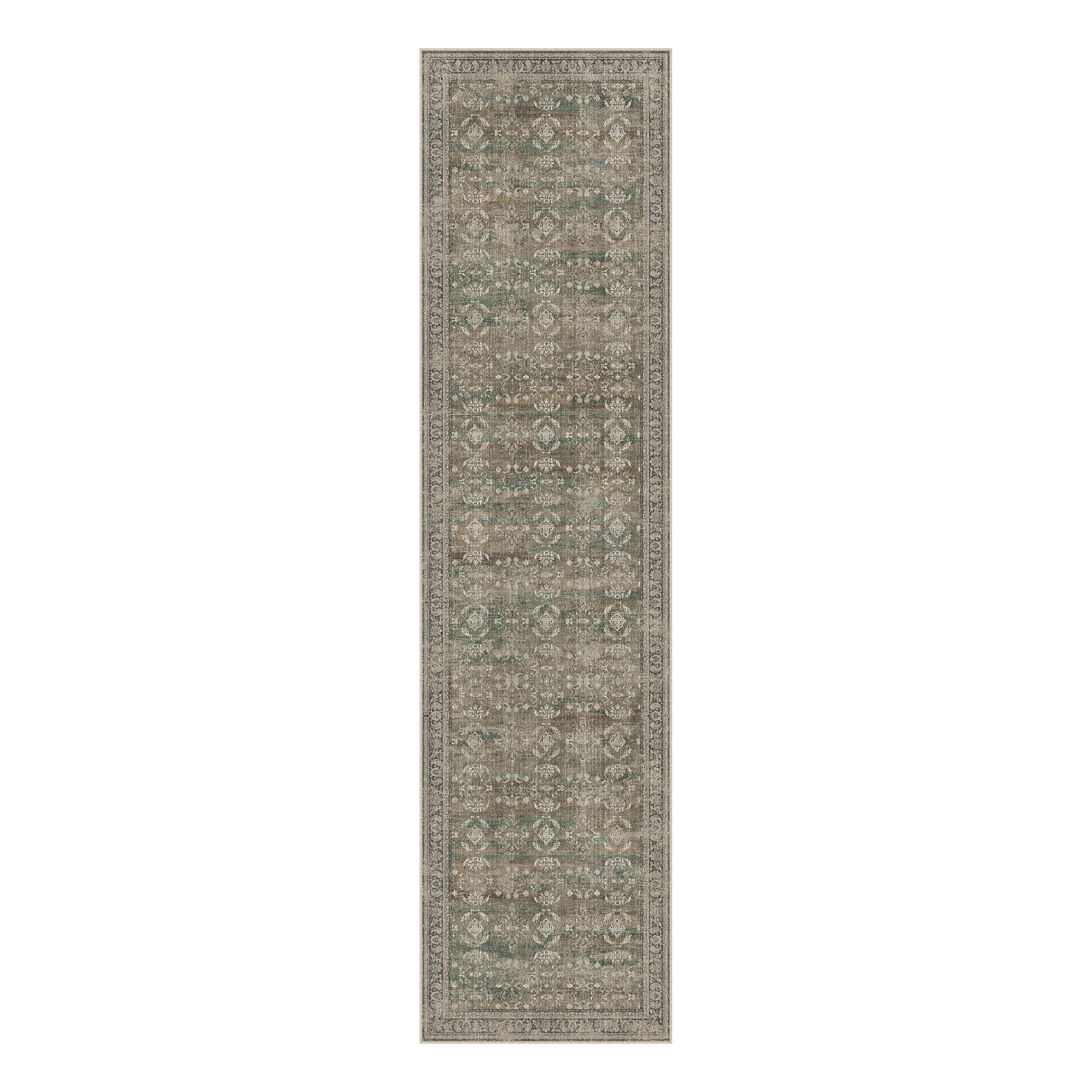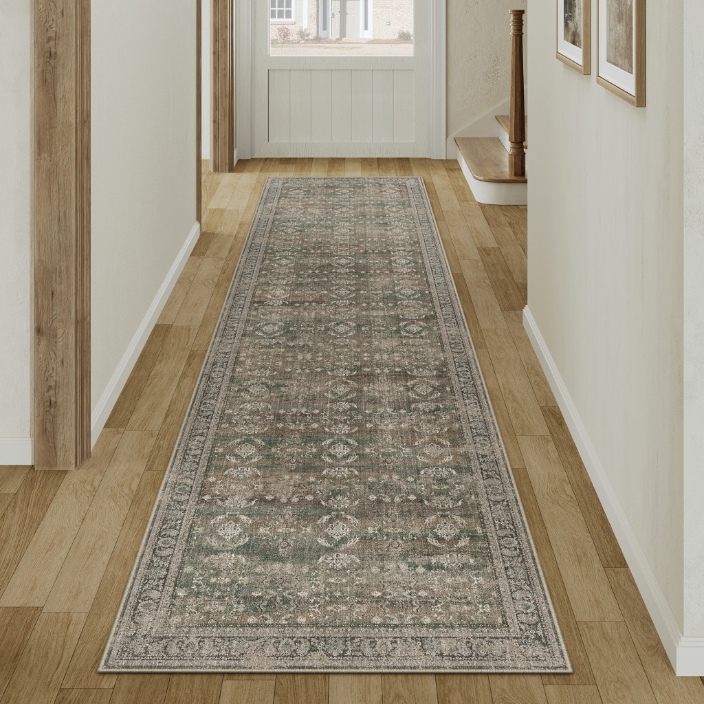 medallion distressed washable runner rug, distressed washable runner rug, washable runner rug, floral medallion distressed washable runner, brown ivory green floral |