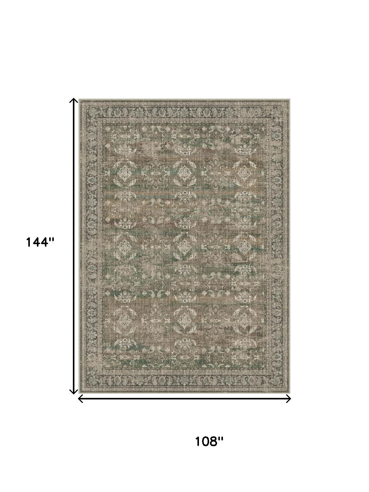 Add great coloration and comfortable texture to your space with this 9-foot x 12-foot brown ivory and green floral medallion distressed washable area rug. Ideal for spaces with kids and pets, this rug is stain resistant to help repel dirt and spilled liquids. Built to last, this rug crafted from polyester fibers is known for its durability and long lasting appeal. Rugs are a great way to showcase your style, hide imperfections, warm your home and reduce noise. This larger sized, traditional styled rug is ready to create a focal point or statement piece in your room. 144.00-inch h x 108.00-inch w x 0.30-inch d.