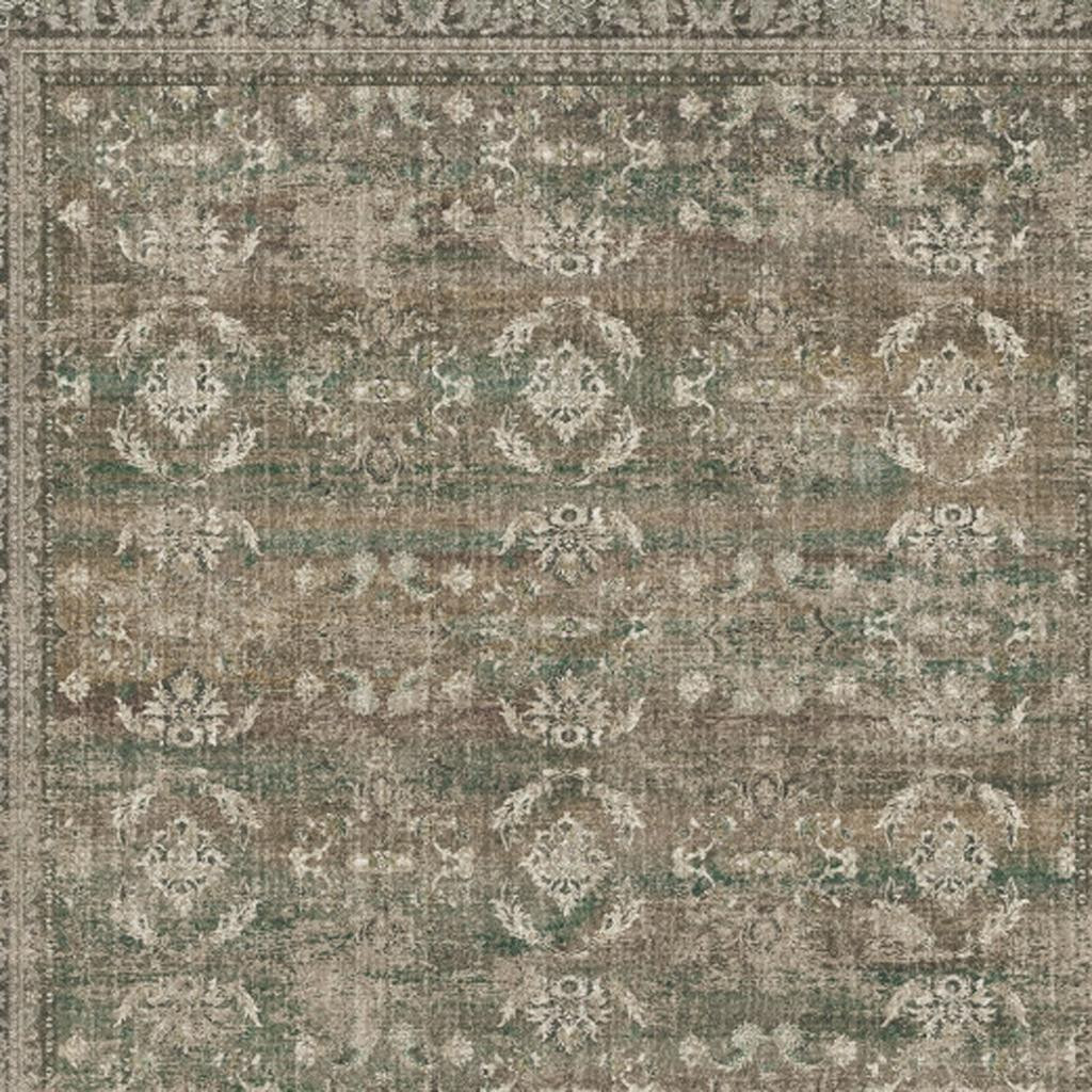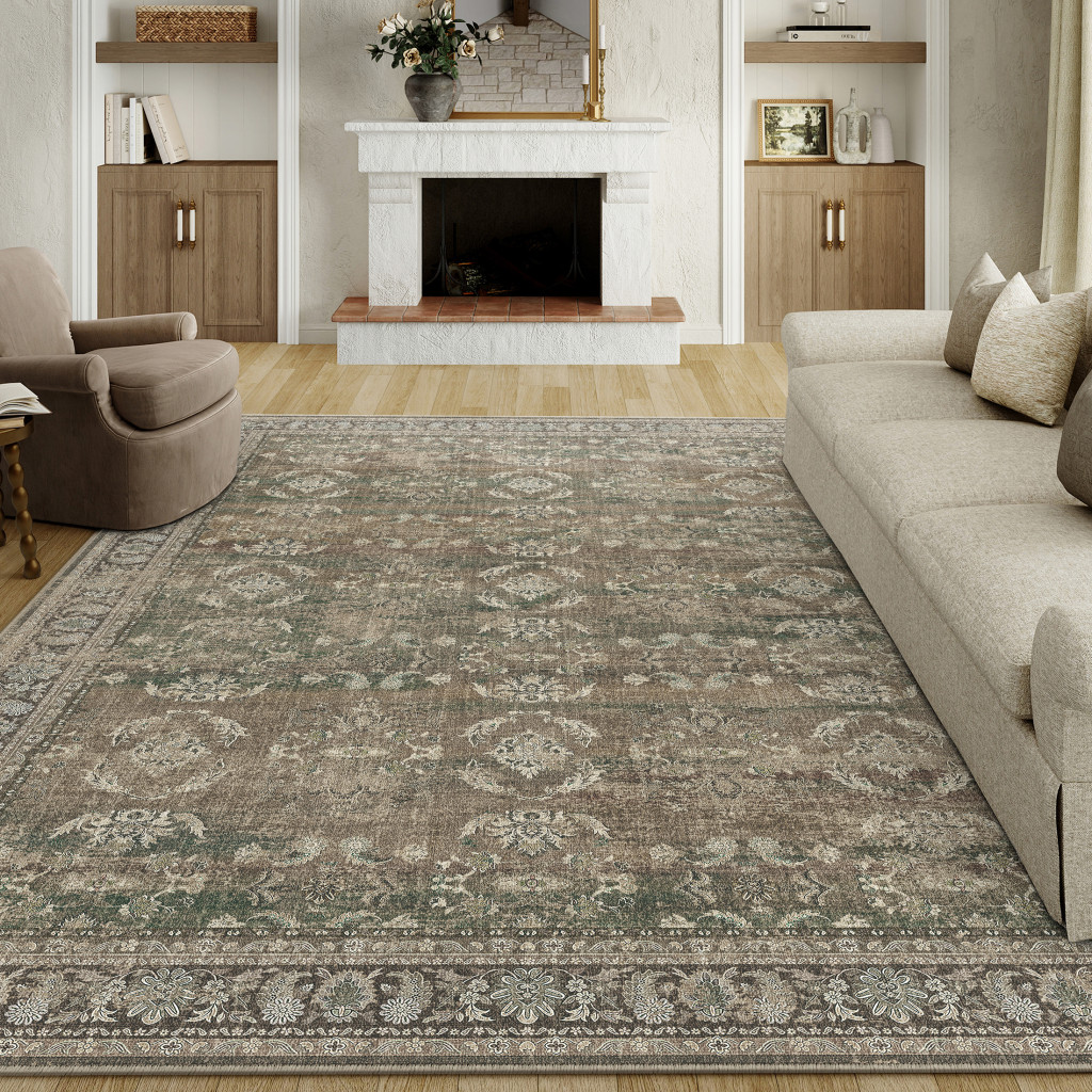 medallion distressed washable area rug, distressed washable area rug, washable area rug, 9' X 12' brown ivory green floral, ivory green floral medallion distressed |