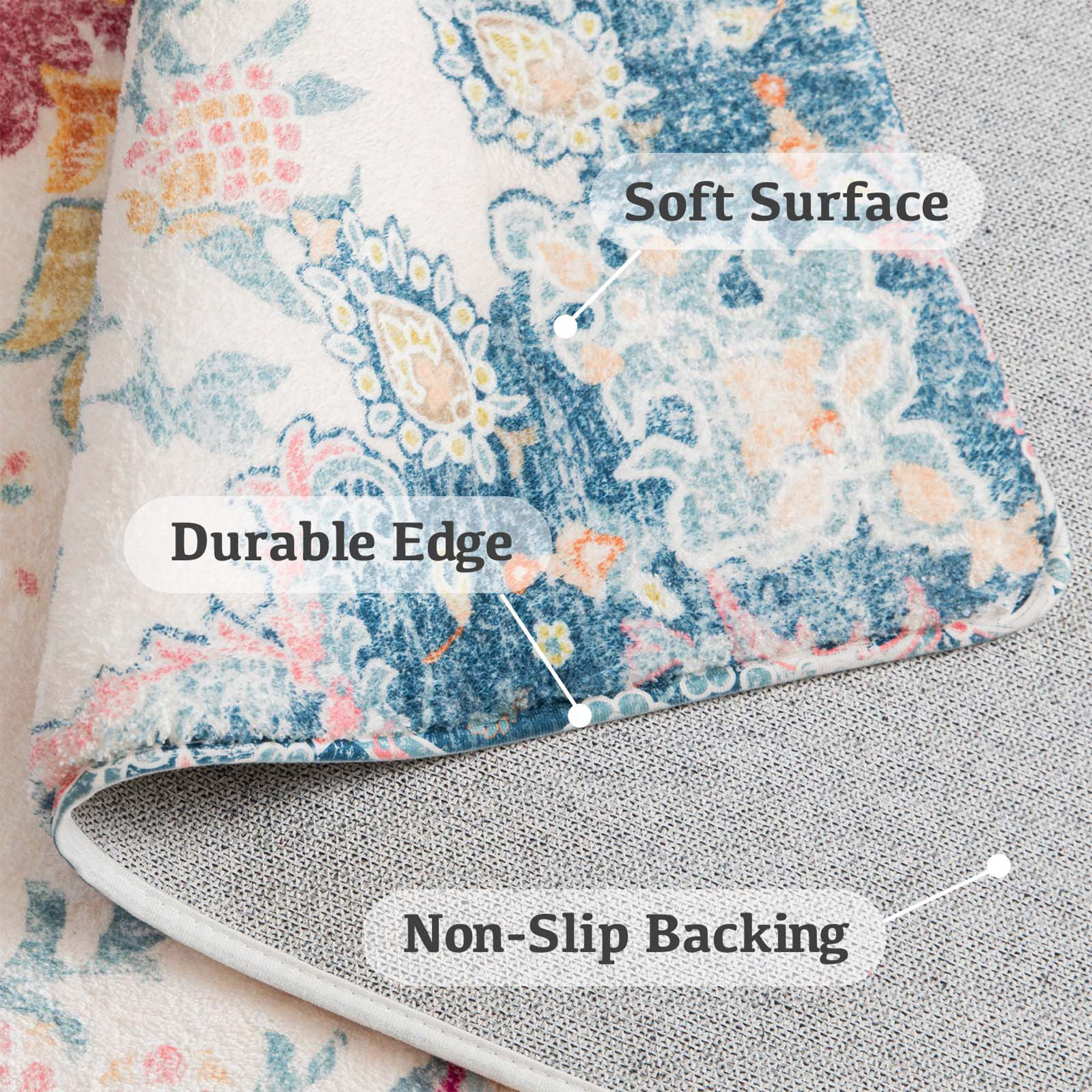 Add some artistry to your room with this 5-foot x 7-foot ivory pink and blue medallion distressed washable area rug. Ideal for spaces with kids and pets, this rug is stain resistant to help repel dirt and spilled liquids. Built to last, this rug crafted from polyester fibers is known for its durability and long lasting appeal. Rugs are a great way to showcase your style, hide imperfections, warm your home and reduce noise. This larger sized, traditional styled rug is ready to create a focal point or statement piece in your room. 62.99-inch h x 87.01-inch w x 0.17-inch d.