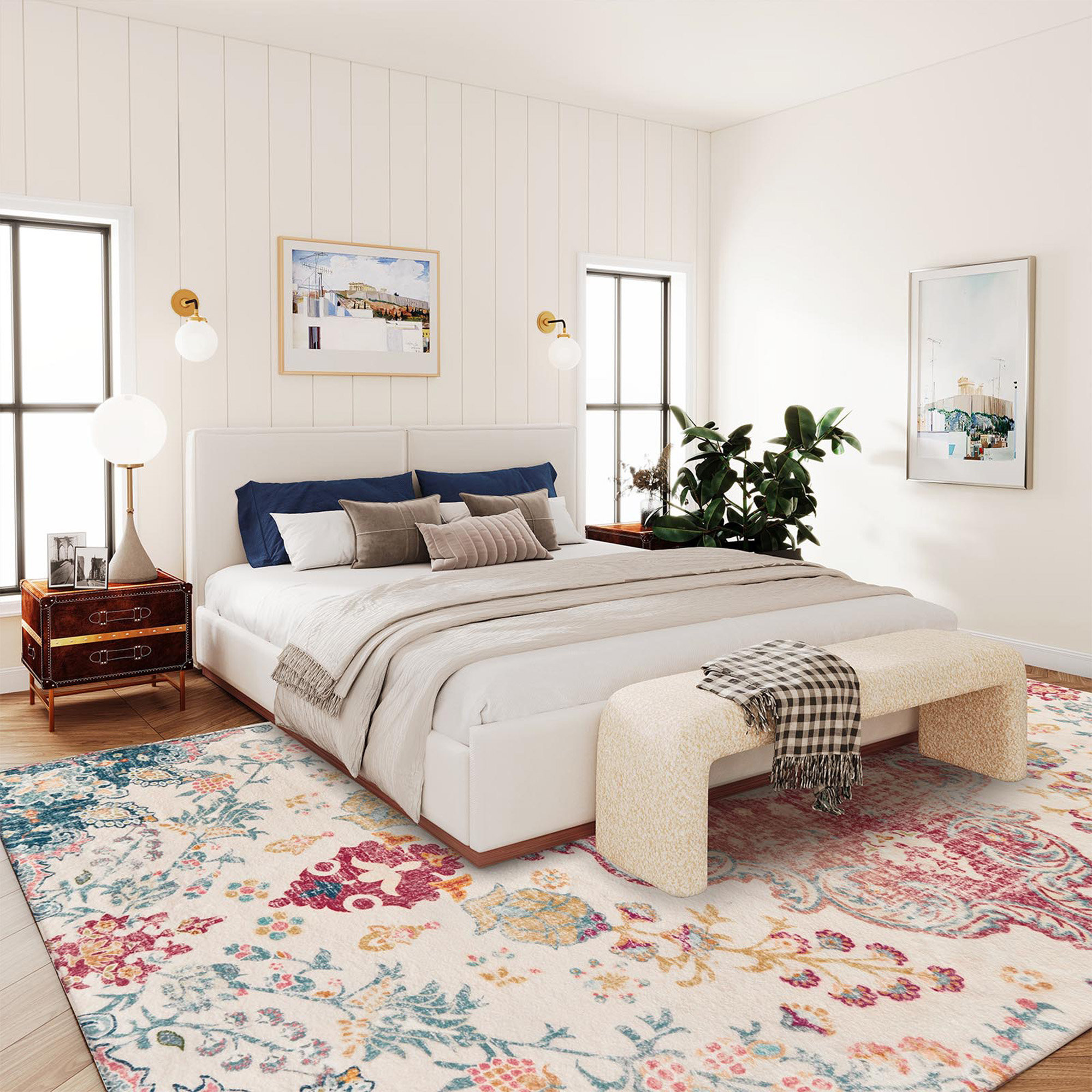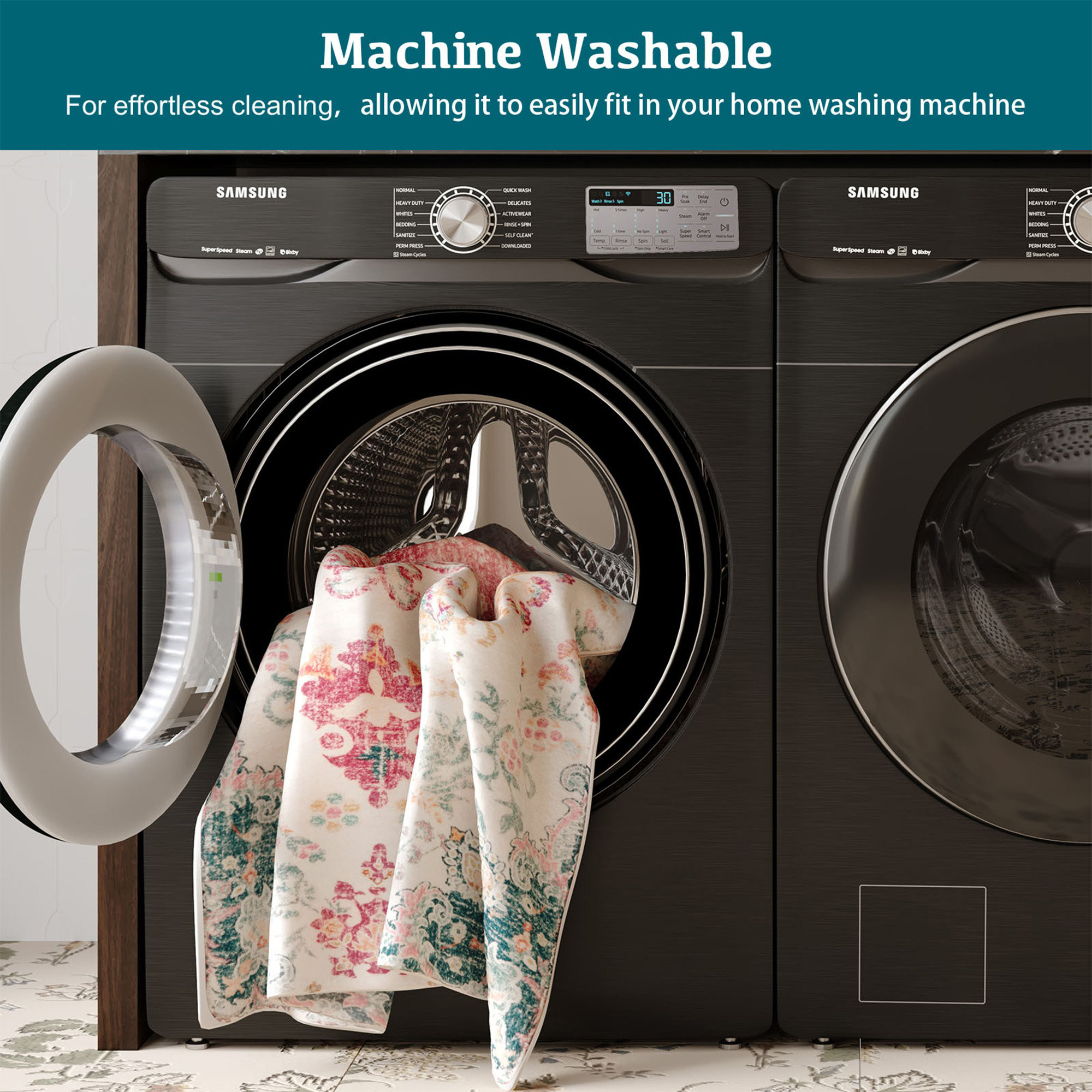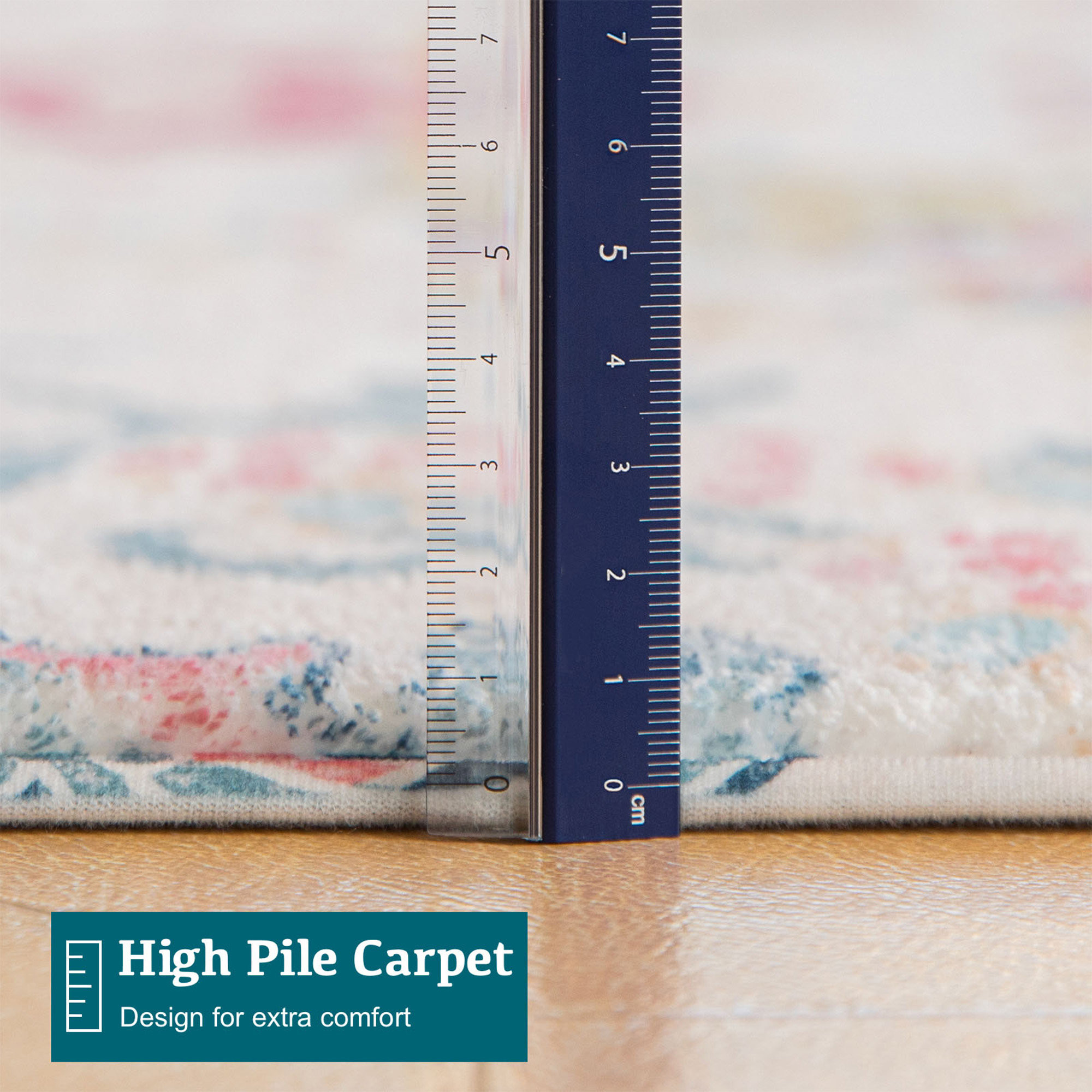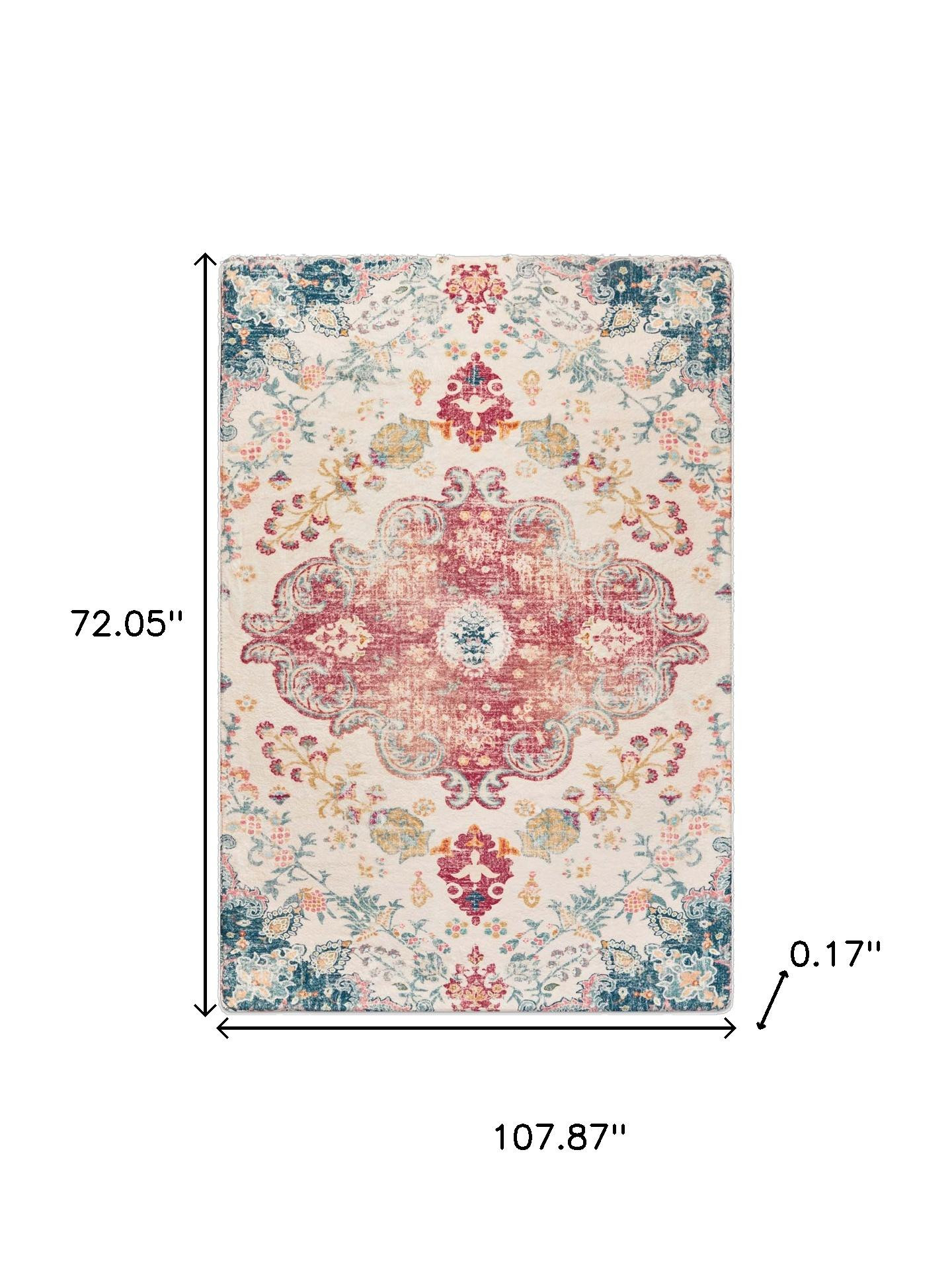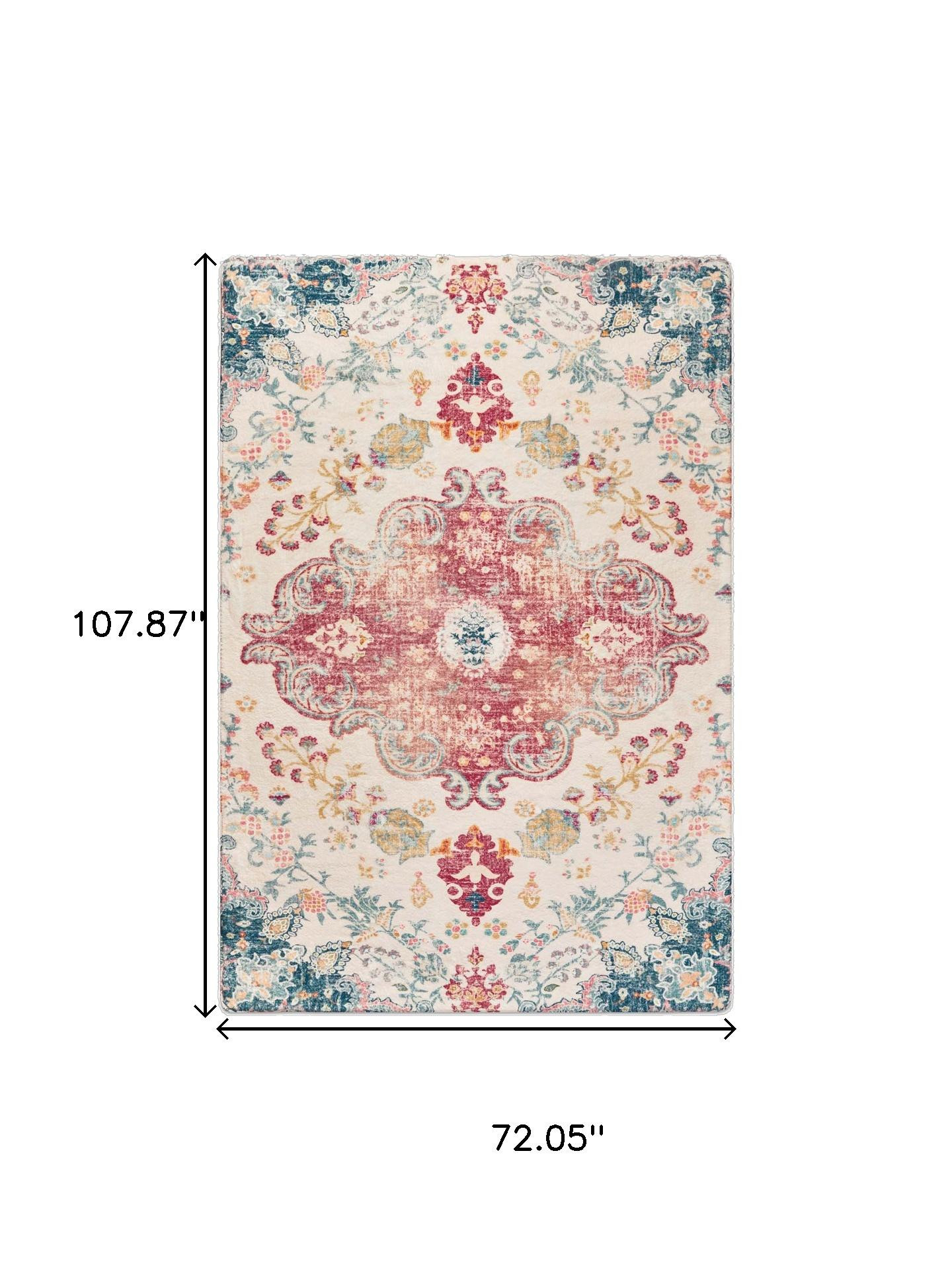 This 6-foot x 9-foot ivory pink and blue medallion distressed washable area rug, is a great way to add warmth to a room. Ideal for spaces with kids and pets, this rug is stain resistant to help repel dirt and spilled liquids. Built to last, this rug crafted from polyester fibers is known for its durability and long lasting appeal. Rugs are a great way to showcase your style, hide imperfections, warm your home and reduce noise. This larger sized, traditional styled rug is ready to create a focal point or statement piece in your room. 72.05-inch h x 107.87-inch w x 0.17-inch d.