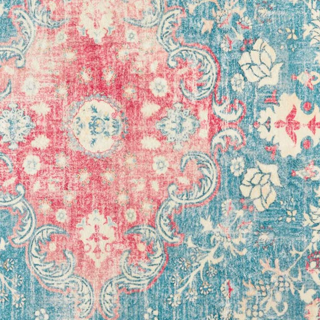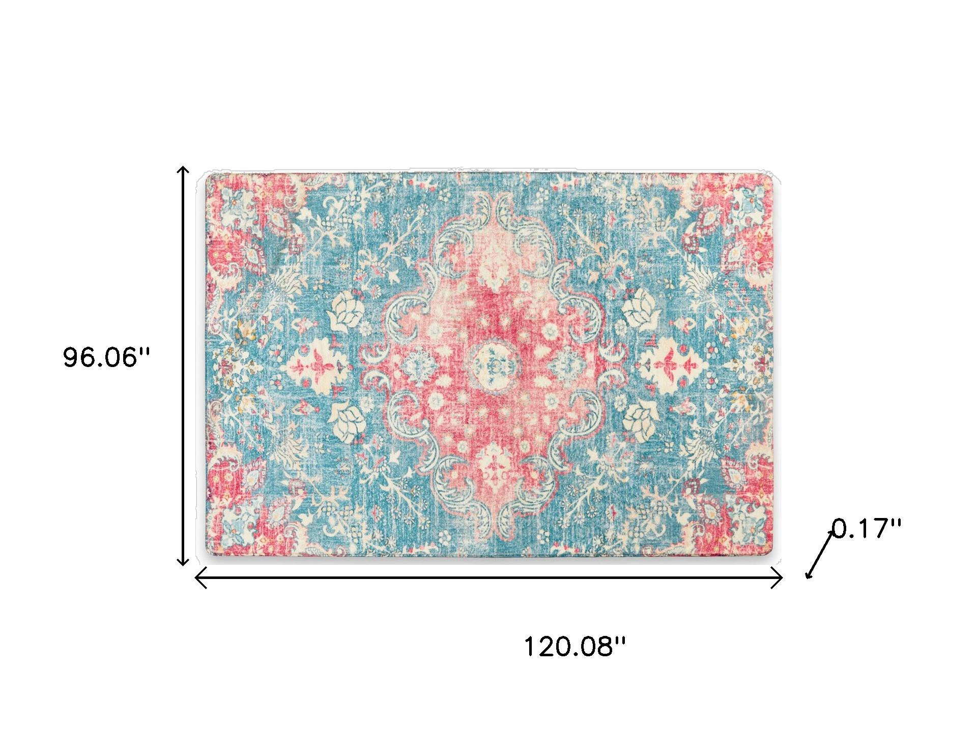 Add some artistry to your room with this 8-foot x 10-foot ivory pink and aqua medallion distressed washable area rug. Ideal for spaces with kids and pets, this rug is stain resistant to help repel dirt and spilled liquids. Built to last, this rug crafted from polyester fibers is known for its durability and long lasting appeal. Rugs are a great way to showcase your style, hide imperfections, warm your home and reduce noise. This larger sized, traditional styled rug is ready to create a focal point or statement piece in your room. 96.06-inch h x 120.08-inch w x 0.17-inch d.