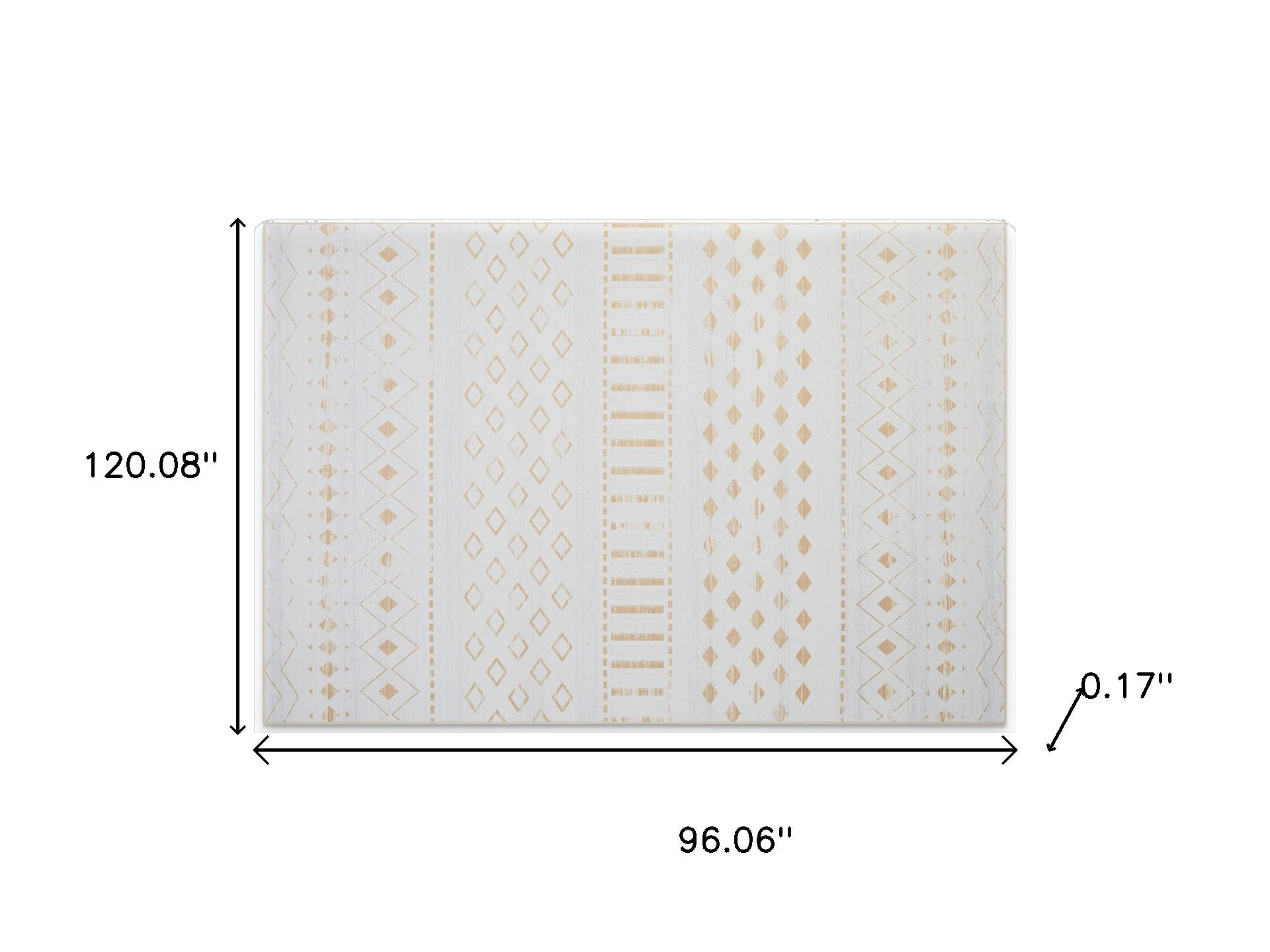Add some artistry to your room with this 8-foot x 10-foot gold and white abstract geometric washable area rug. Ideal for spaces with kids and pets, this rug is stain resistant to help repel dirt and spilled liquids. Rugs are a great way to showcase your style, hide imperfections, warm your home and reduce noise. This larger sized, casual styled rug is ready to create a focal point or statement piece in your room. 120.08-inch h x 96.06-inch w x 0.17-inch d.